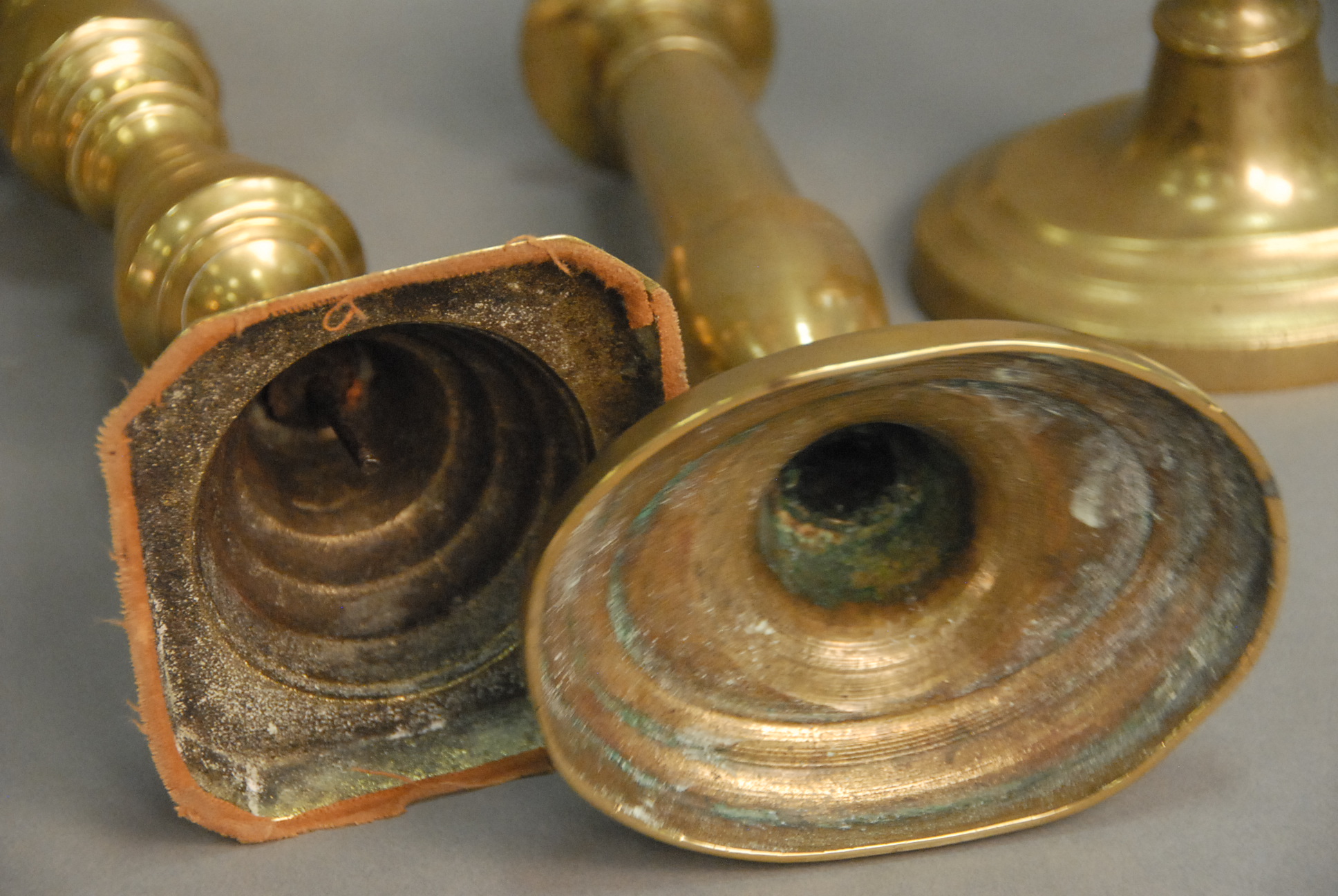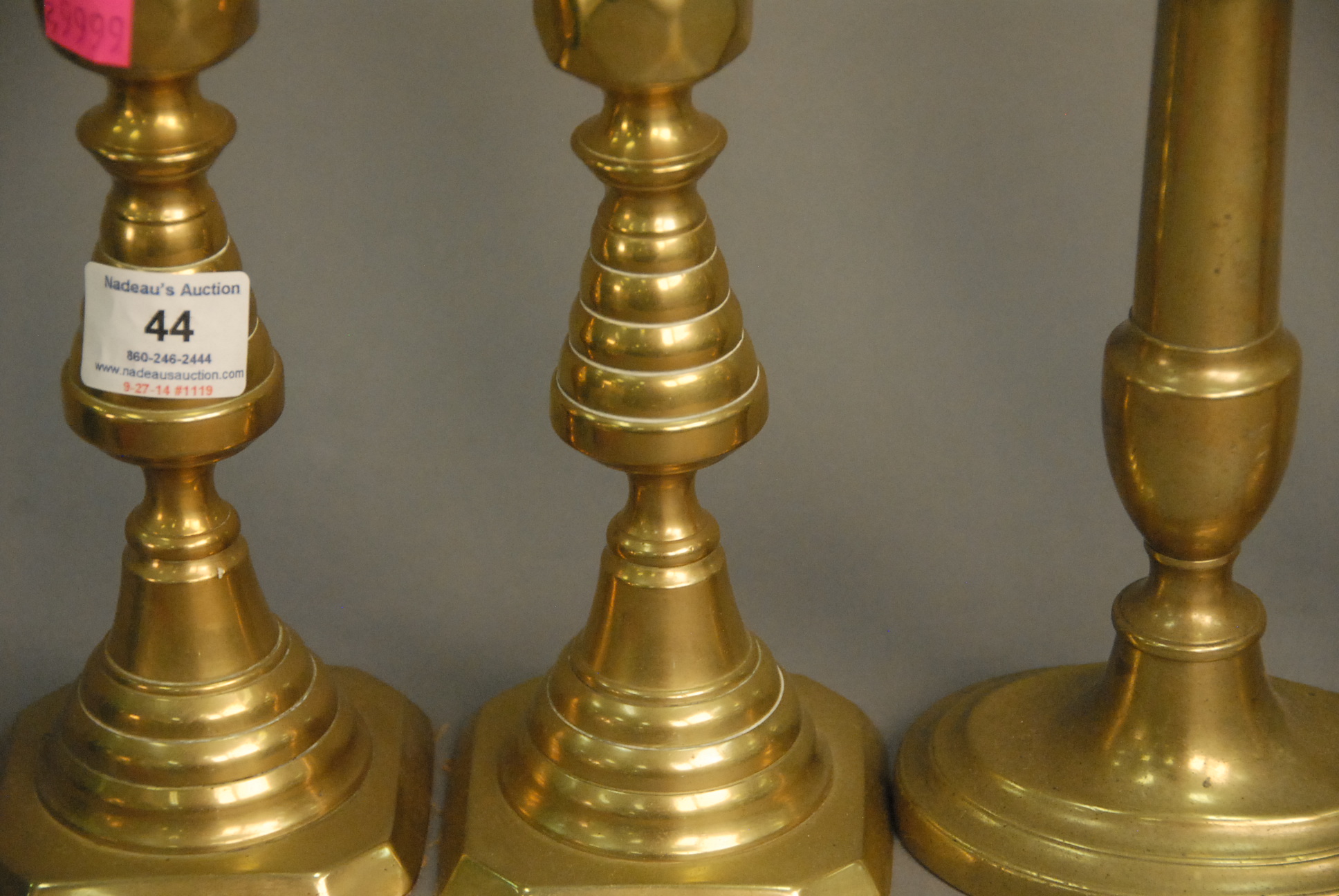 Two pairs of early brass push up candlesticks.ht. 9 in. & 11 in.