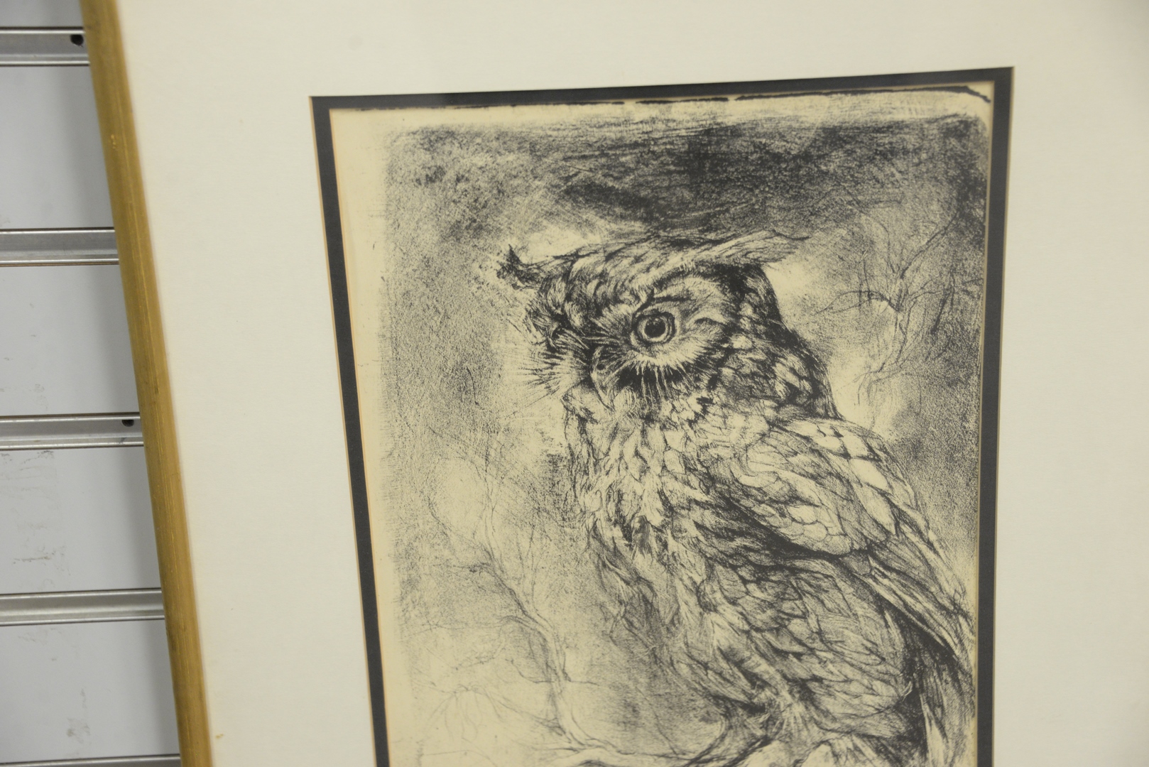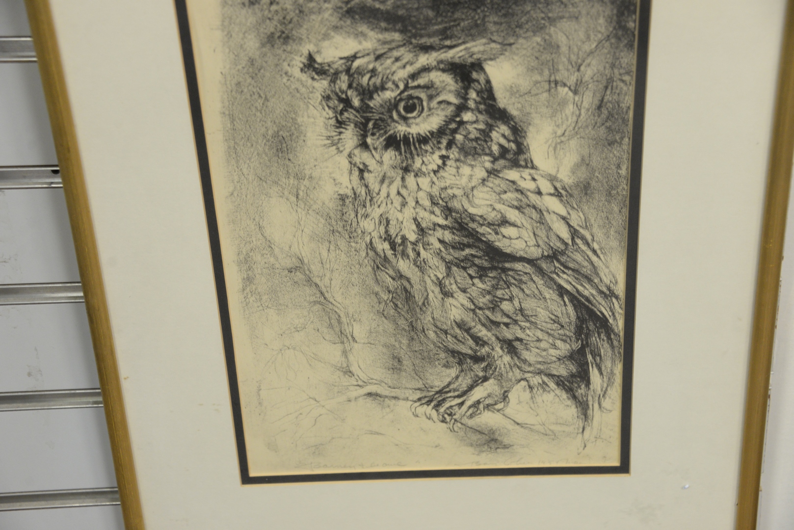 Lot 44: Two Piece Group, to include one etching by Nicholas de Jesus, signed faintly lower right, along with a lithograph of an owl, signed lower right Barry Cohen, image 6 1/4″ x 10 3/4″ and 11 3/4″ x 9″. Provenance: The Estate of Alan Gans, Mulberry Point,