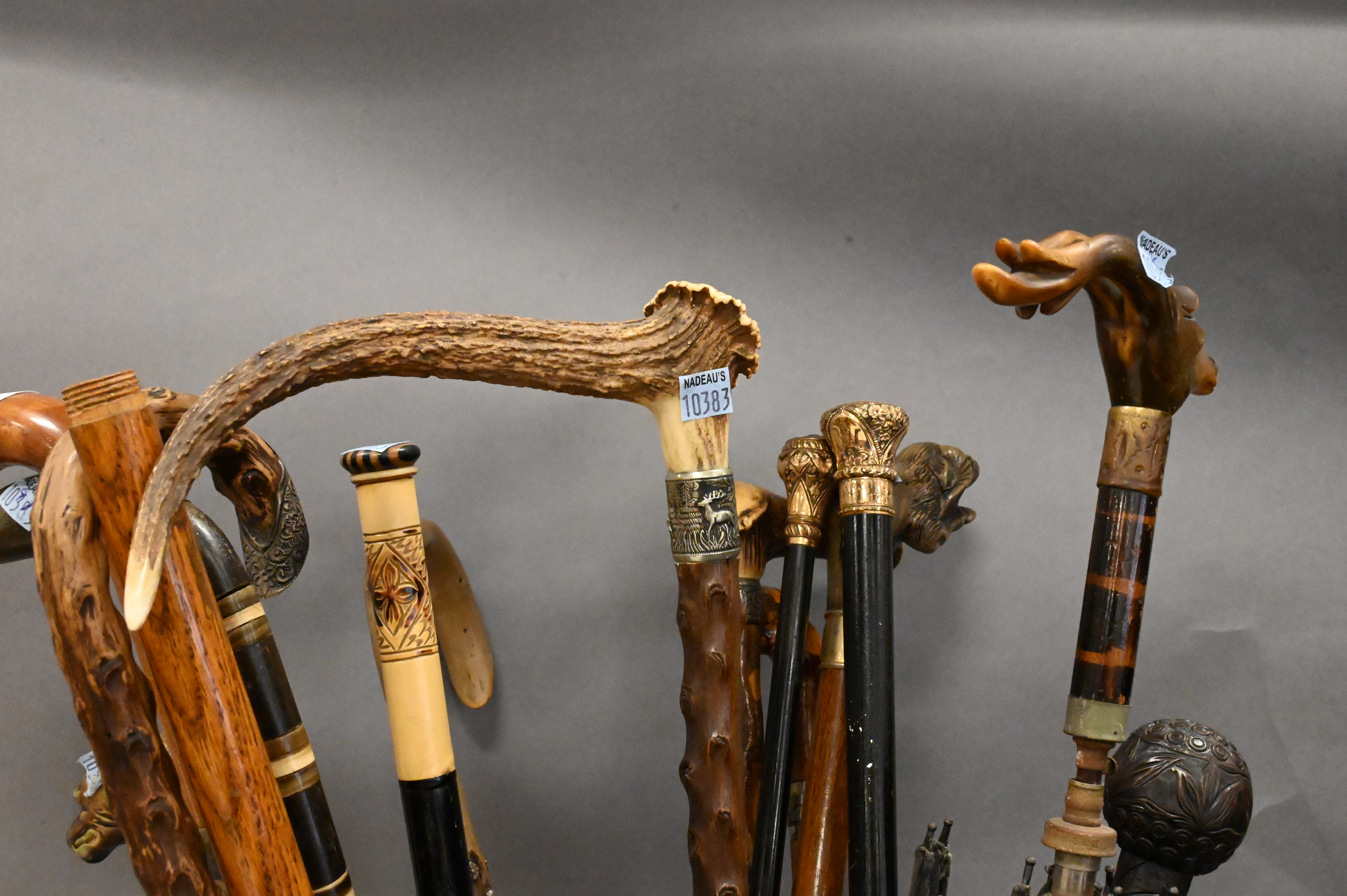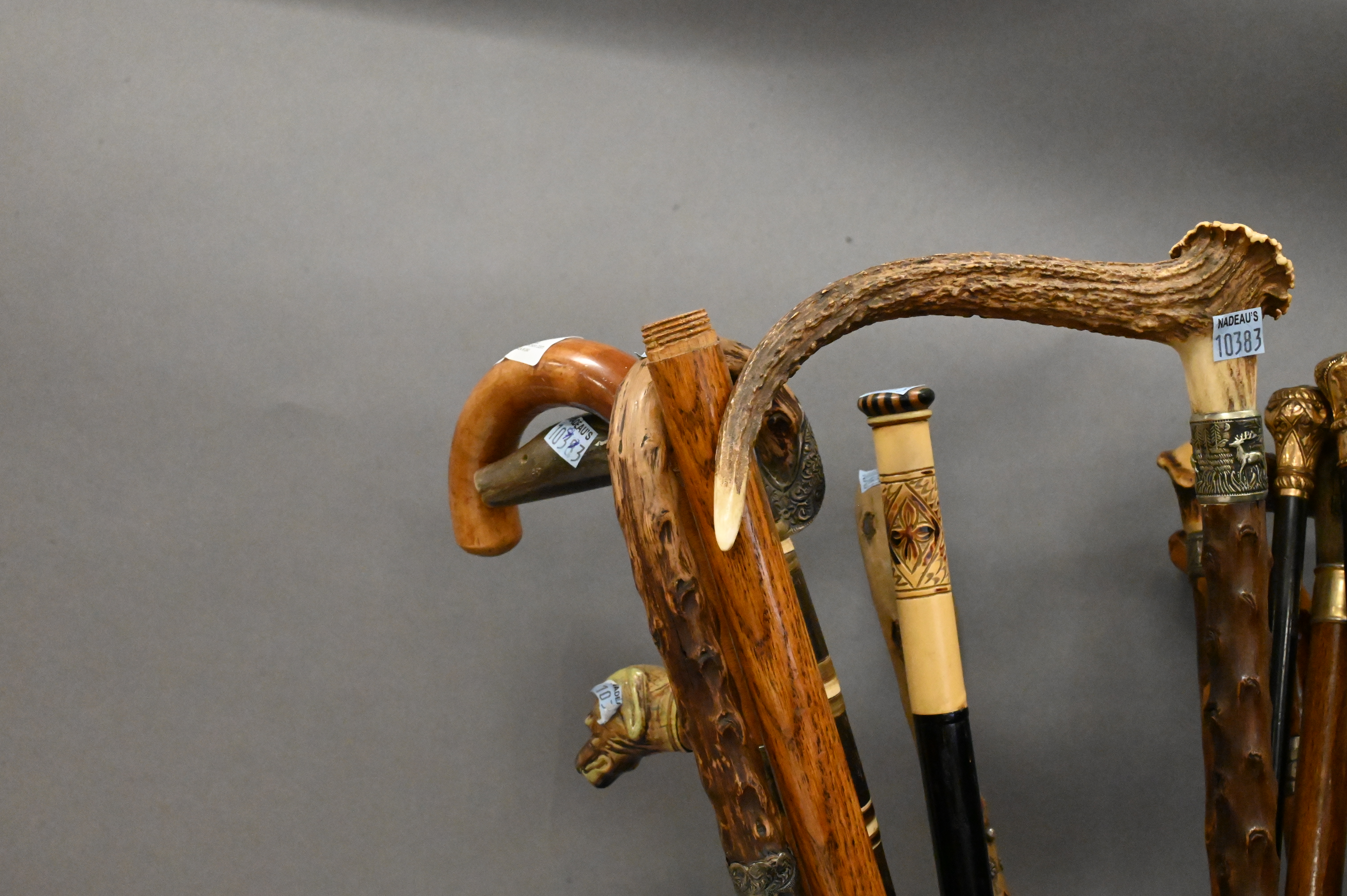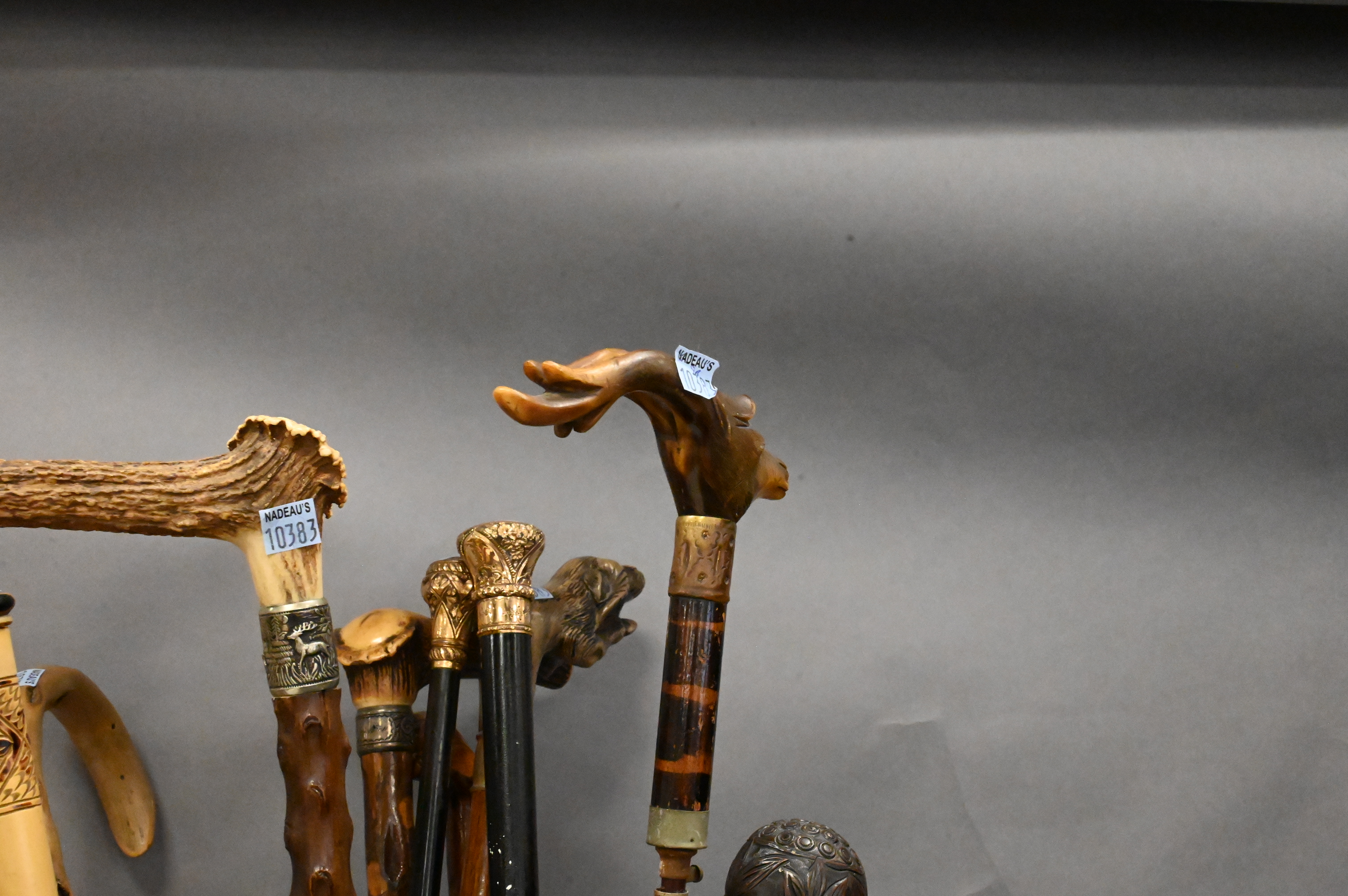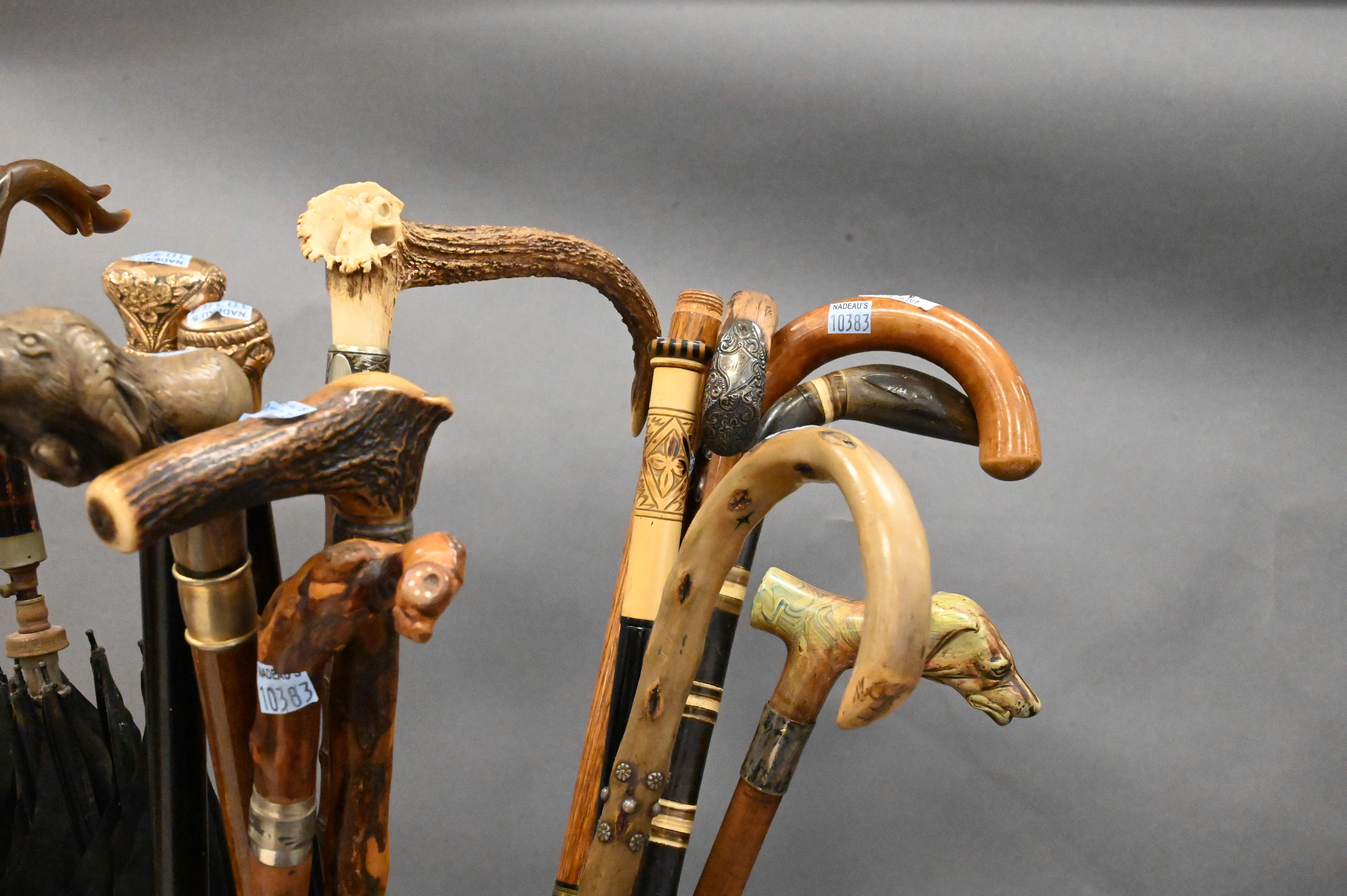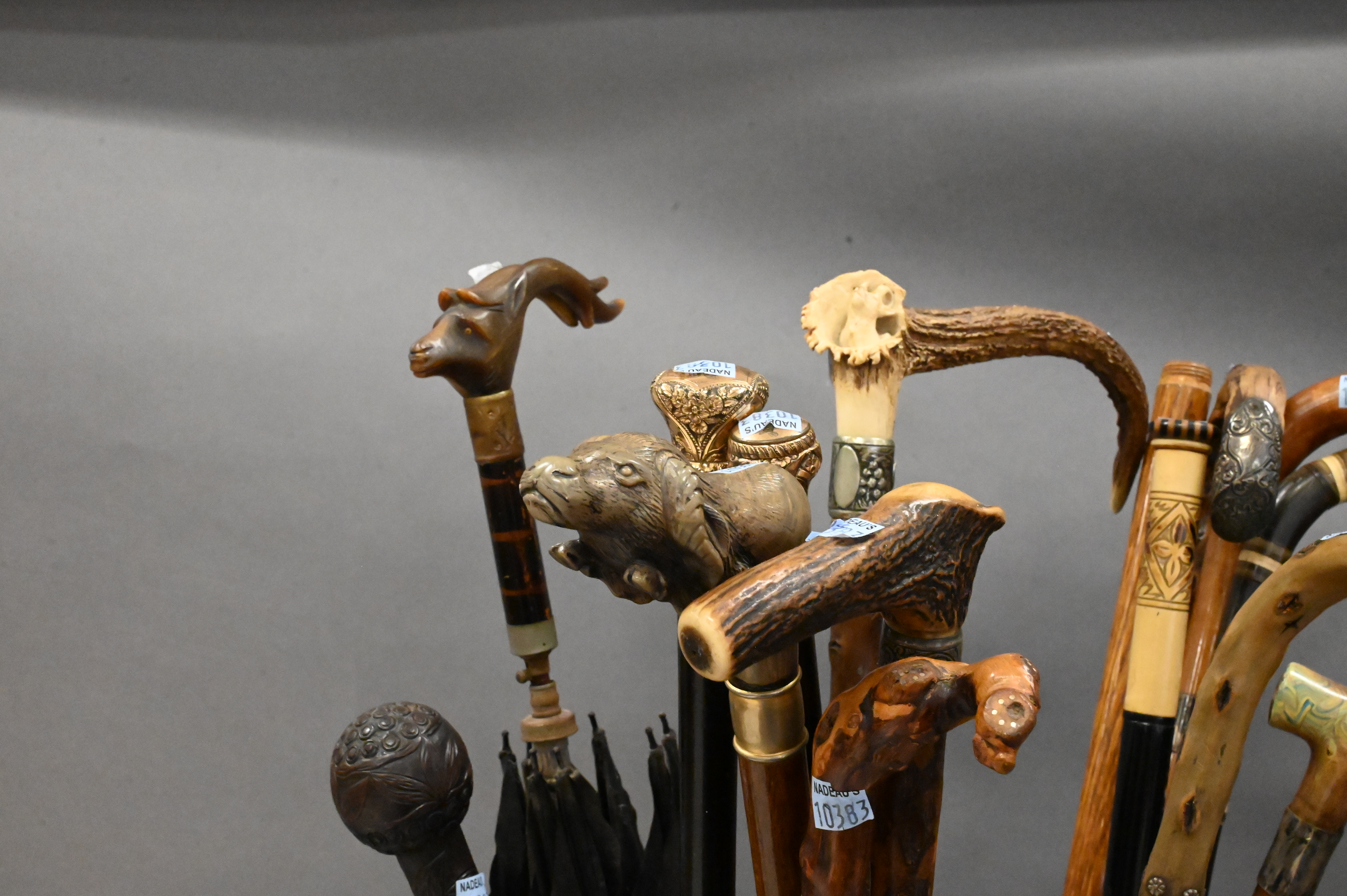 to include one umbrella, 14 canes, some having animal tops, in majolica umbrella stand