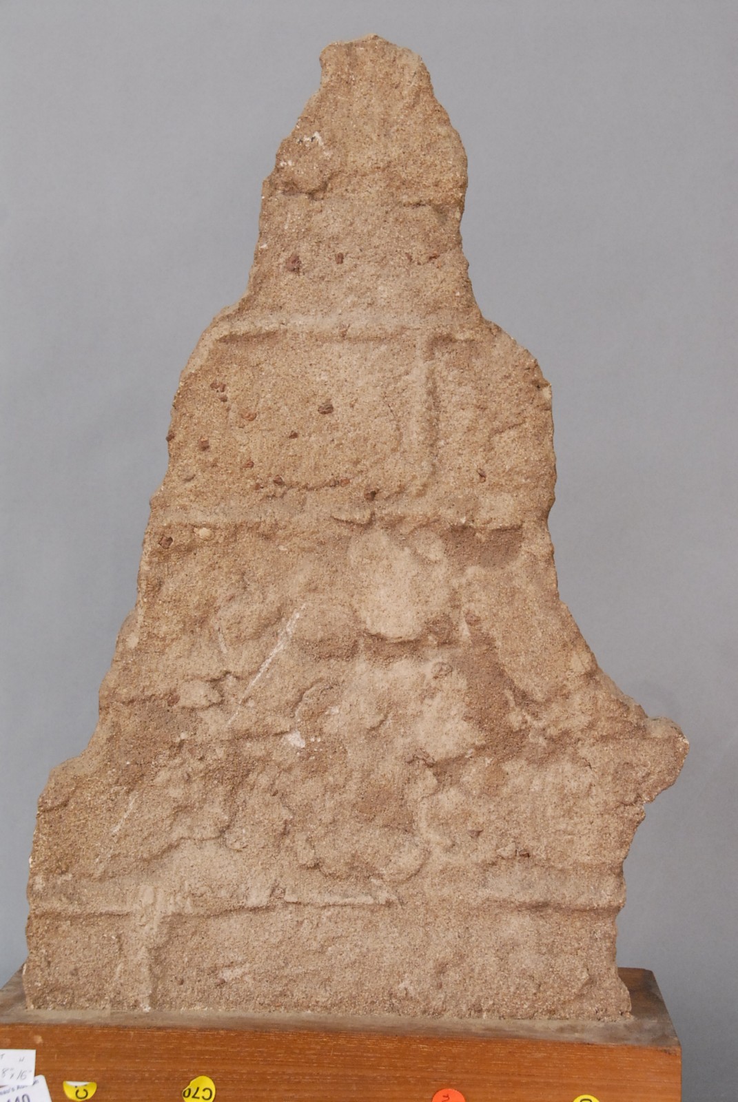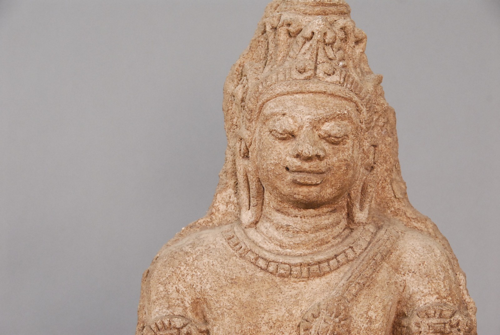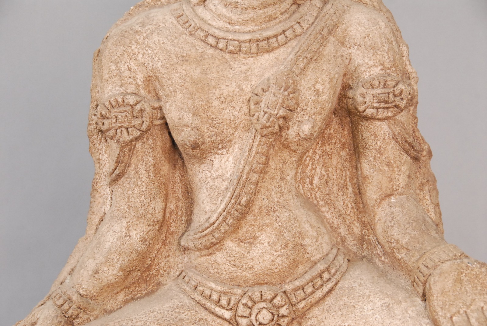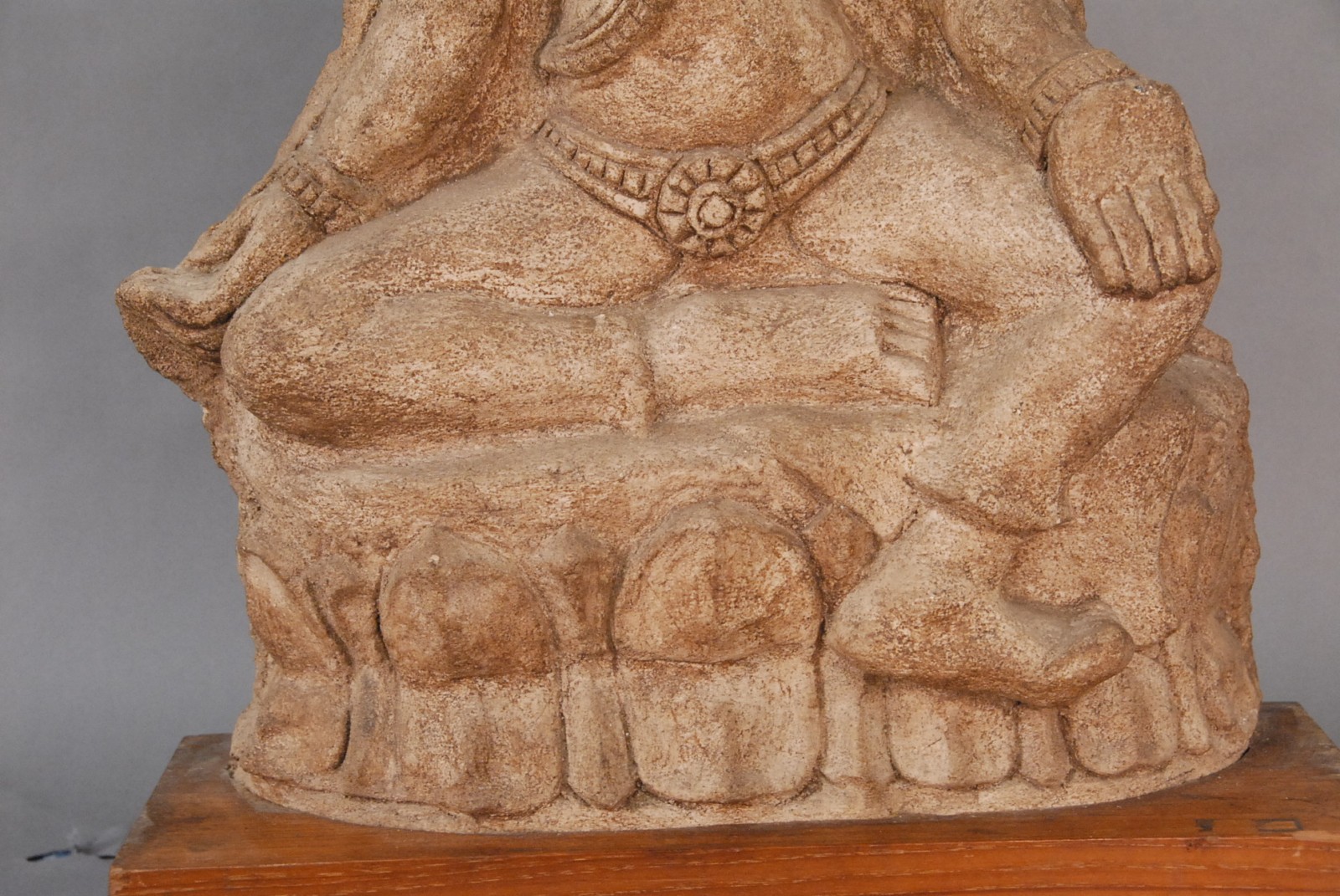 Asian sand stone seated deity, possibly Indian, on wood base, 19th century or older.