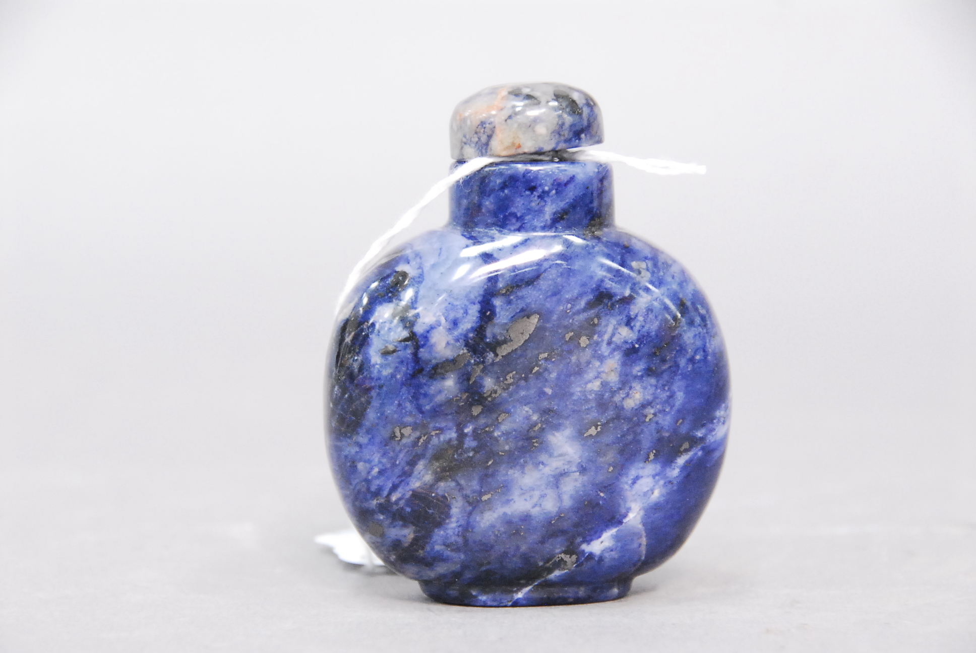 Lot 440: Carved blue rutilite snuff bottle, with conforming top, 19th century, ht 2 .