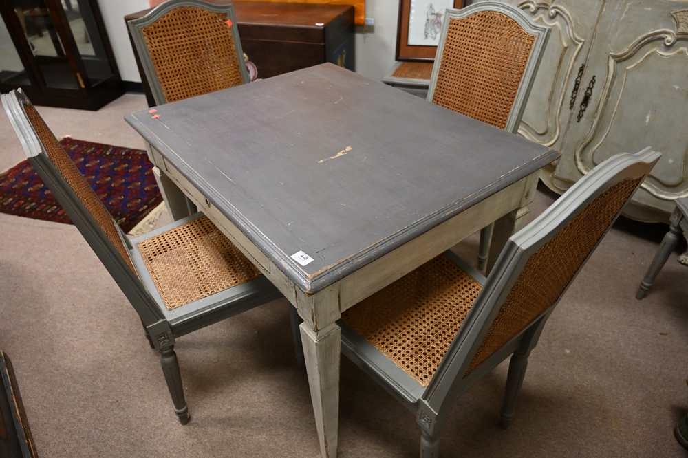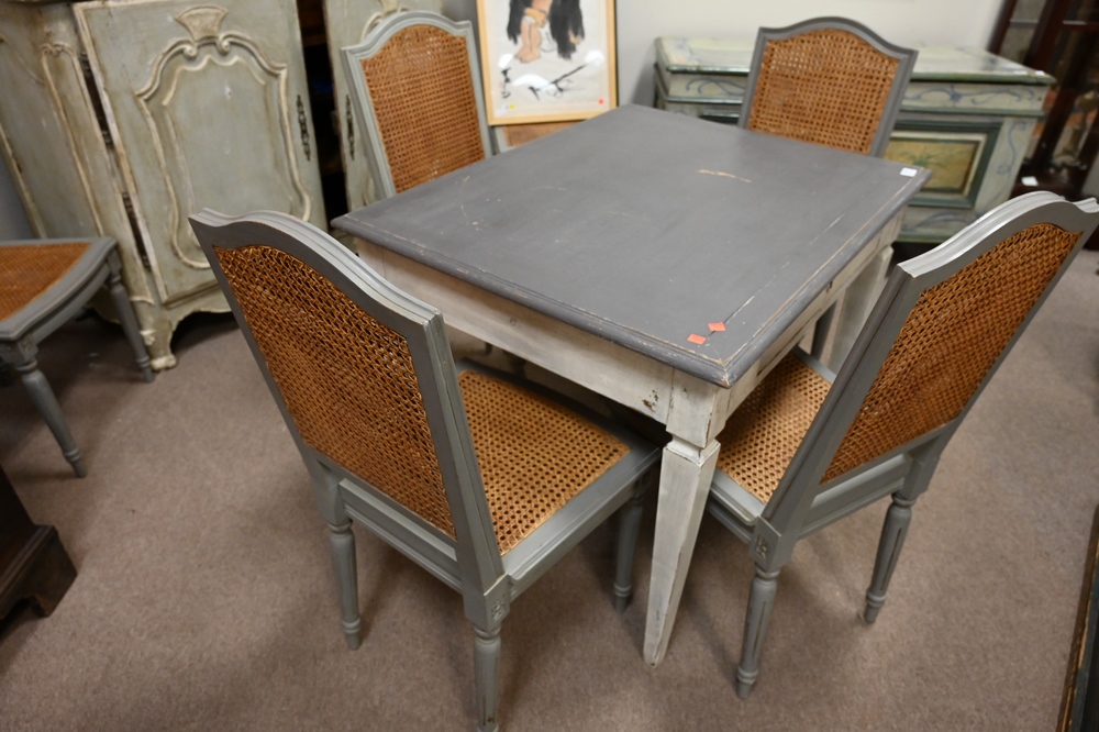 Continental Style Seven Piece Set, to include table with drawer along with six caned chairs, all in grey paint, height 30 inches, top 31 1/4 x 39 inches.
