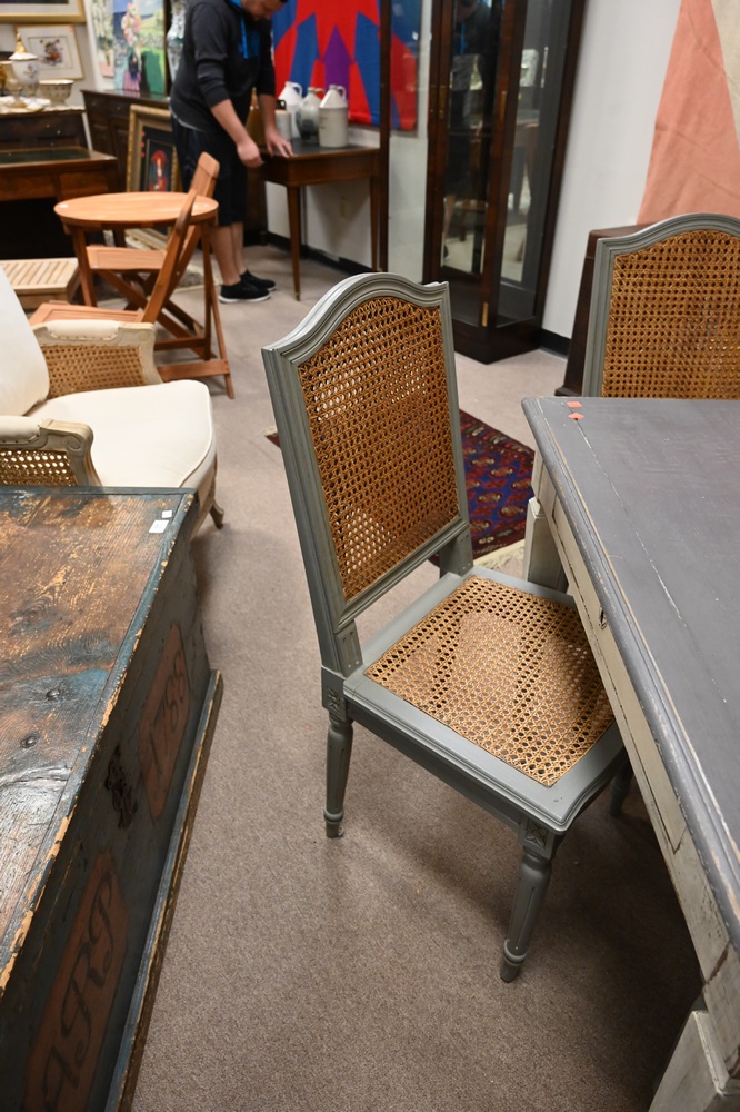 Lot 440: Continental Style Seven Piece Set, to include table with drawer along with six caned chairs, all in grey paint, height 30 inches, top 31 1/4 x 39 inches.
