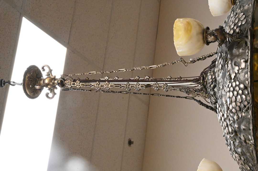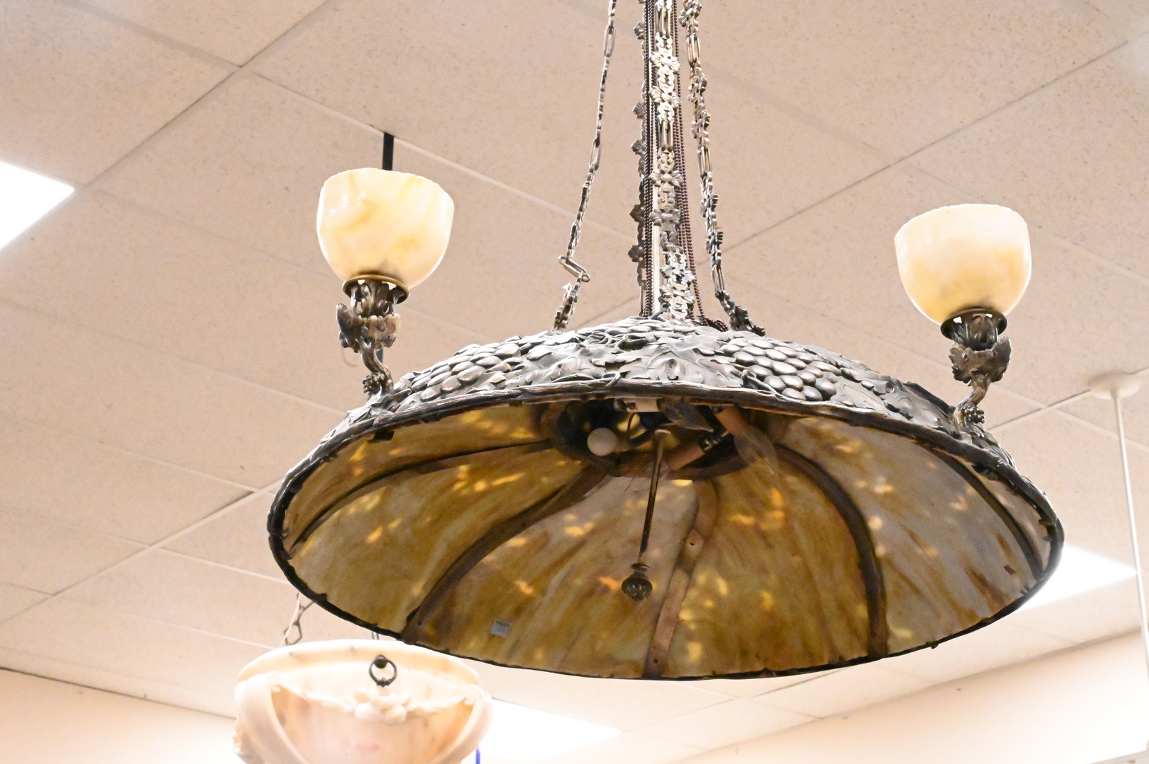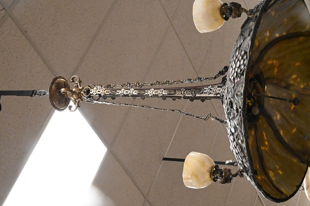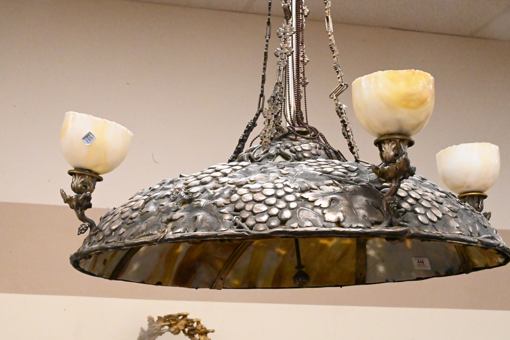 having large circular silvered and leaded glass dome with cast in relief with grapes and leaves, supporting four lights with shades and four interior lights, attributed to Edward Caldwell