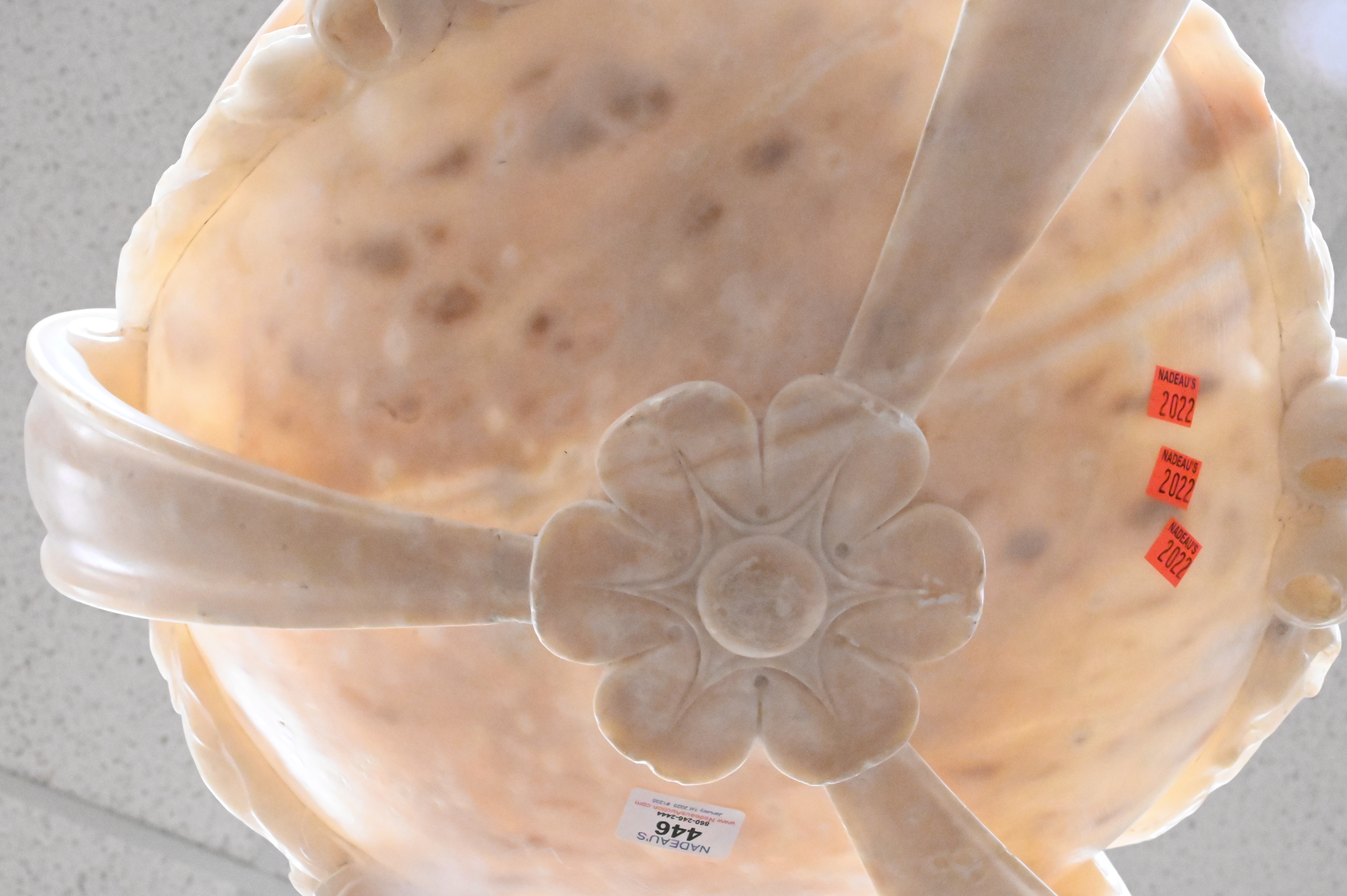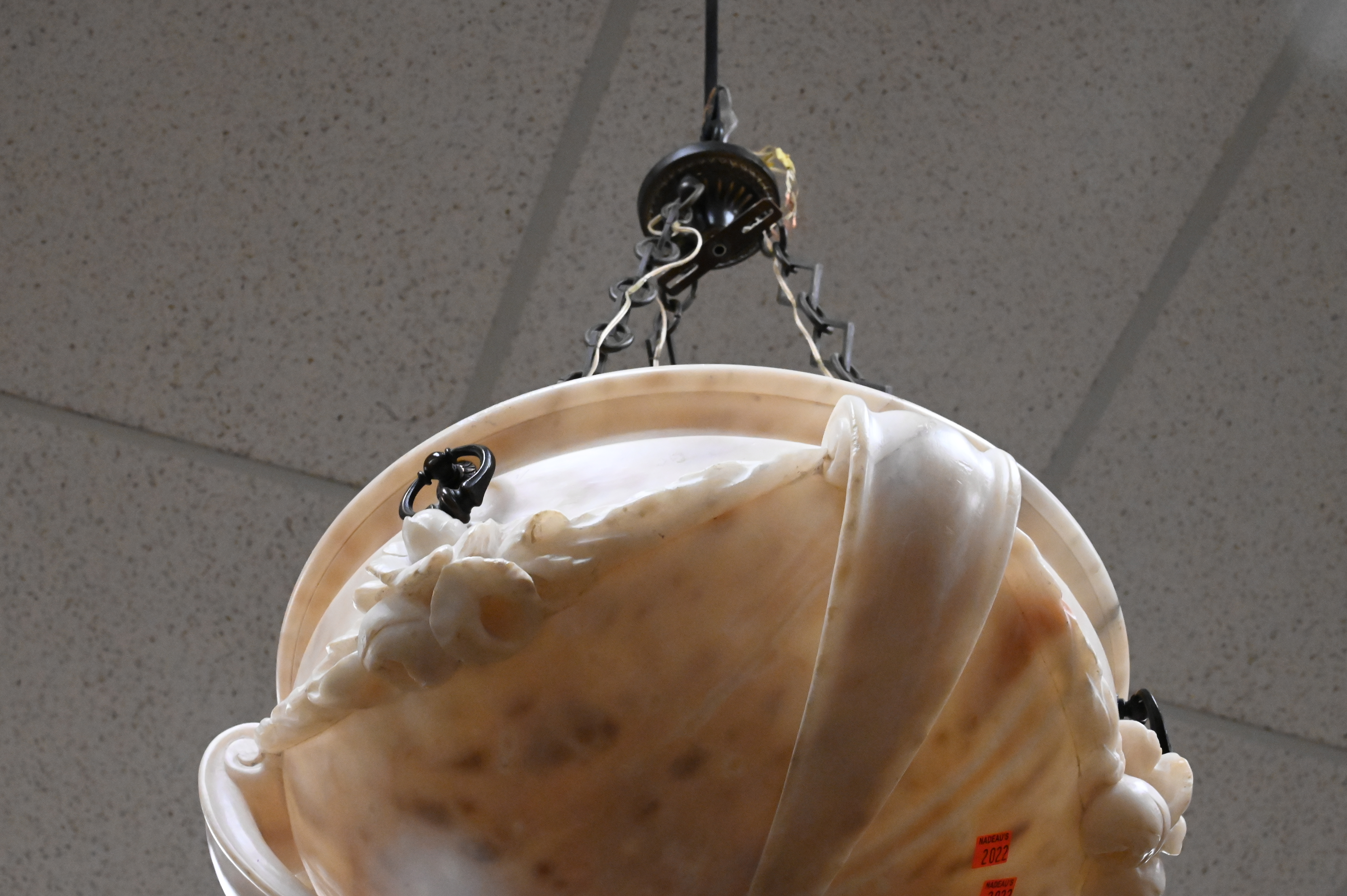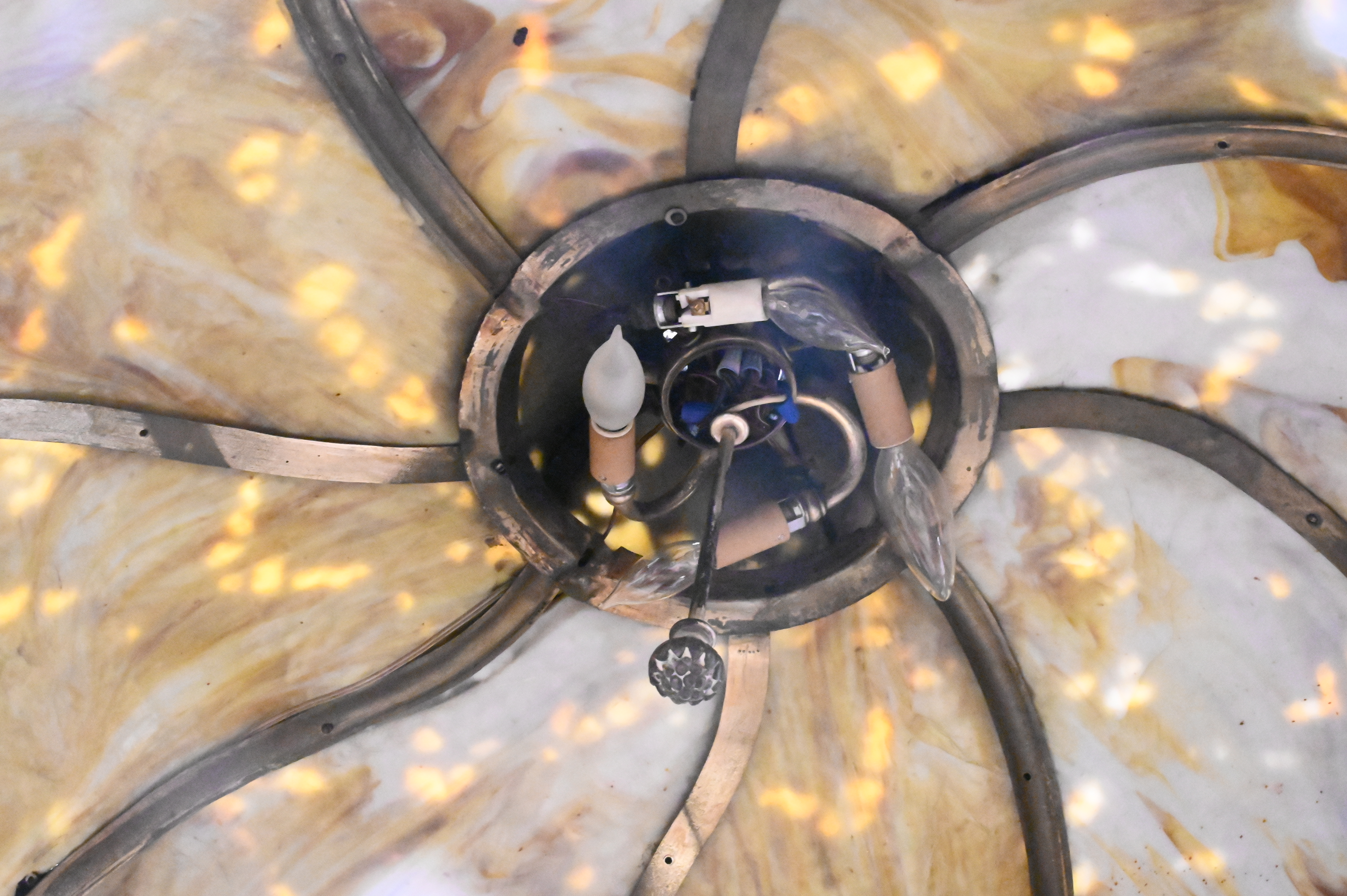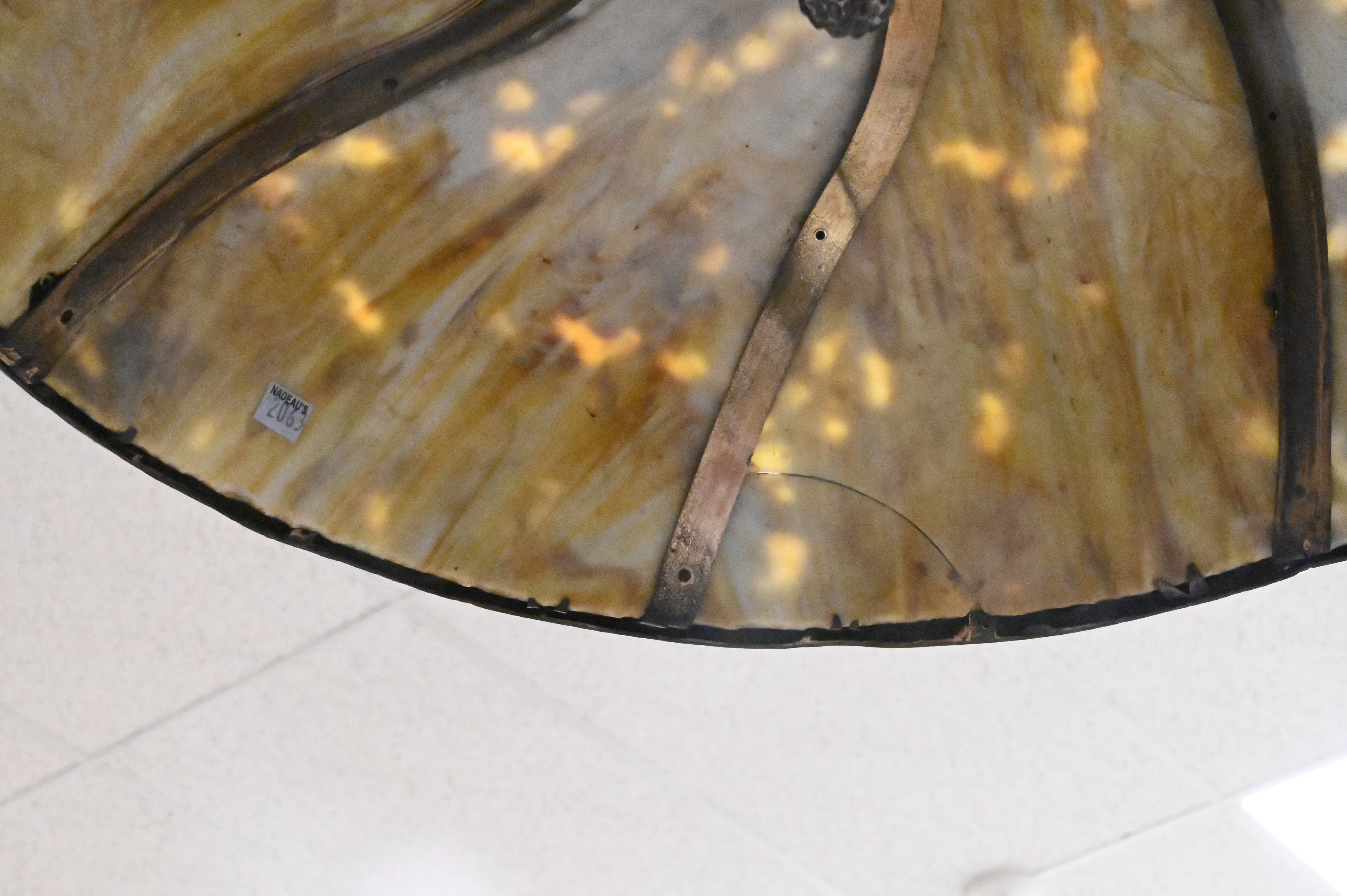 having large circular silvered and leaded glass dome with cast in relief with grapes and leaves, supporting four lights with shades and four interior lights, attributed to Edward Caldwell