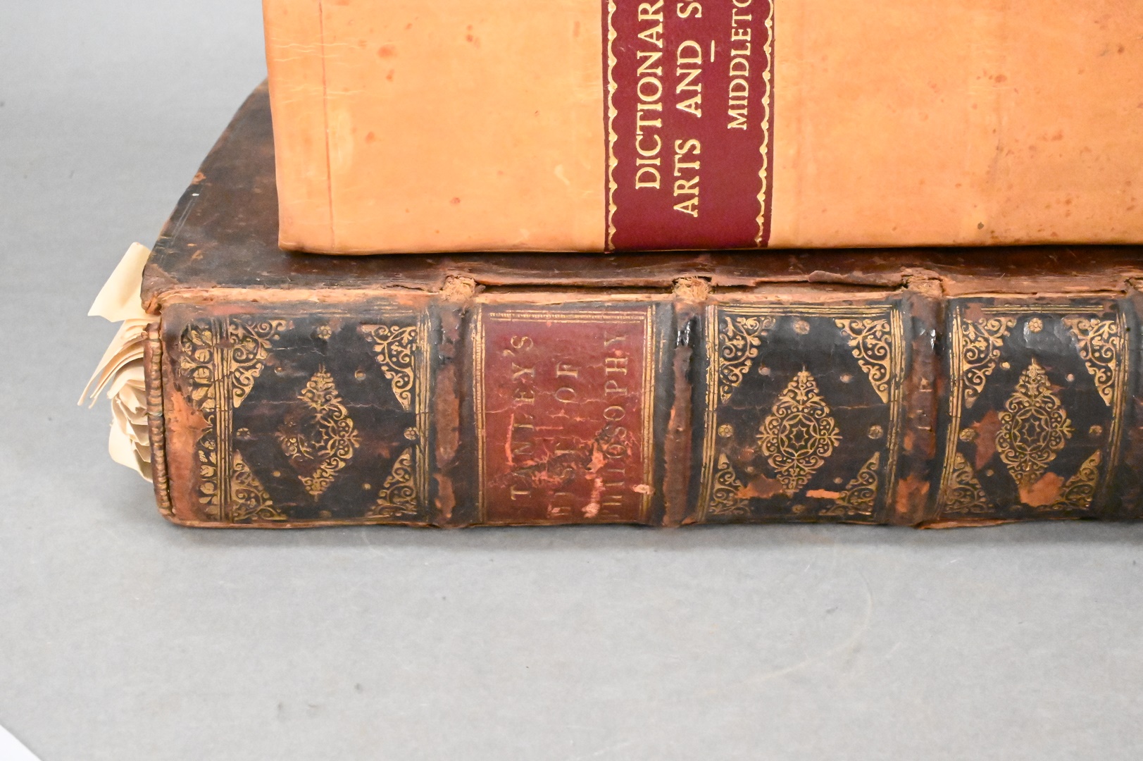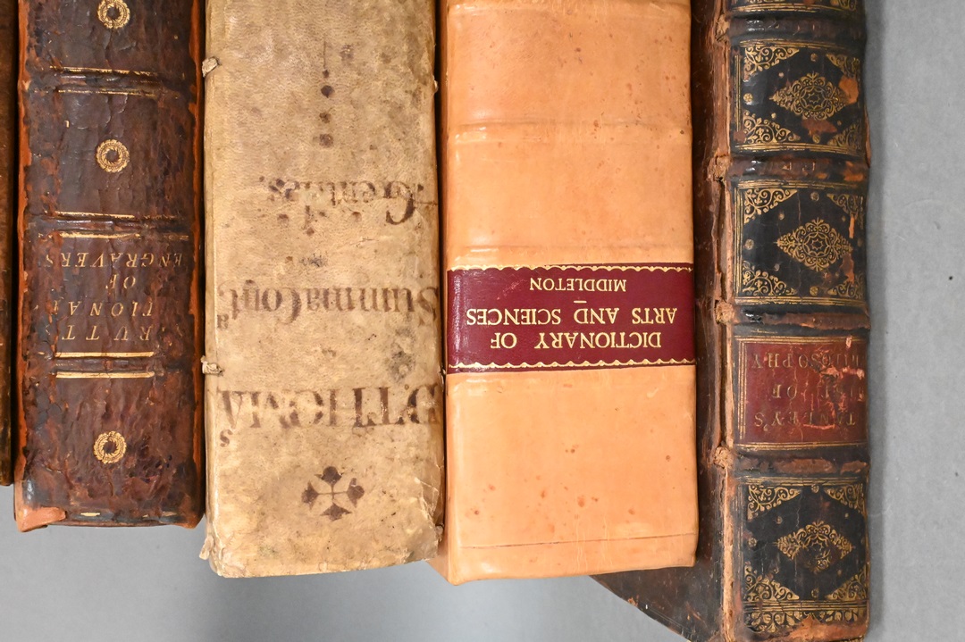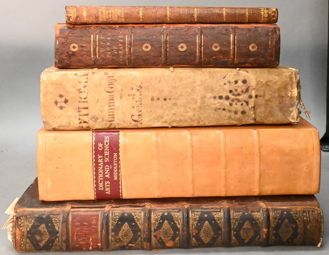 Five Leatherbound Books, to include Biographical Dictionary of Engravings by Joseph Strutt, two volumes in one, some hand colored, 1786; The History of Philosophy, third edition by Thomas Stanley, London, 1701; Pronti, Domenico Nuovx Ricoolta, 170 engraved views, 1795; Dictionary of Arts & Sciences by Erasmus Middleton, two volumes in one; along with St. Thomas Aquinas Summa Contra Gentlivas, 1552.
