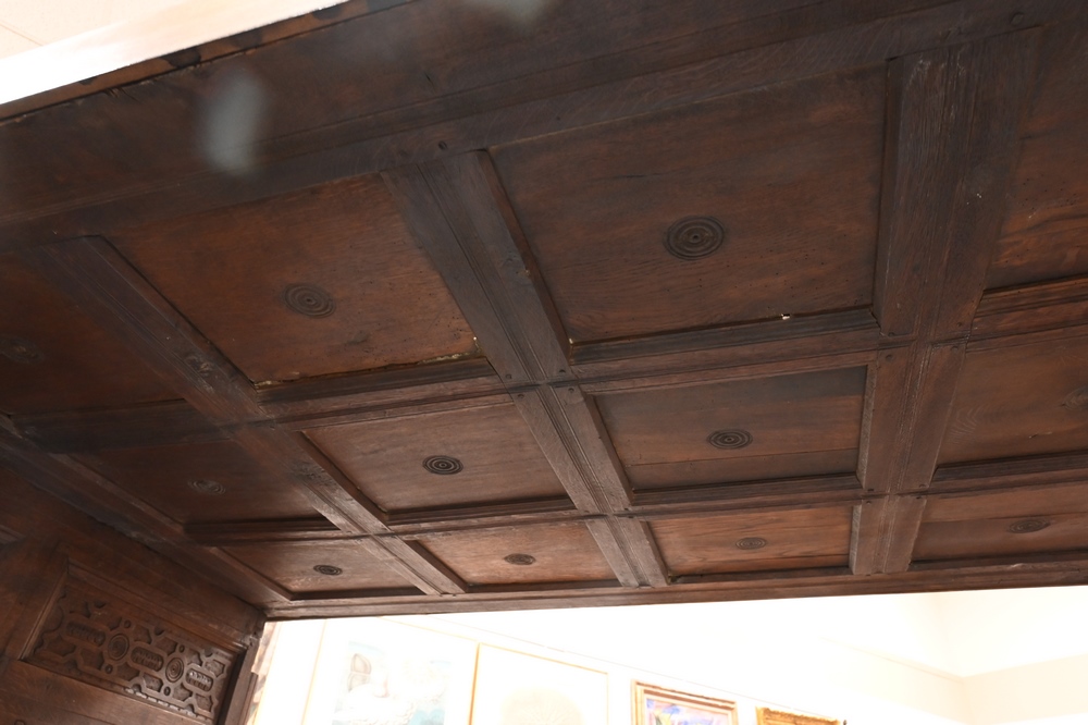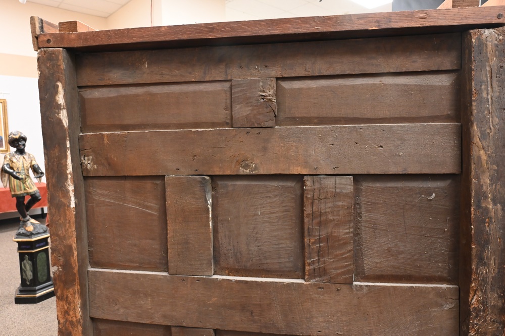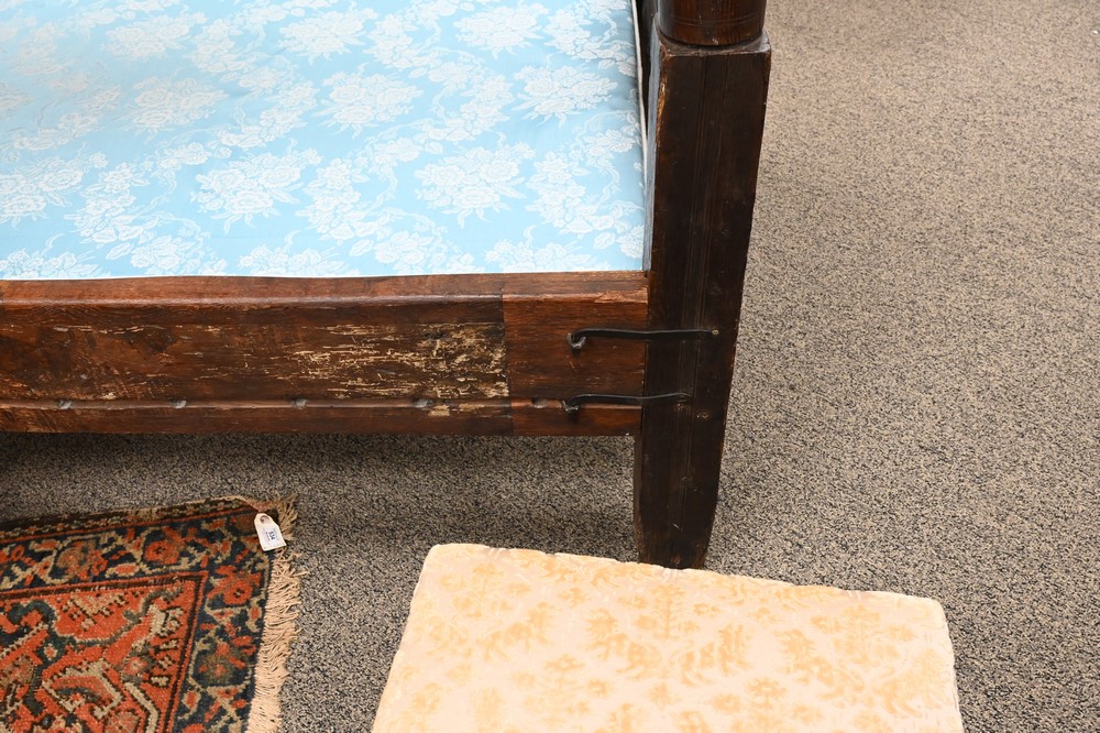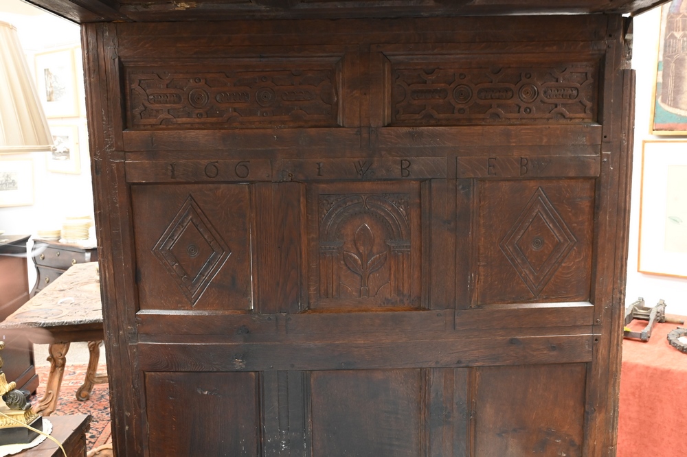 Lot 440: Jacobean Oak Canopy Bed, having paneled canopy on paneled headboard dated 1661, English, 17th century, WB EB carved into headboard,…