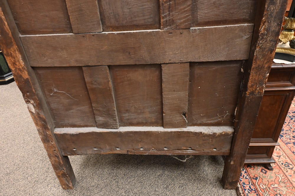 Jacobean Oak Canopy Bed, having paneled canopy on paneled headboard dated 1661, English, 17th century, WB EB carved into headboard, side rail appears to be original but now extended, 47″ x 74 1/2″ inside dimensions, height with canopy 76 inches.