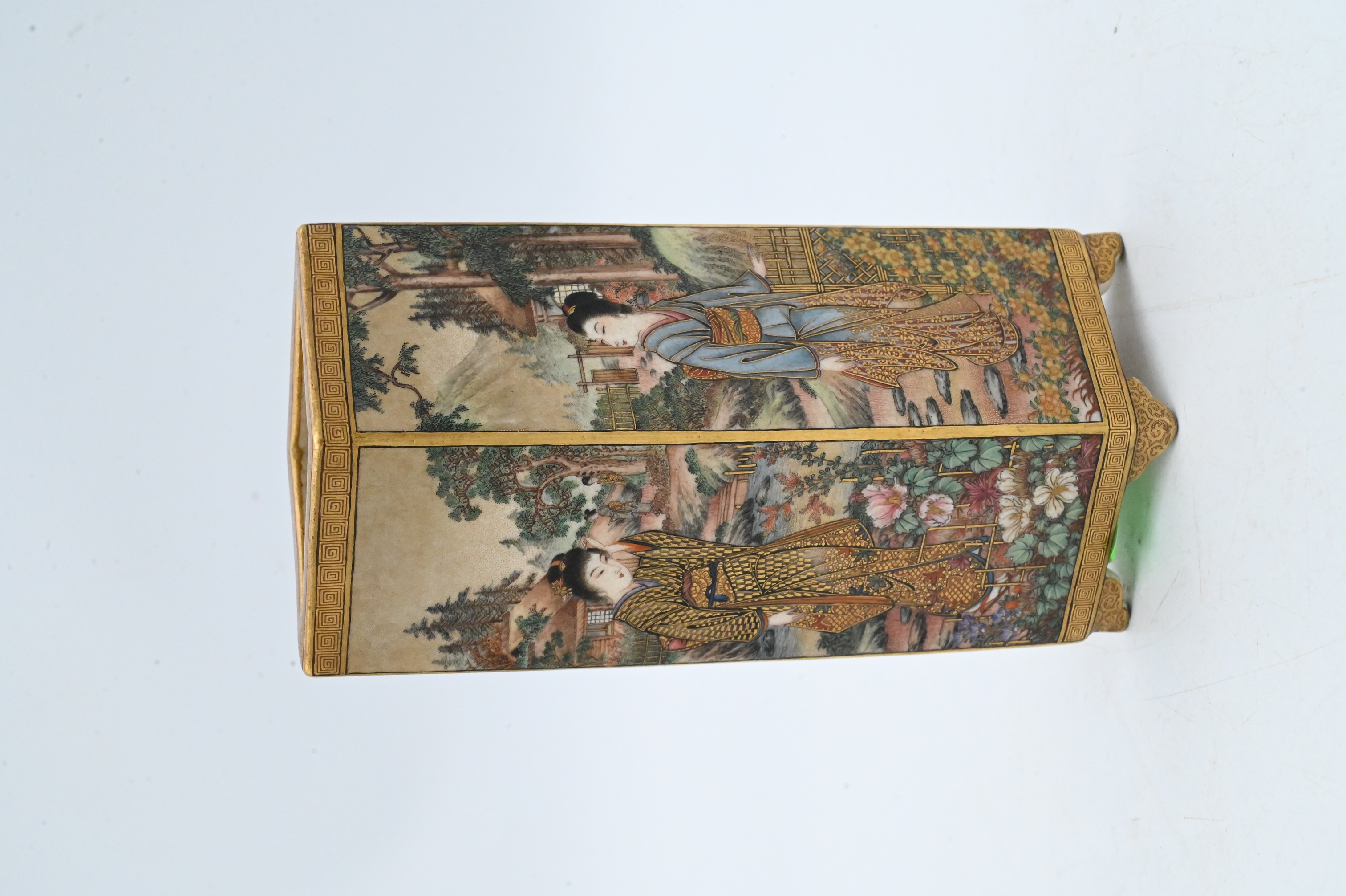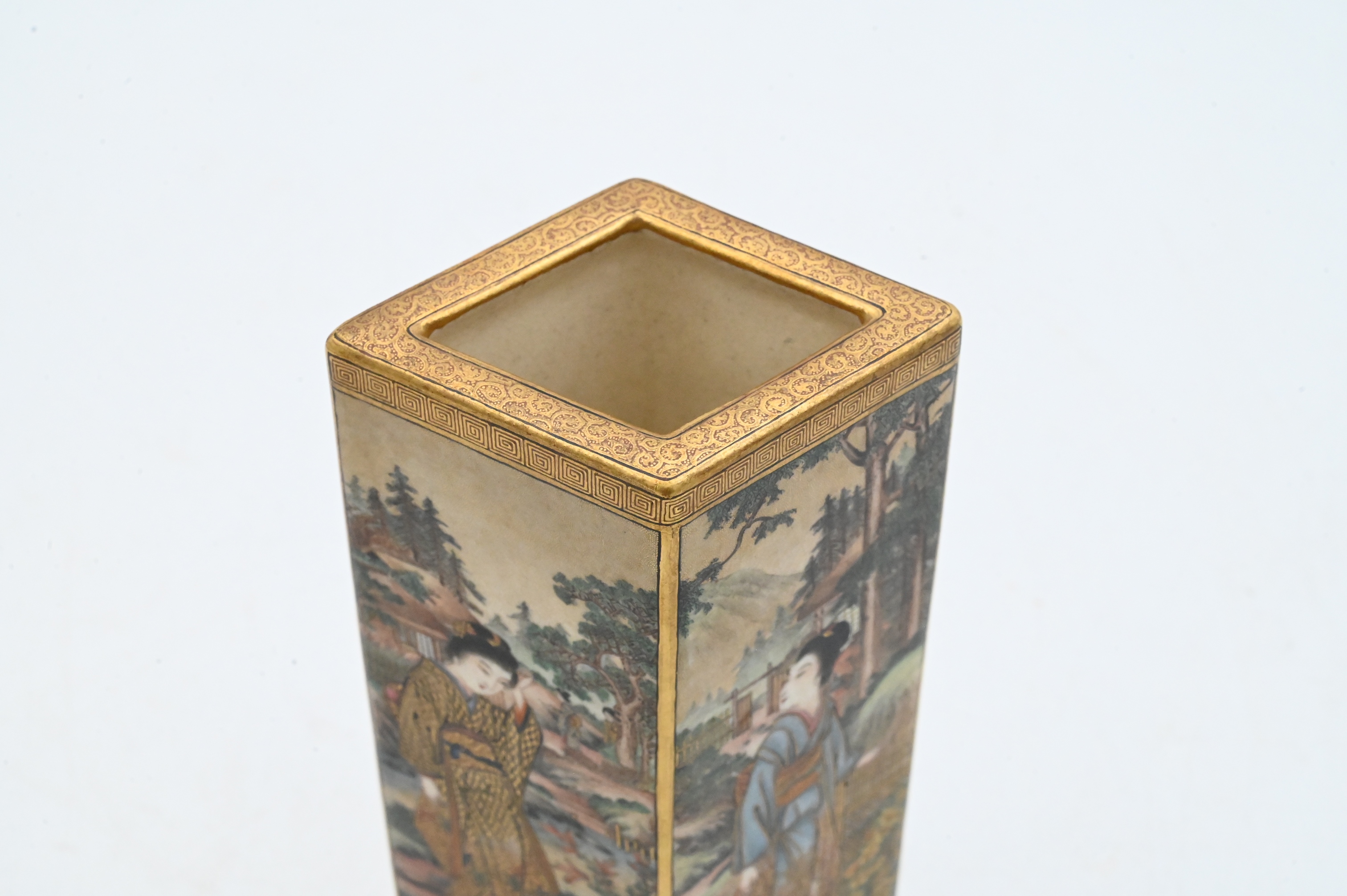 A finely decorated four-sided, diamond-shaped Japanese Satsuma vase, each panel meticulously painted with gilt and polychrome figural scenes of scholars in landscape settings. Raised on four gilt bracket feet. Signed on the base in gold characters.