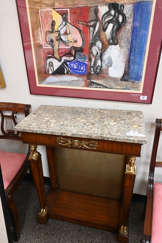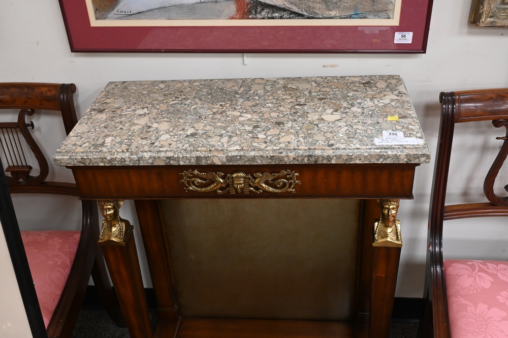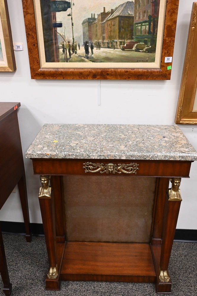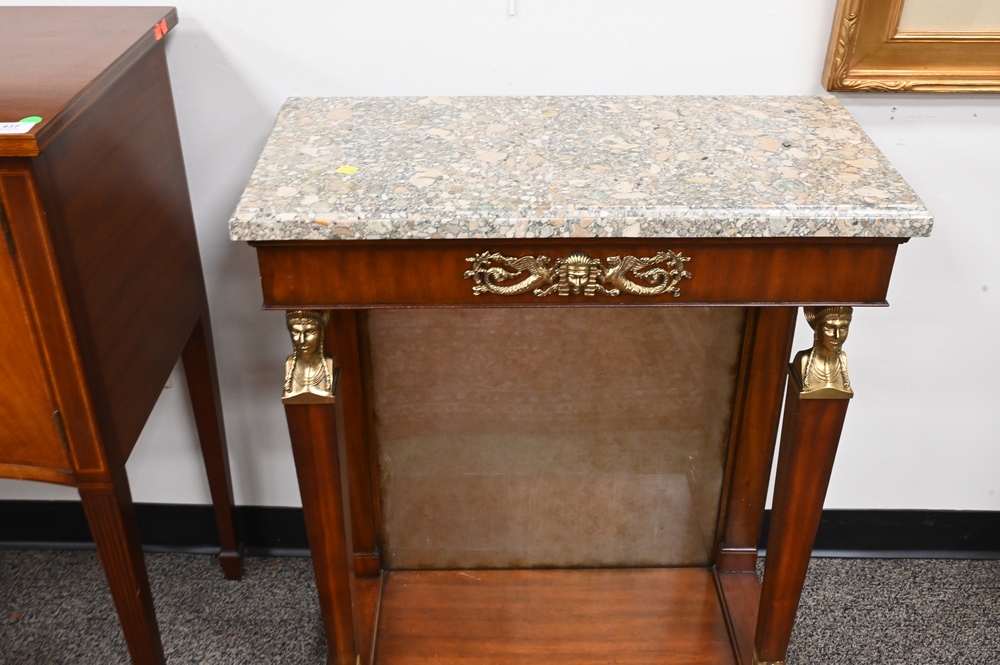 Lot 440: Pair of Maitland Smith Marble Top Pier Tables, having dulled mirror backs, height 33 1/2 inches, top 13″ x 28″.