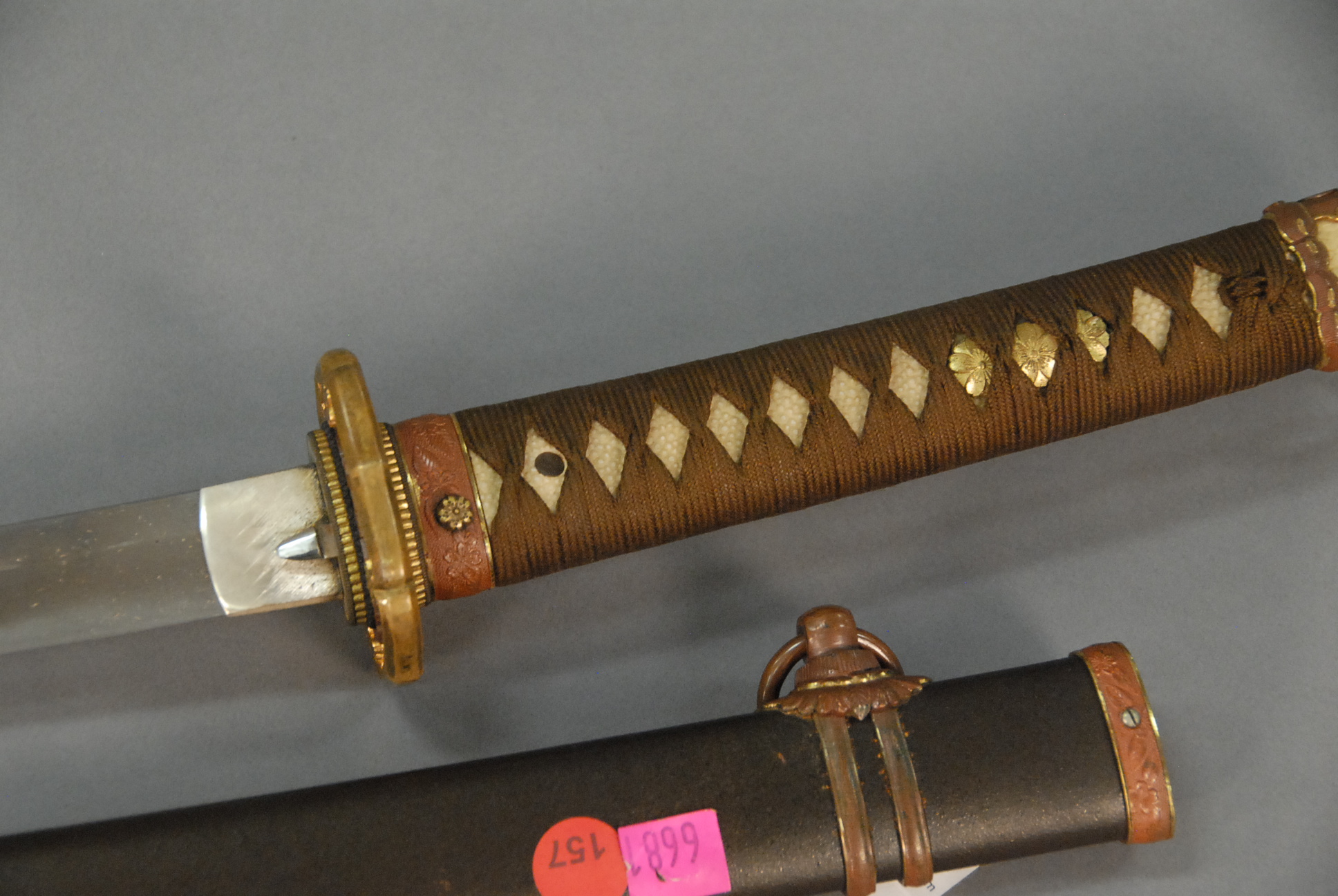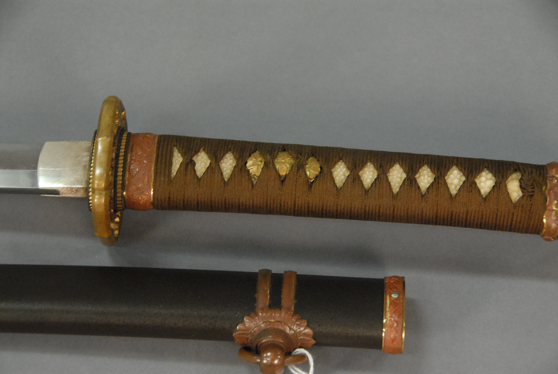 Lot 440: Samurai sword with gilt bronze tsuba and tri&cluster floral menuki, samegawa hilt, Japan, Showa in excellent condition, with gold attribution to Taikei Naotane. lg. 29 1/4in.