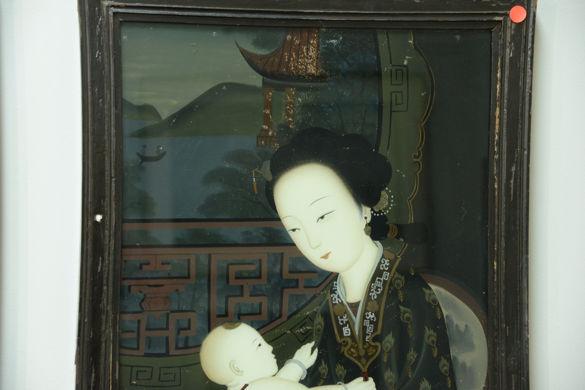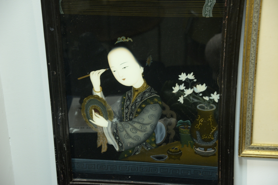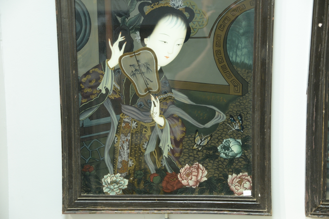 Set of three Chinese School reverse painting on glass of a guanyin in hardwood frame. 25 1/2 x 17 1/4 Provenance: Collection of Anne Jones Willis and the late John Ralph Willis, New Jersey