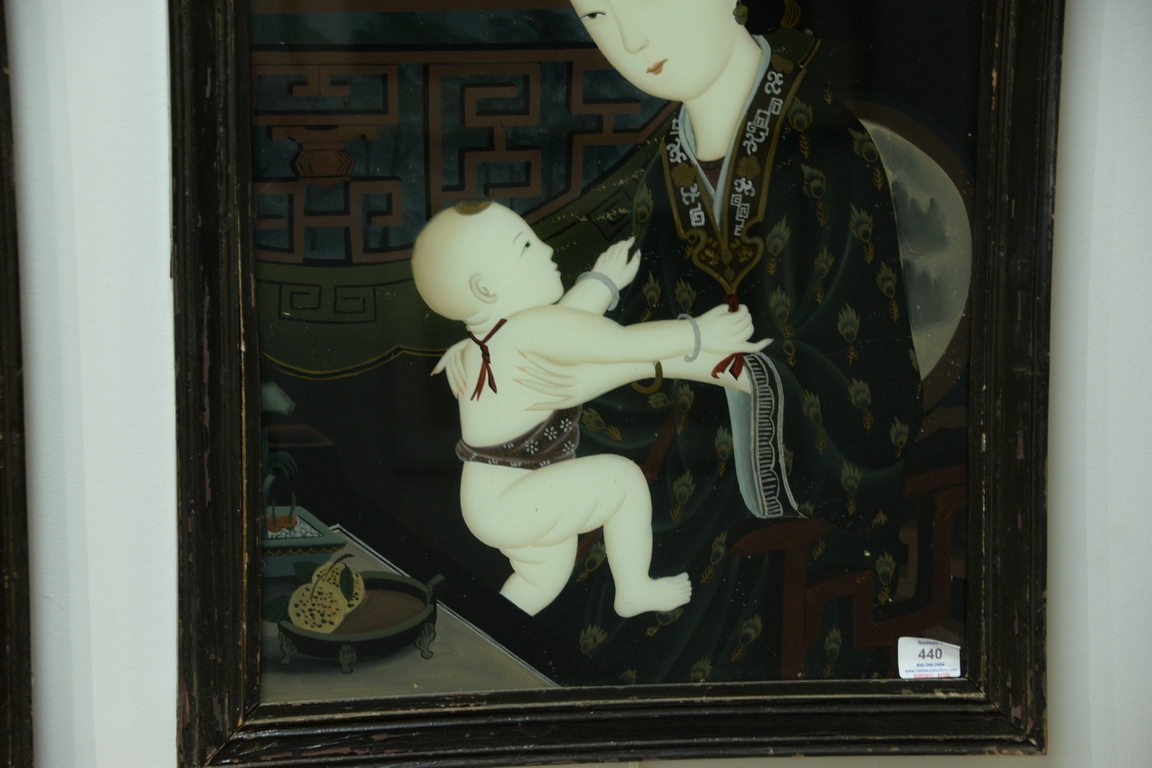 Lot 440: Set of three Chinese School reverse painting on glass of a guanyin in hardwood frame. 25 1/2 x 17 1/4 Provenance: Collection of An…