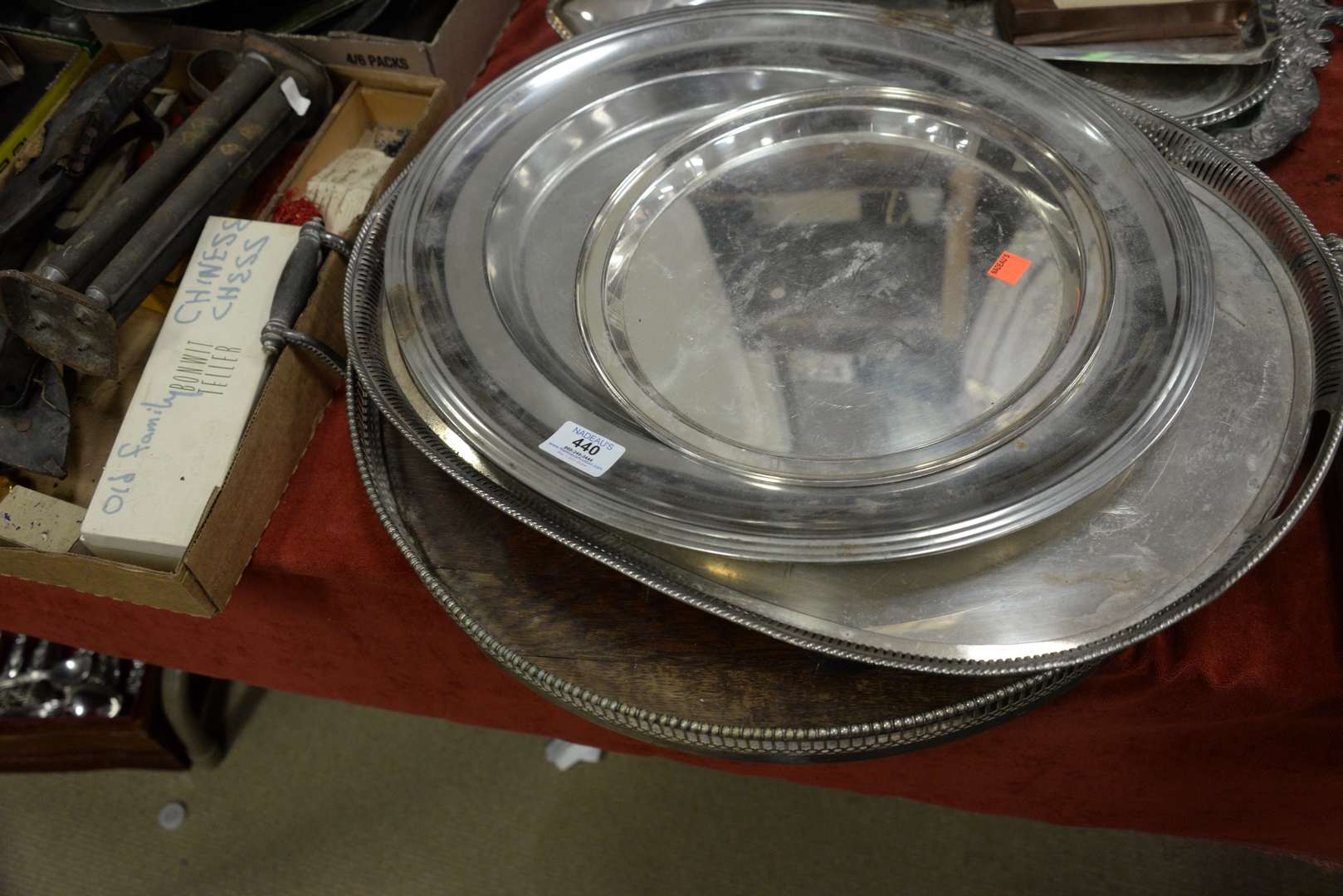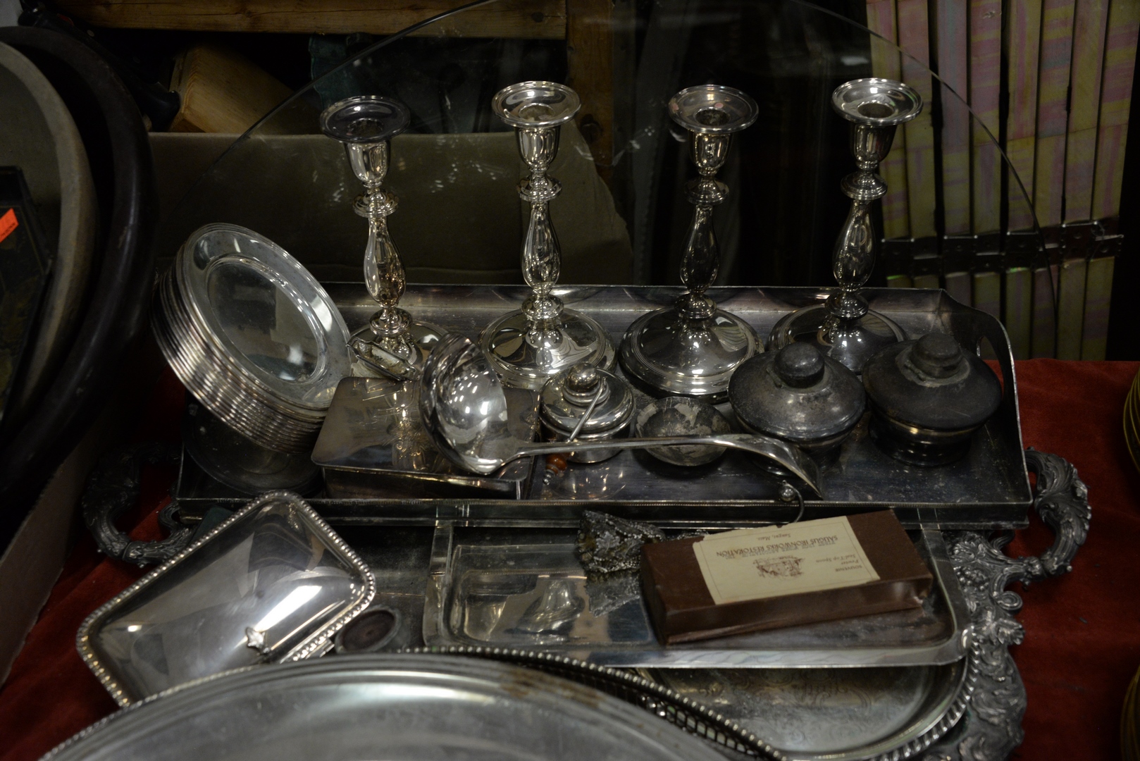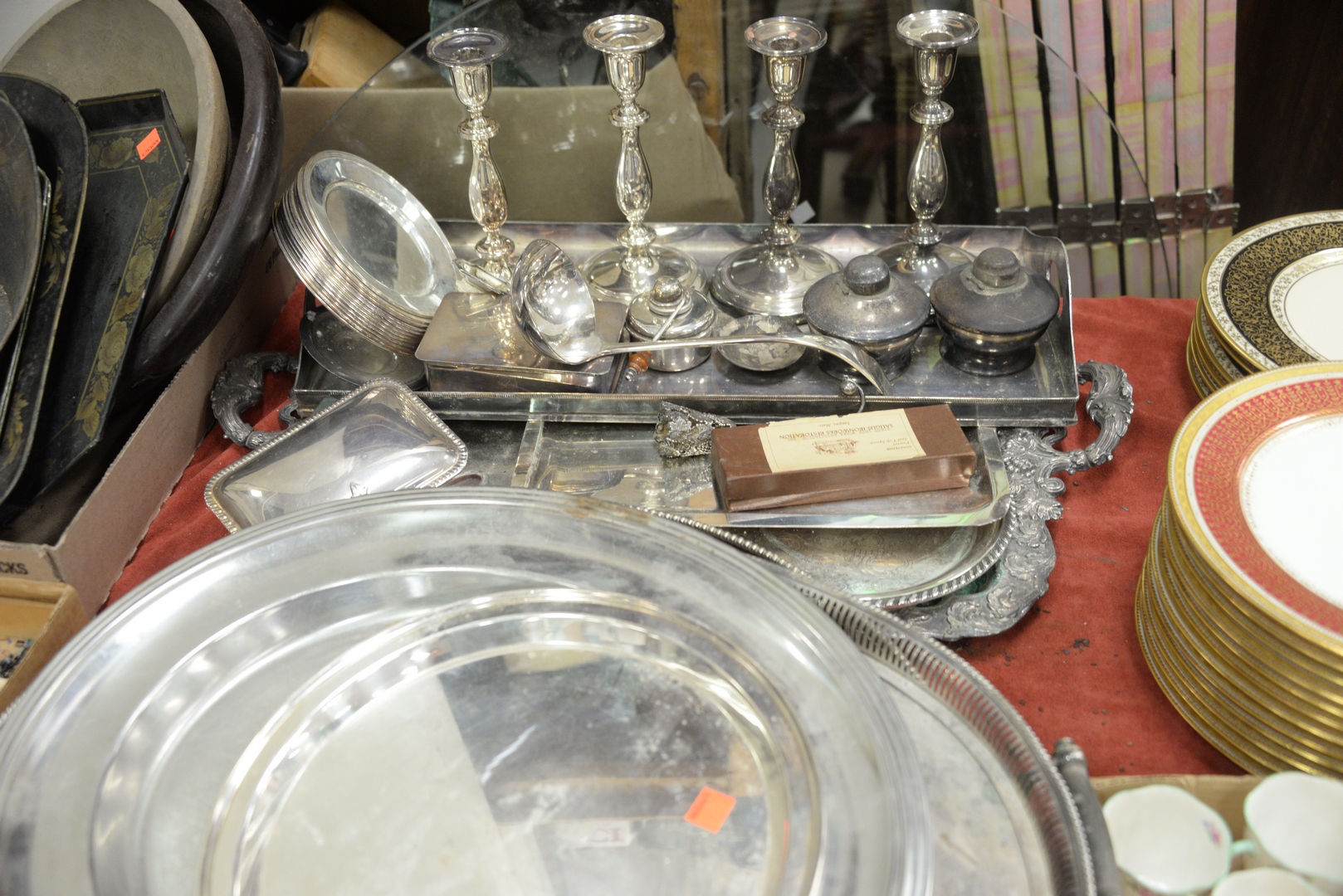 Lot 440: Silver Plated Lot, to include set of four Sheffield silver plated candlesticks; two trays; ice bucket; four trays, two having wood bottoms; along with a silver plated flatware set. Provenance: From a Newport, Rhode Island historic home, in the same f