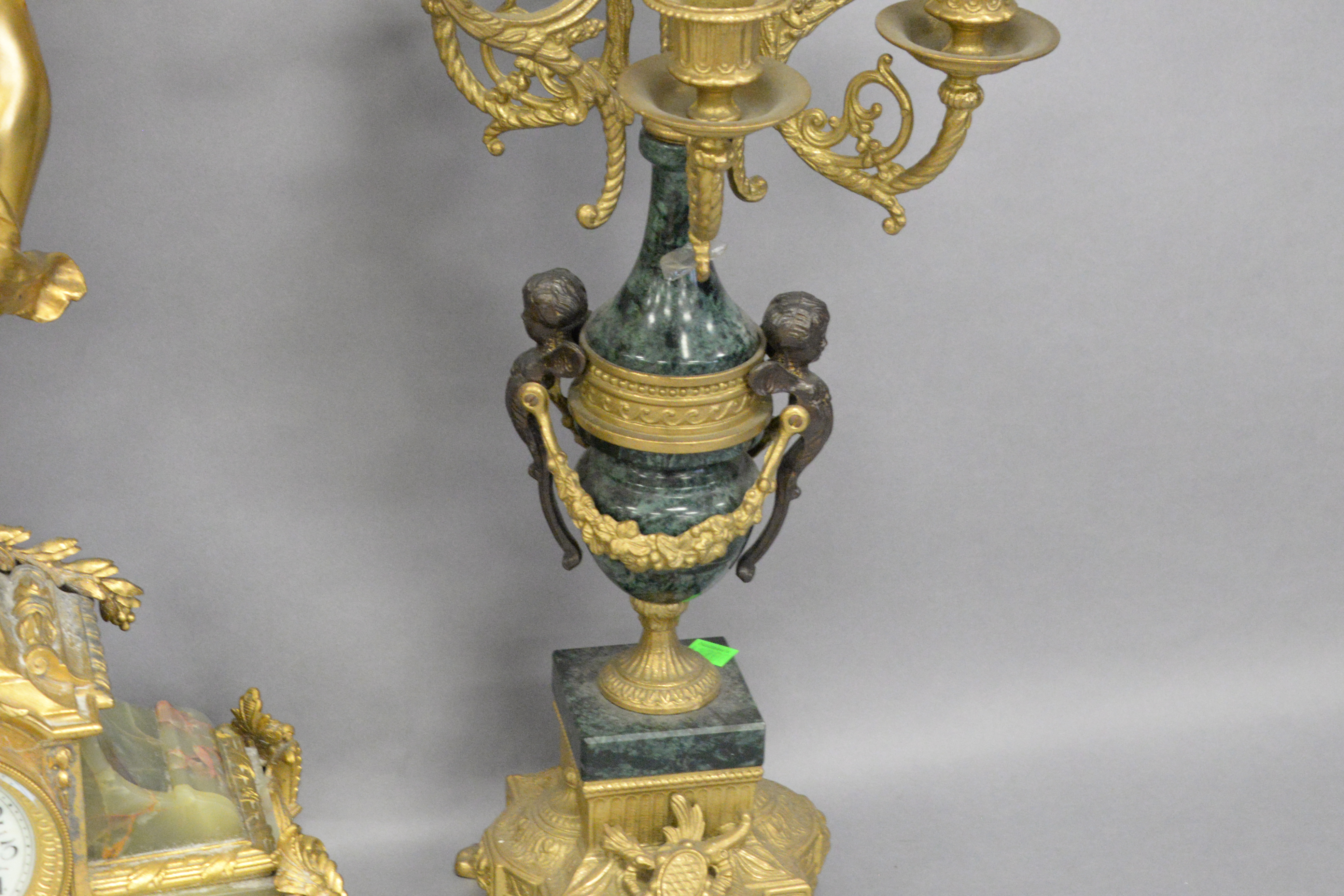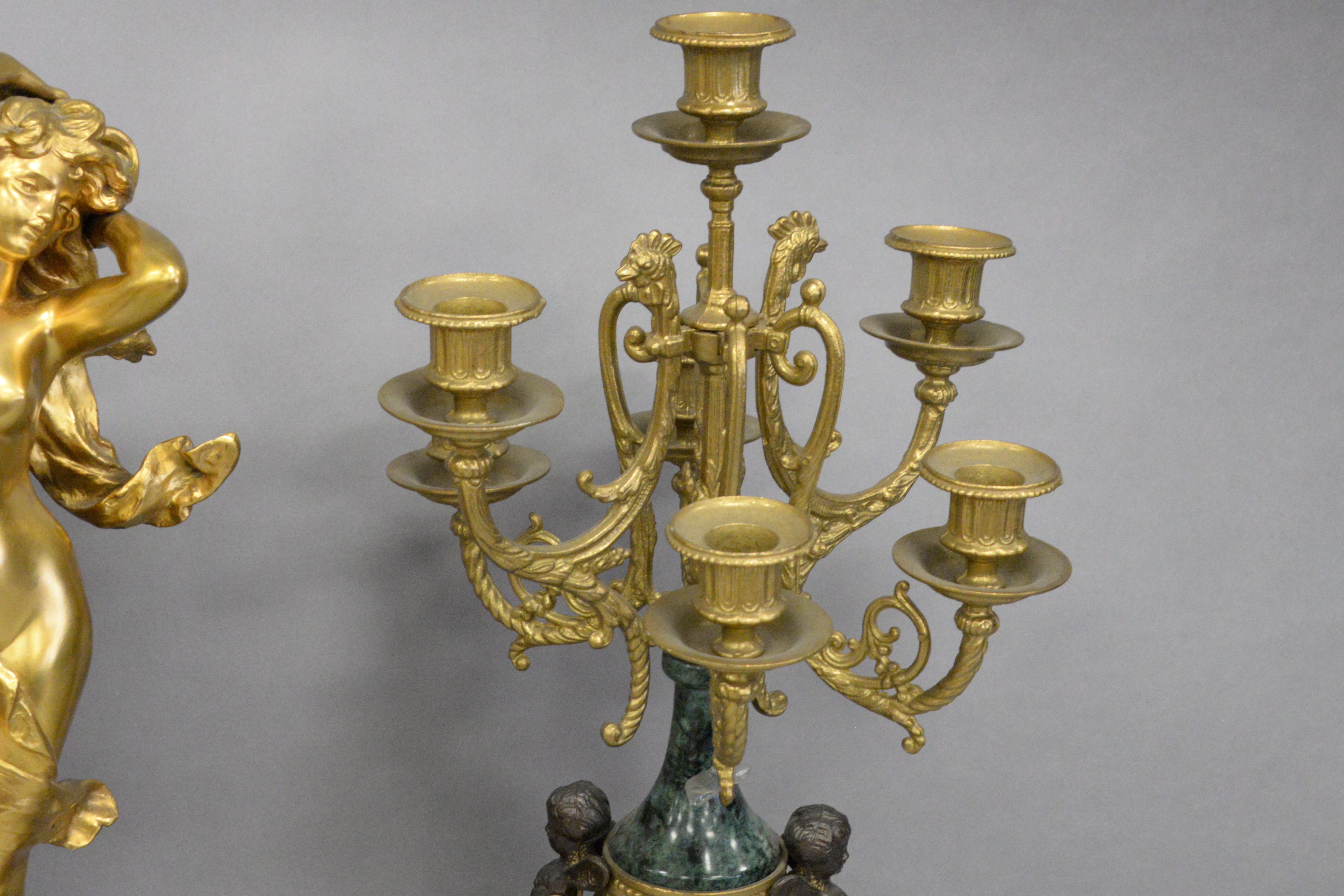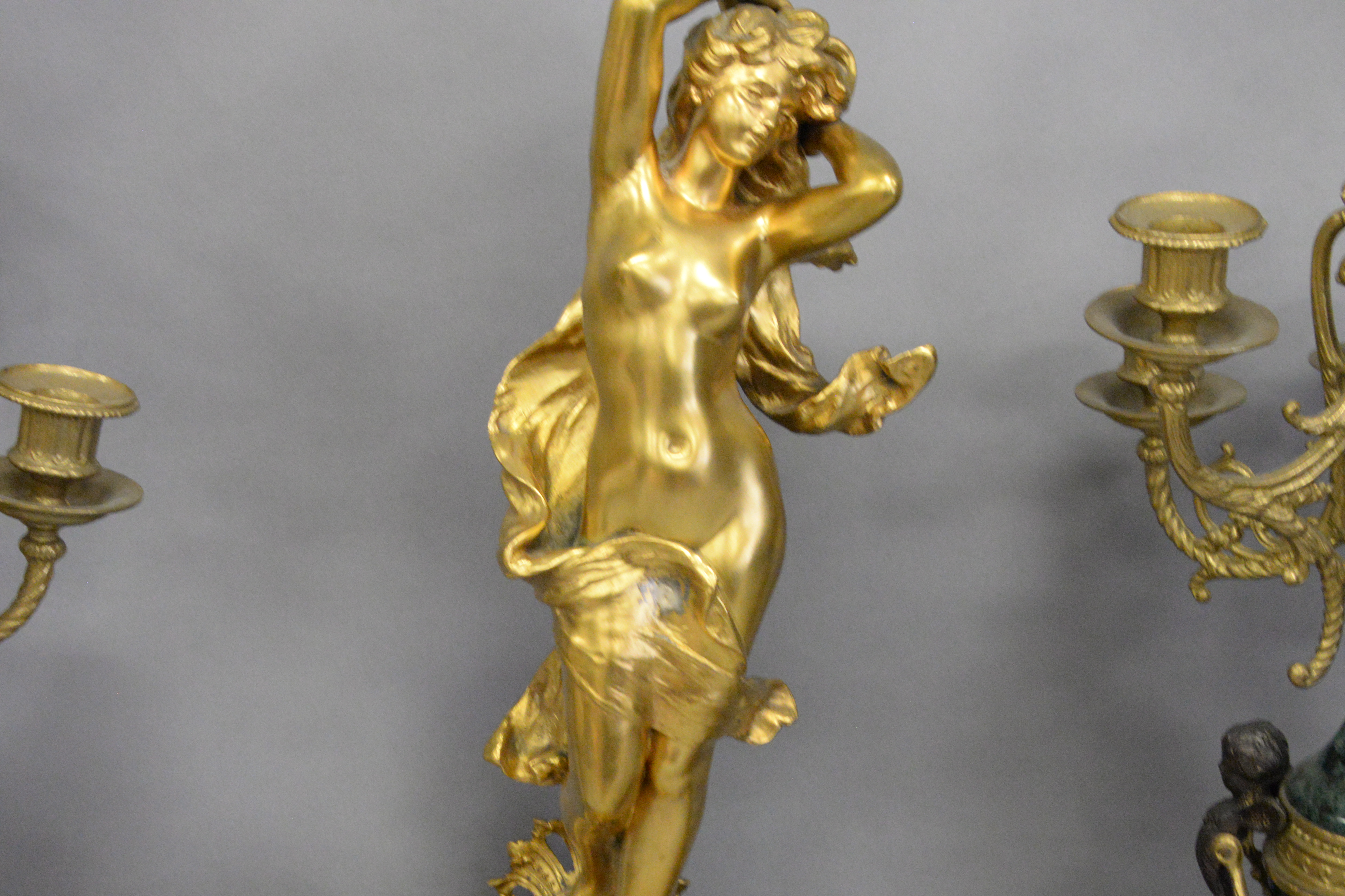 To include a French mantle clock having gilt nude figure on alabaster base, with a pair candelabras, tallest height 24 inches