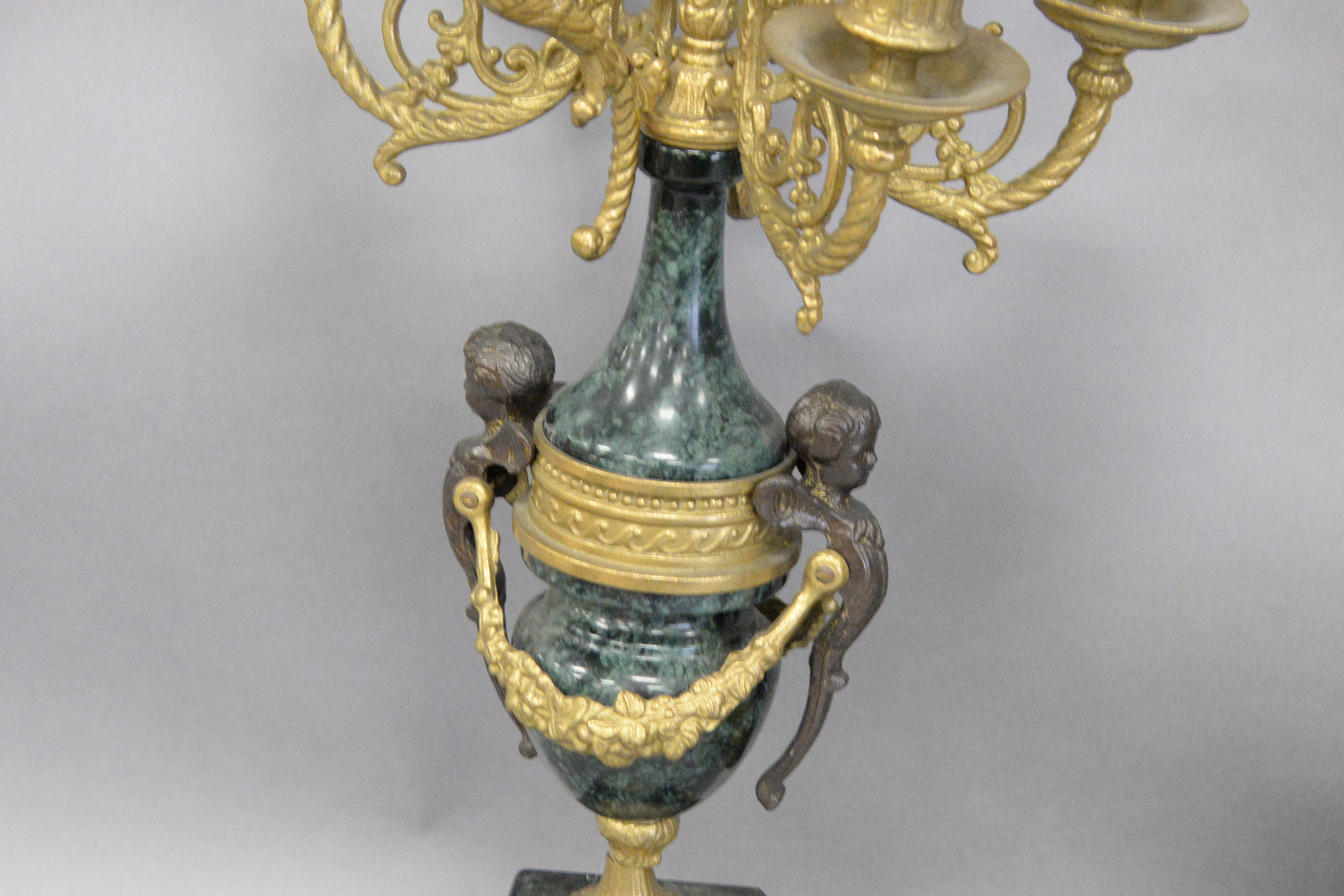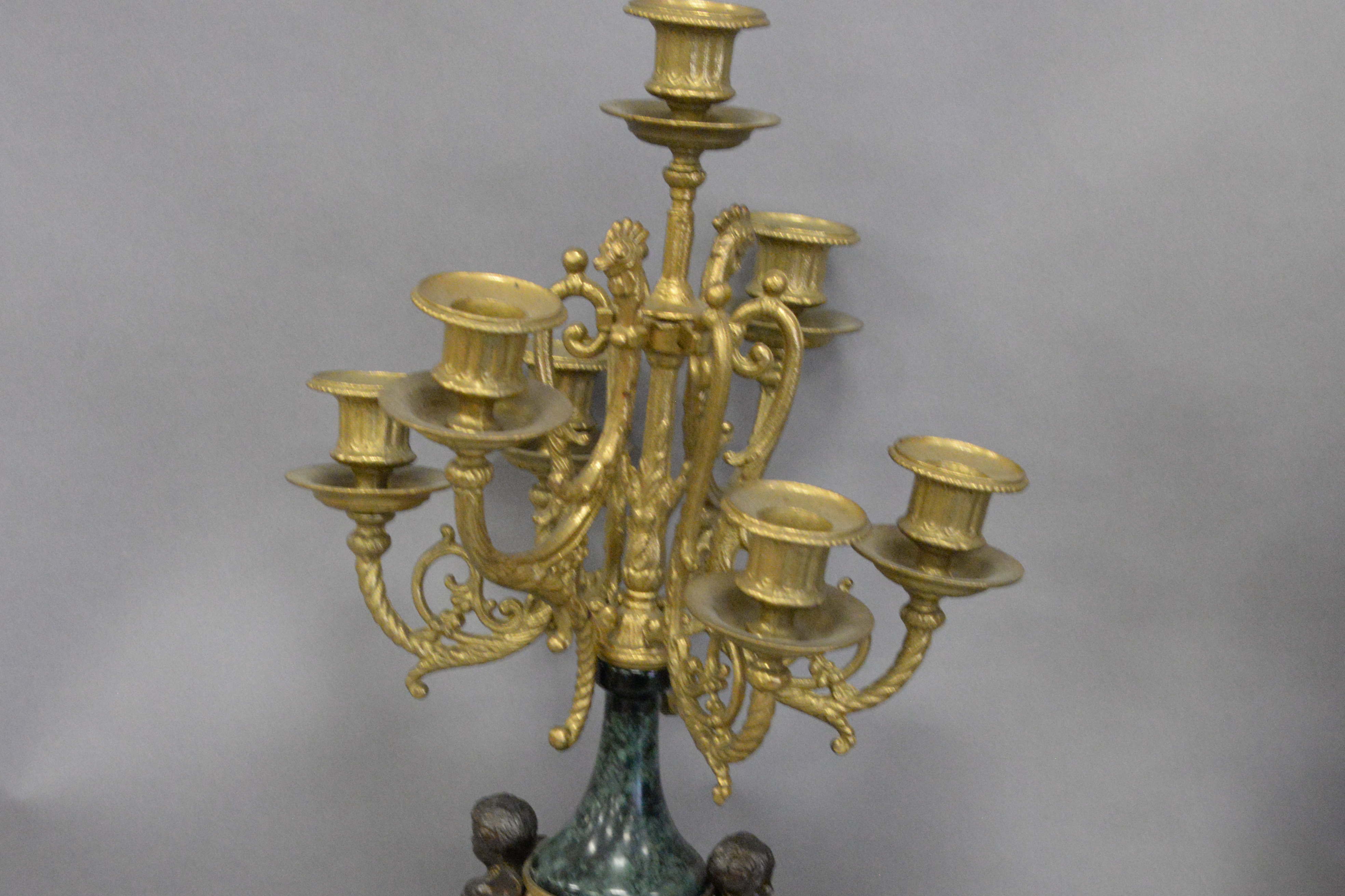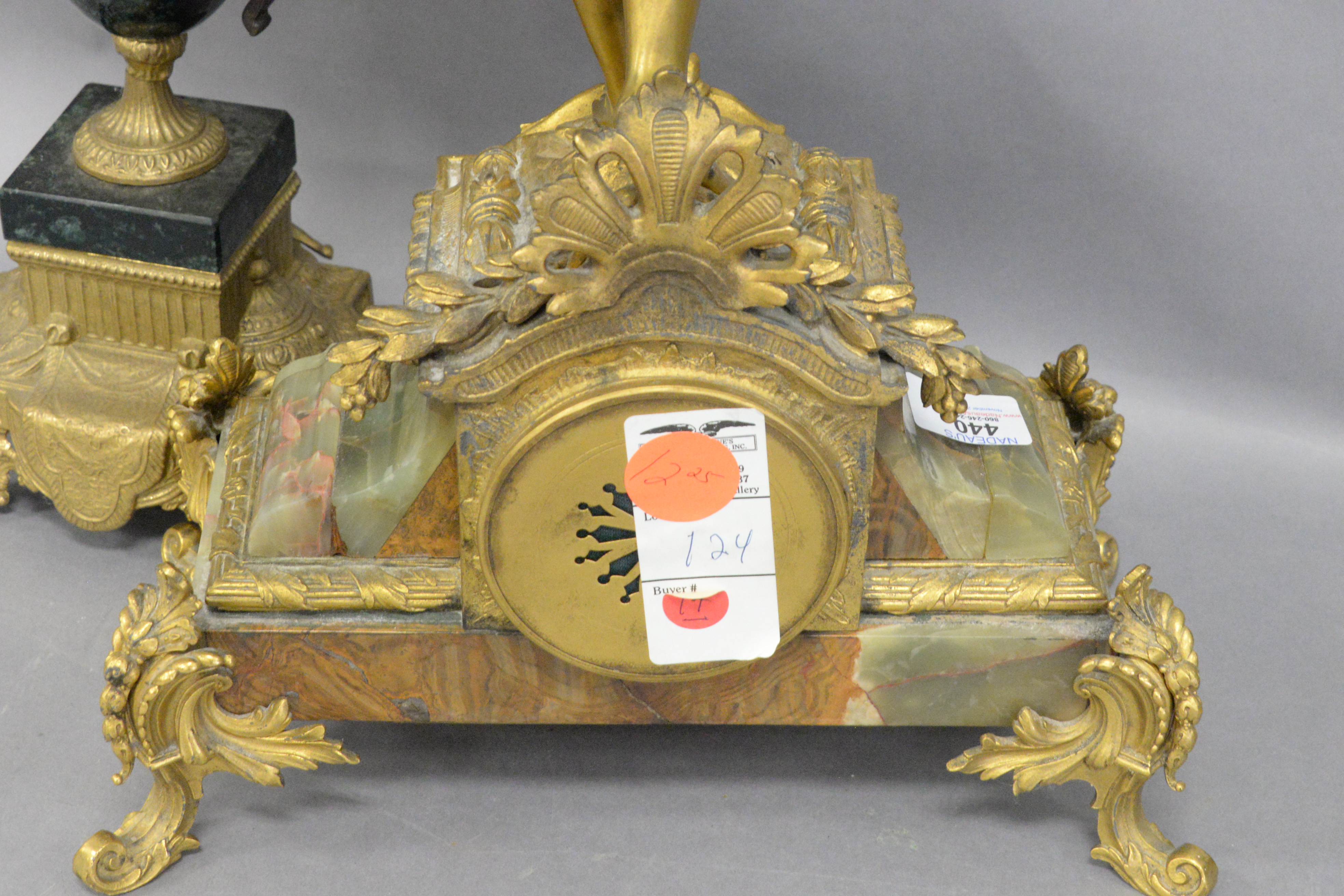 To include a French mantle clock having gilt nude figure on alabaster base, with a pair candelabras, tallest height 24 inches