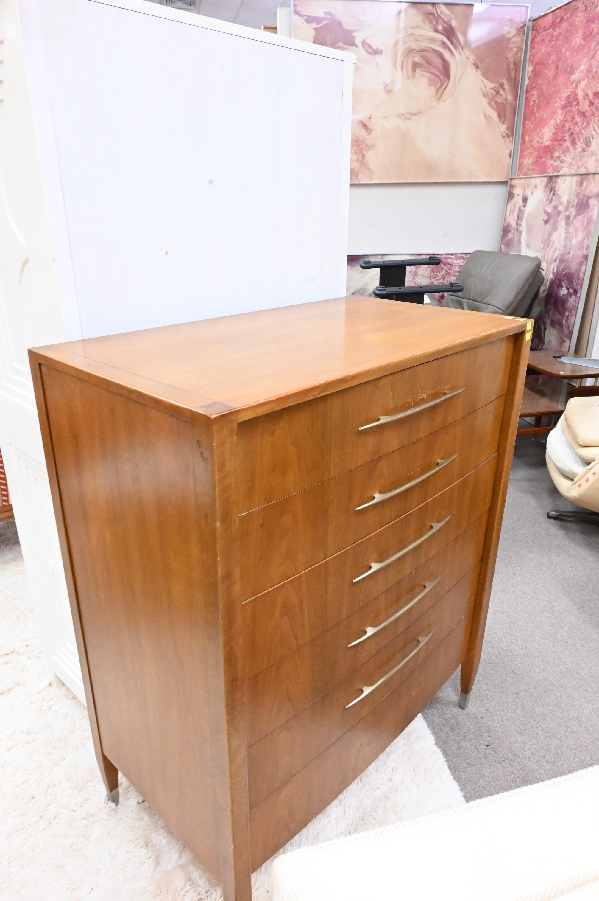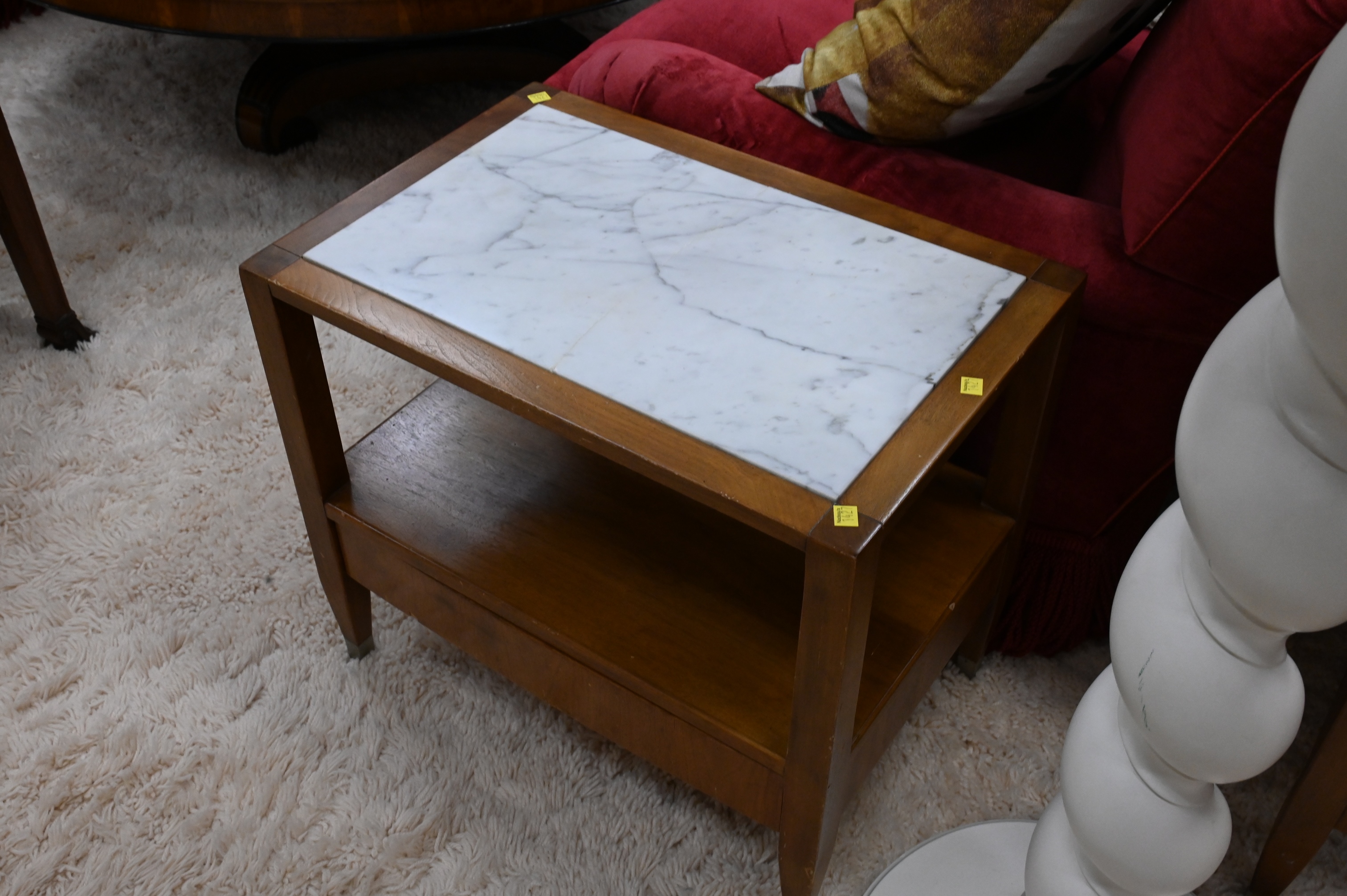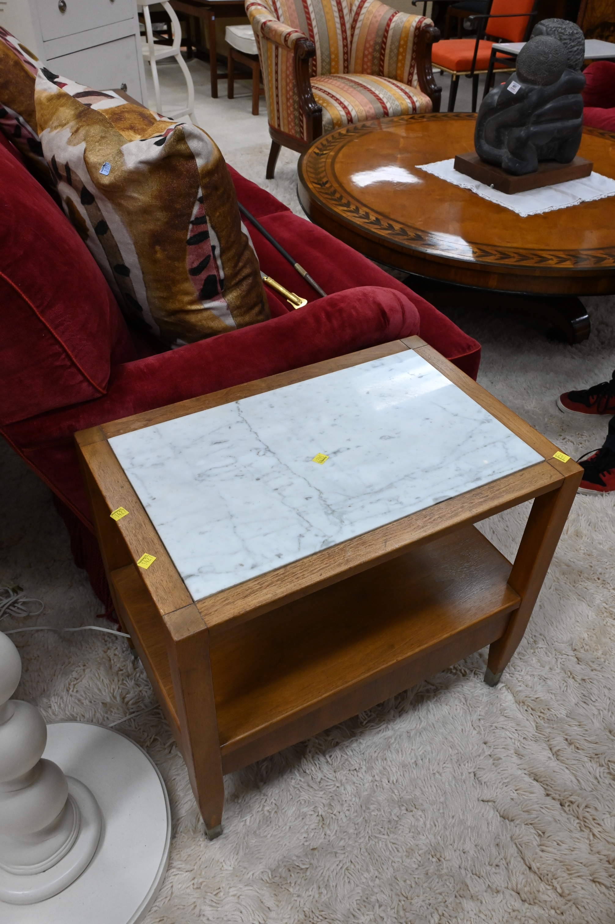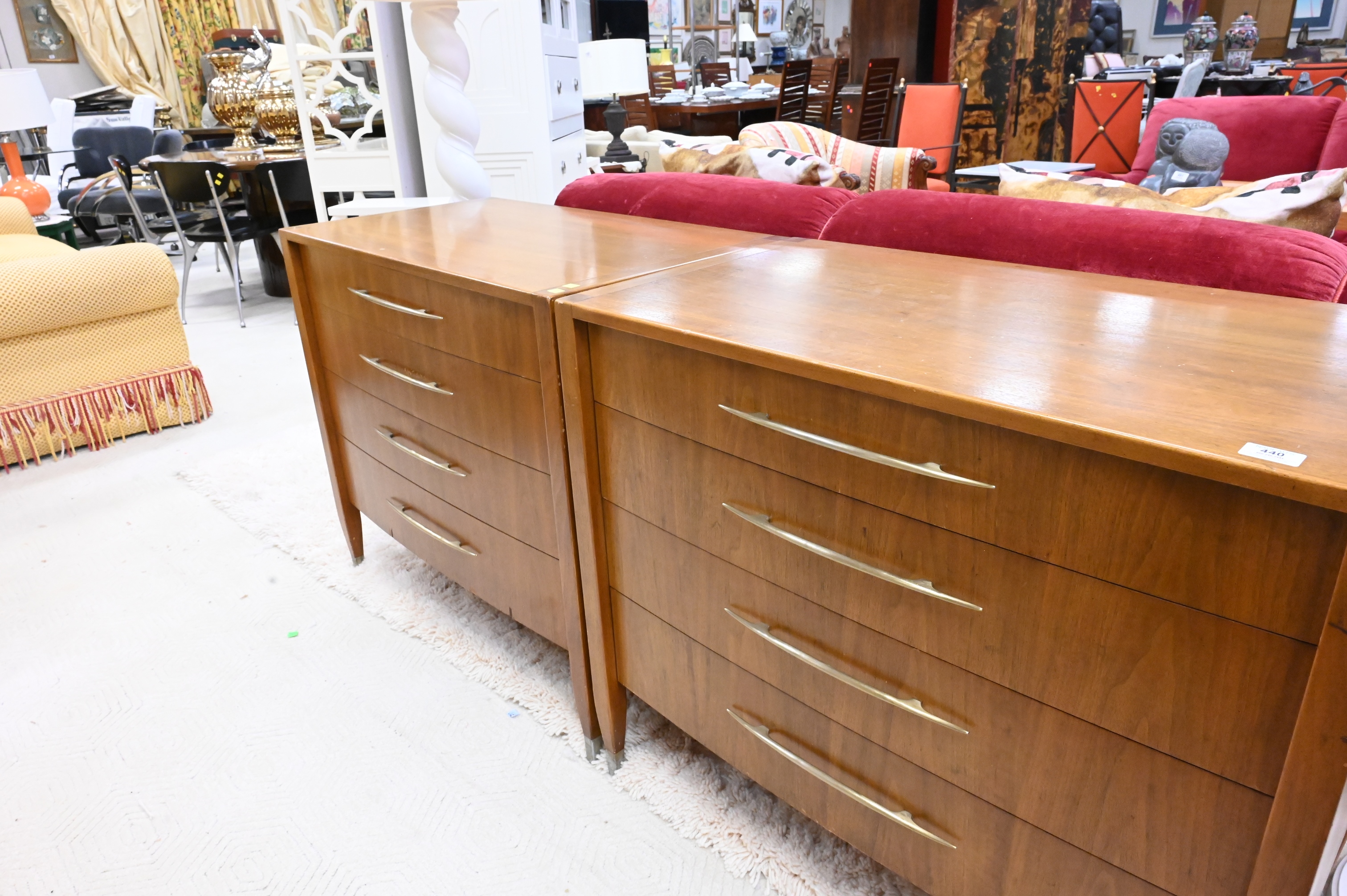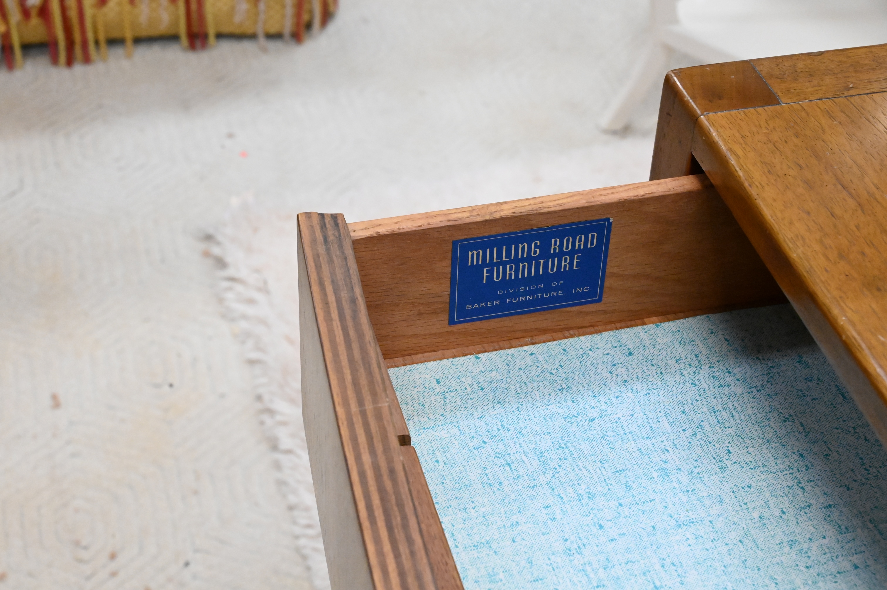 Five Piece Lot, to include a pair of Milling Road for Baker four drawer chests, a pair of marble top nightstands one as is, along with a matching tall chest by Sleigh, height 32 inches, top 20″ x 36″.