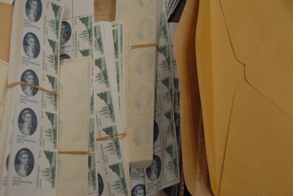 Lot 440: Two box lots of seven books of mint sheets of stamps, envelopes, and large quantity of 13cent stamps approximately 2000.
