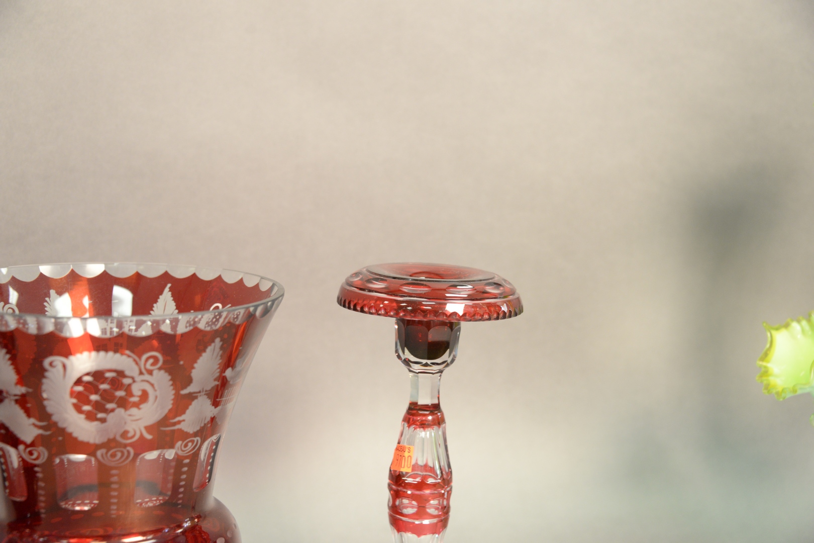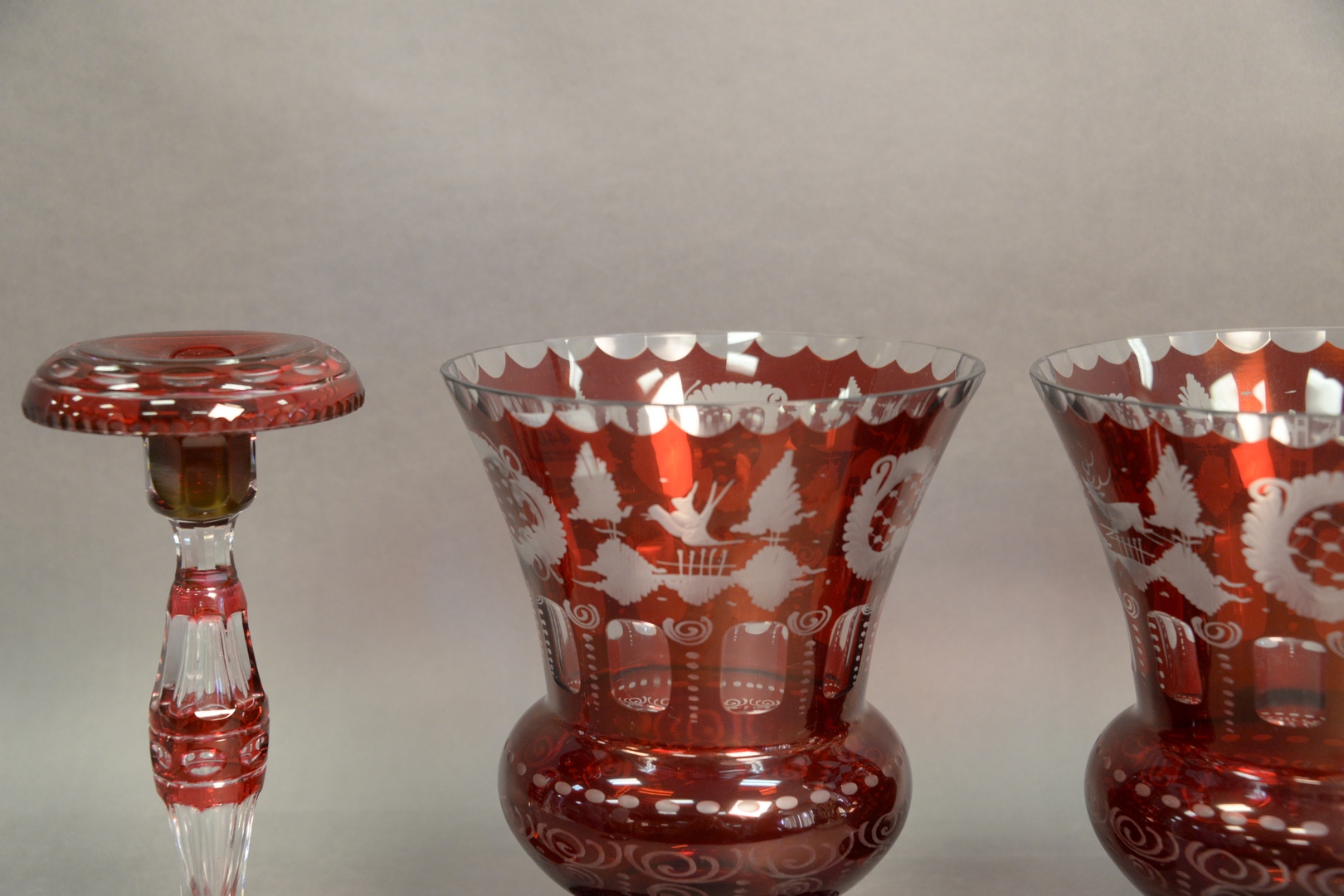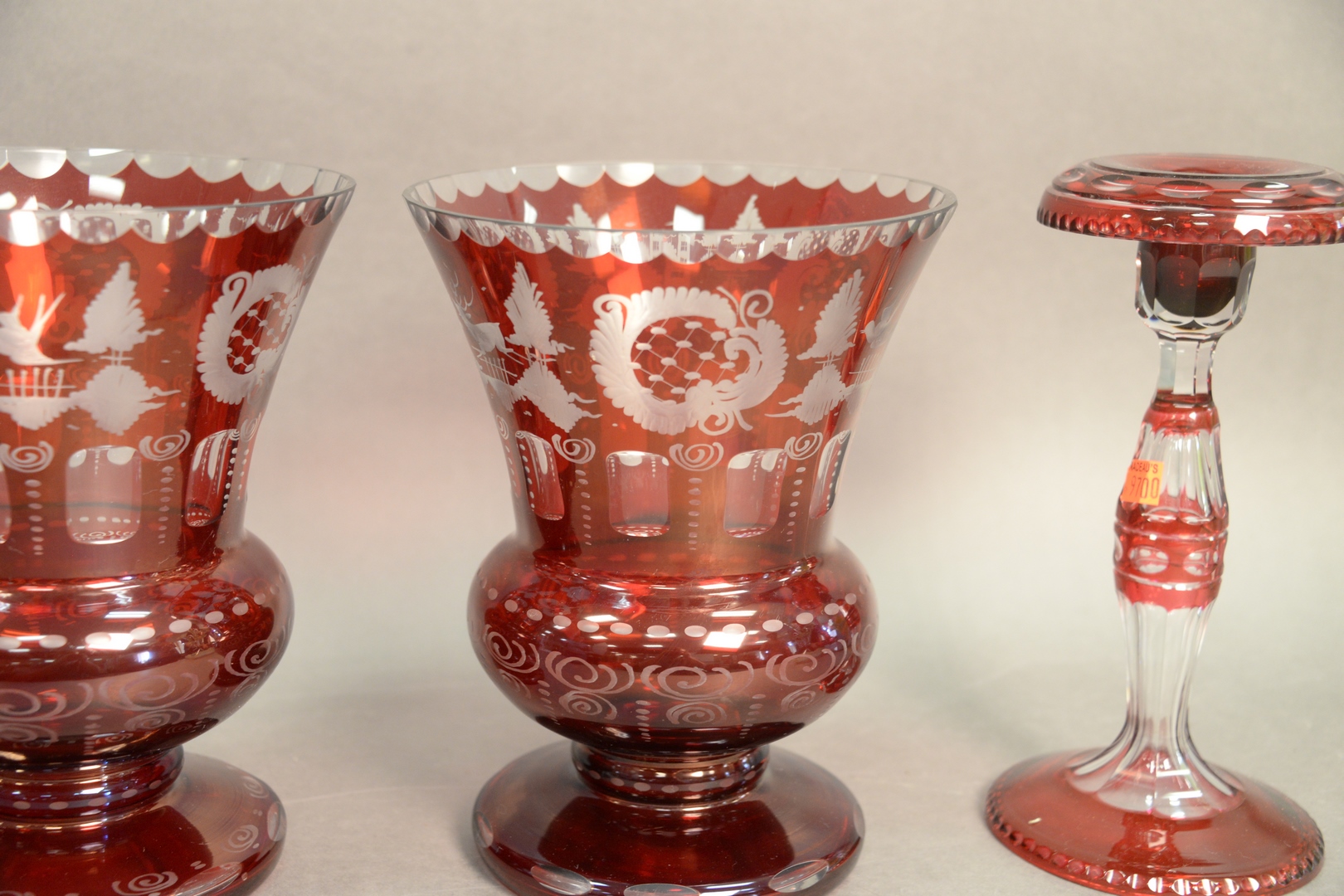 Lot 440: Two Pairs of Cranberry Cut to Clear Glass, to include a pair of candlesticks having flared rims, along with a pair of vases with castle, bird, and stag decoration, heights of vases 10 1/2 inches, heights of candlesticks 10 1/4 inches. Provenance: Estate of James Wadhams