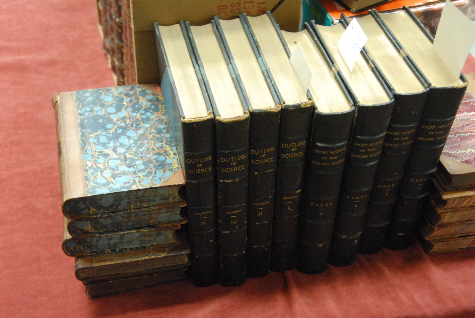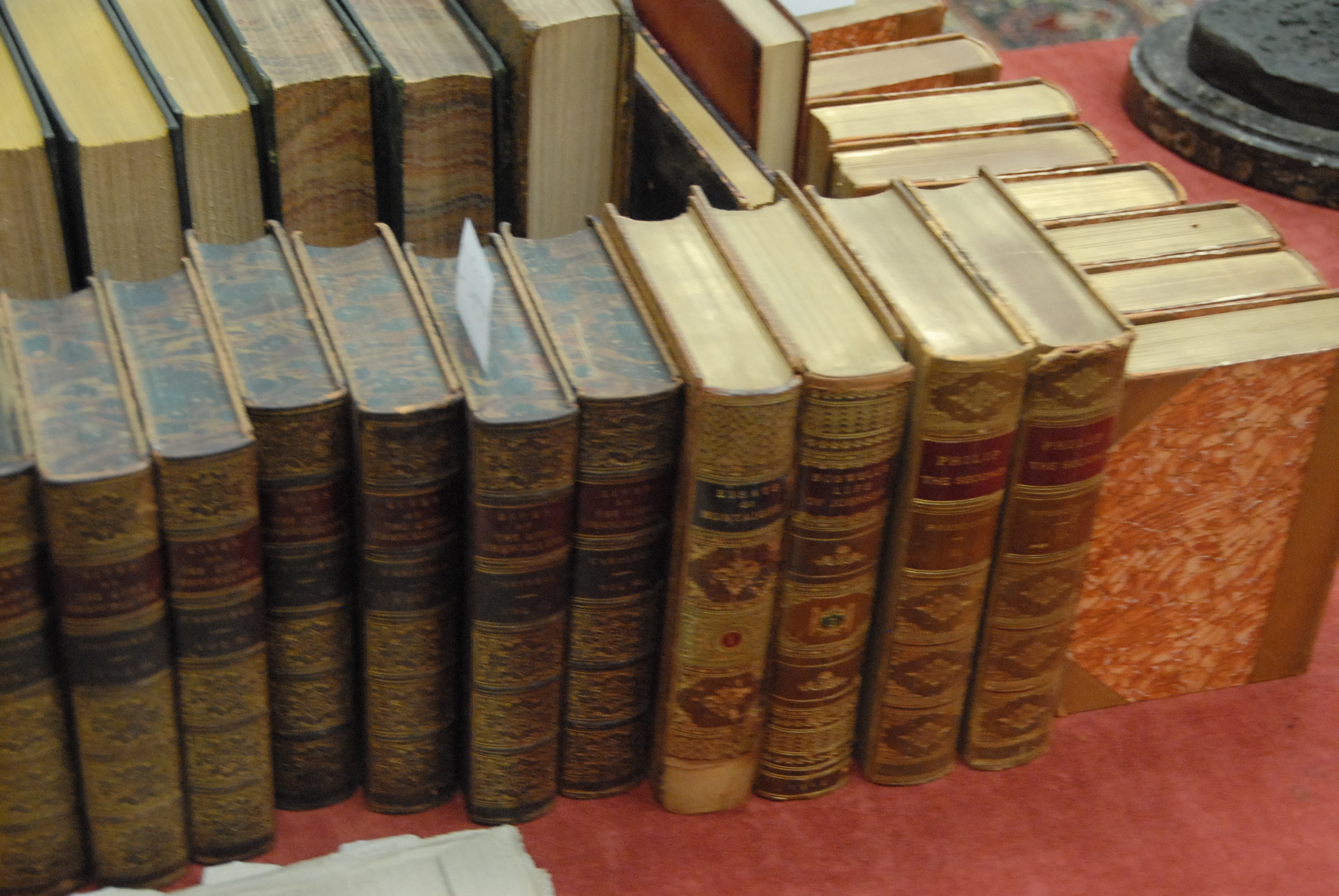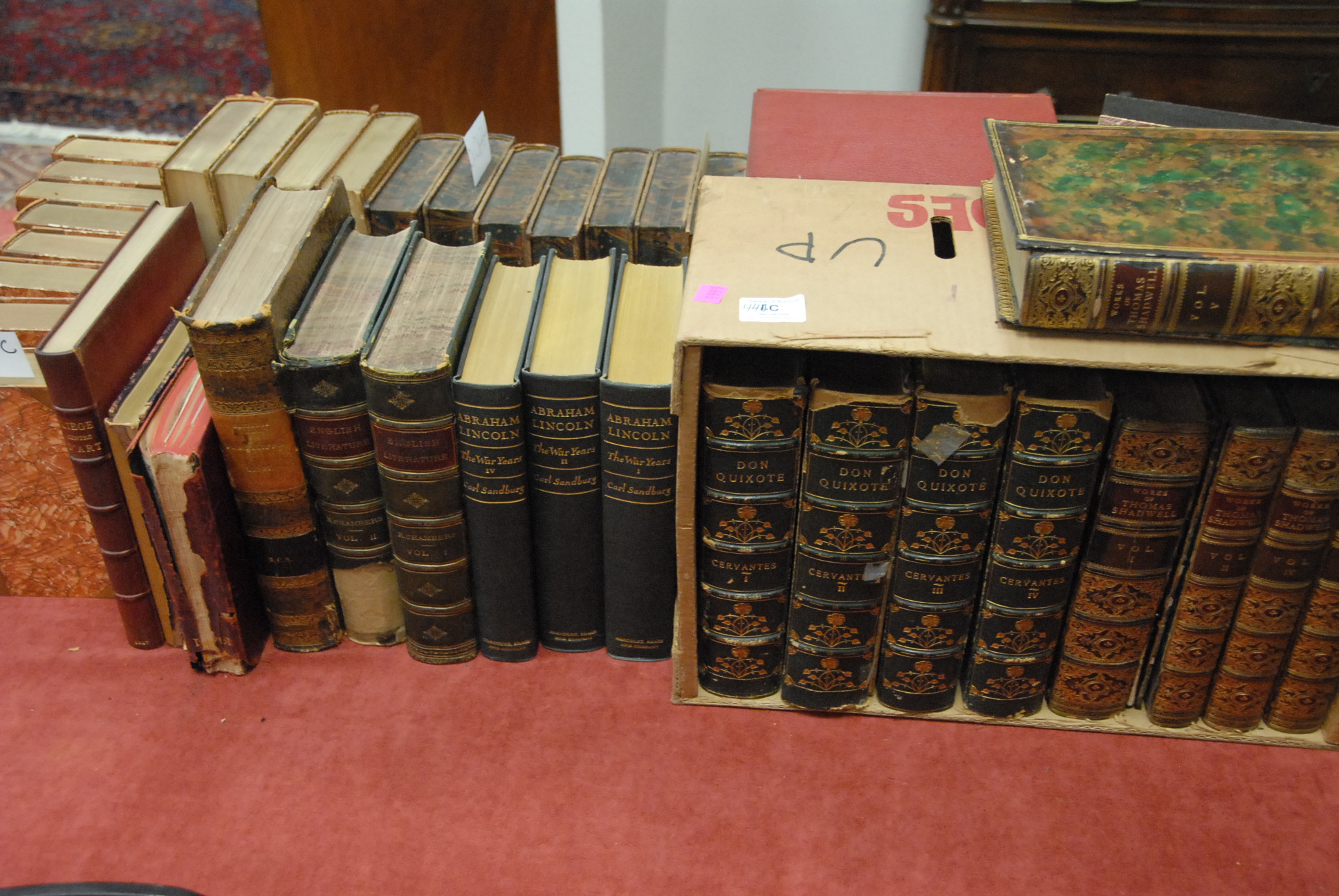 Seventy leather books including Cervantes Don Quixote, Works of Thomas Shadwell, Short History of the English People, Abraham Lincoln The War Years, Works of Abraham Lincoln, Lives of the Lord Chancellors, Lamb’s Works, Dewey’s Works, etc., from the library of Theodore Weicker.