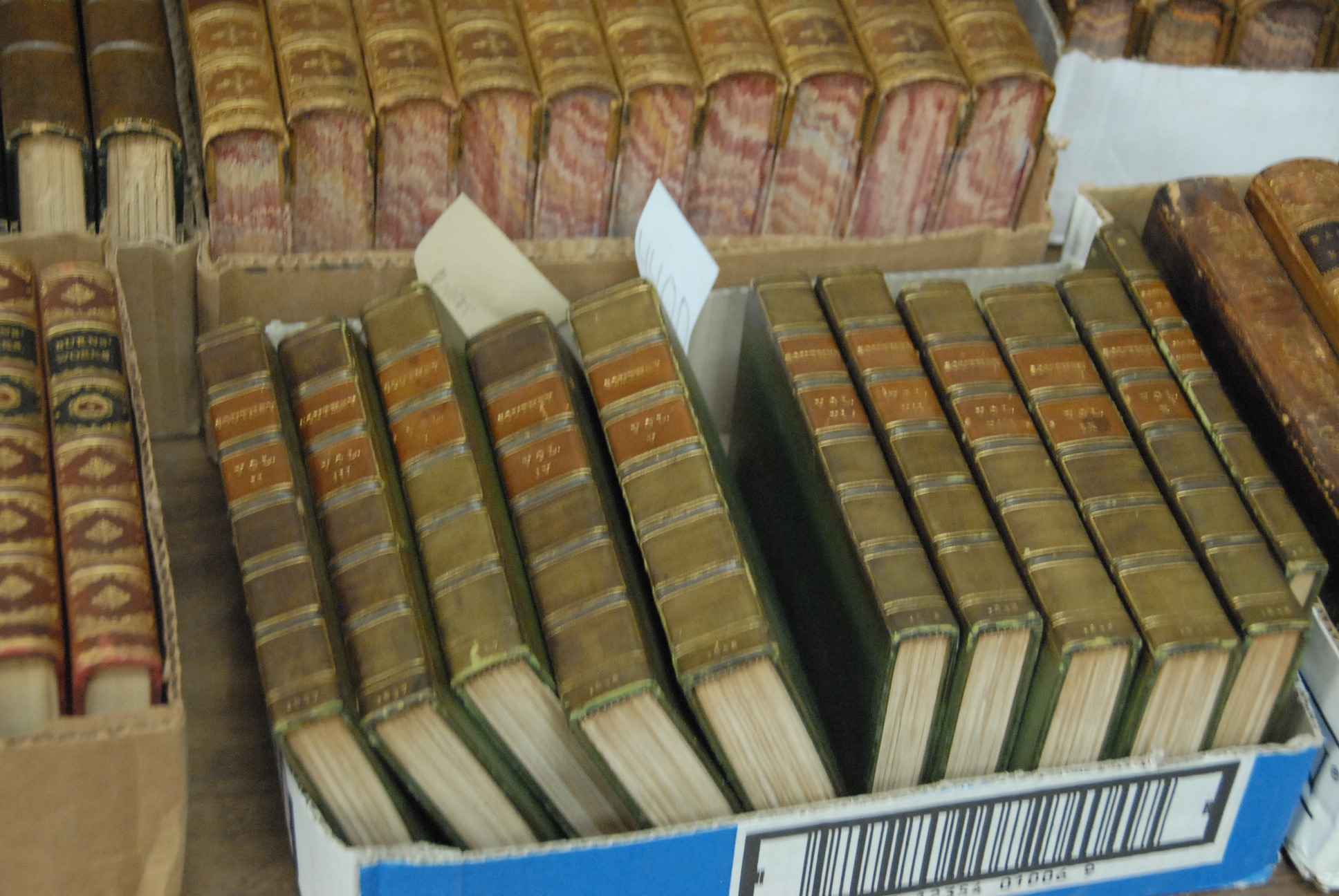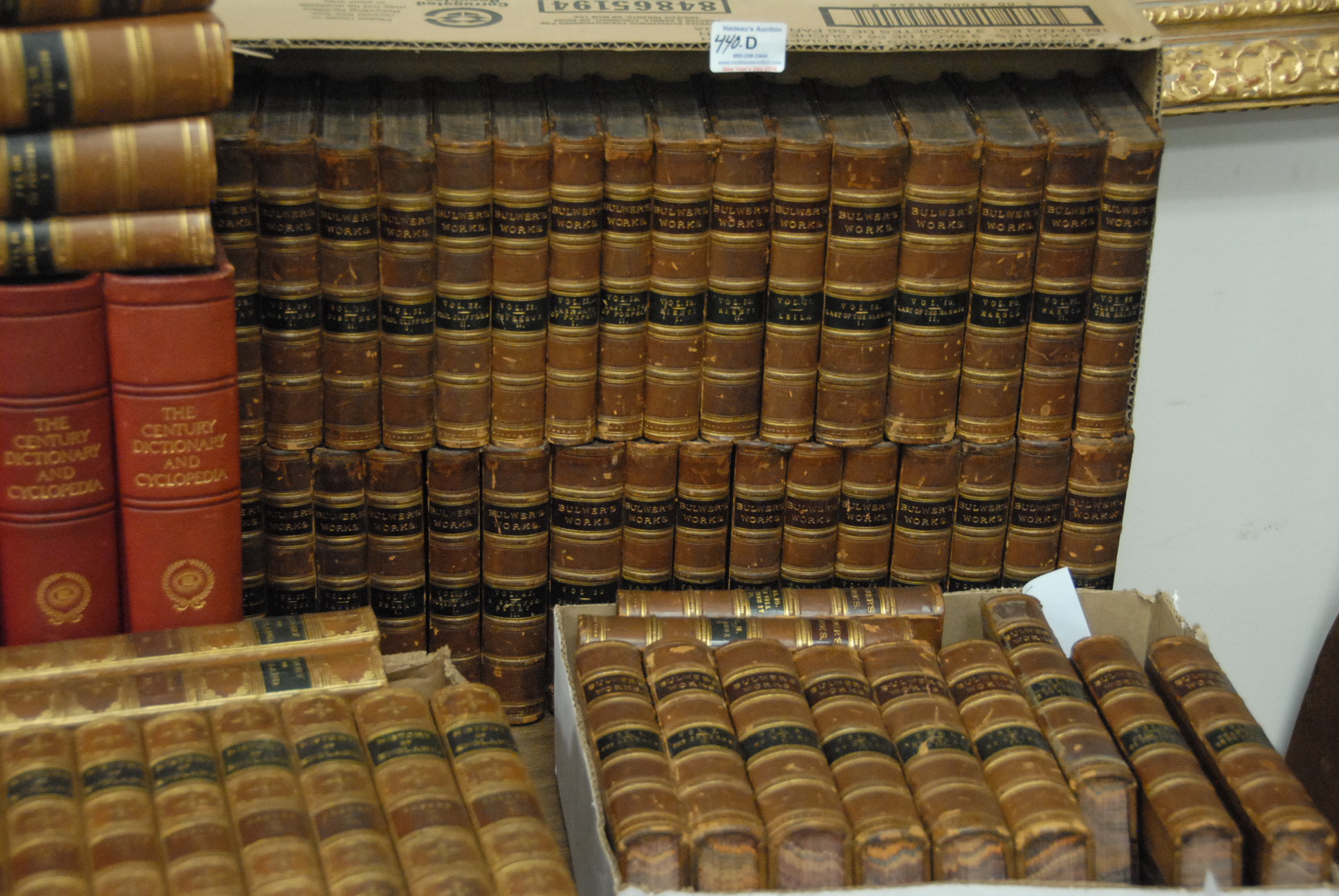 Lot 440D: Leather bound books including Edgar Allan Poe, Burns’ Works, Bulwer’s Works, Macauley’s Essays, History of England etc., 122 books total, from the library of Theodore Weicker.