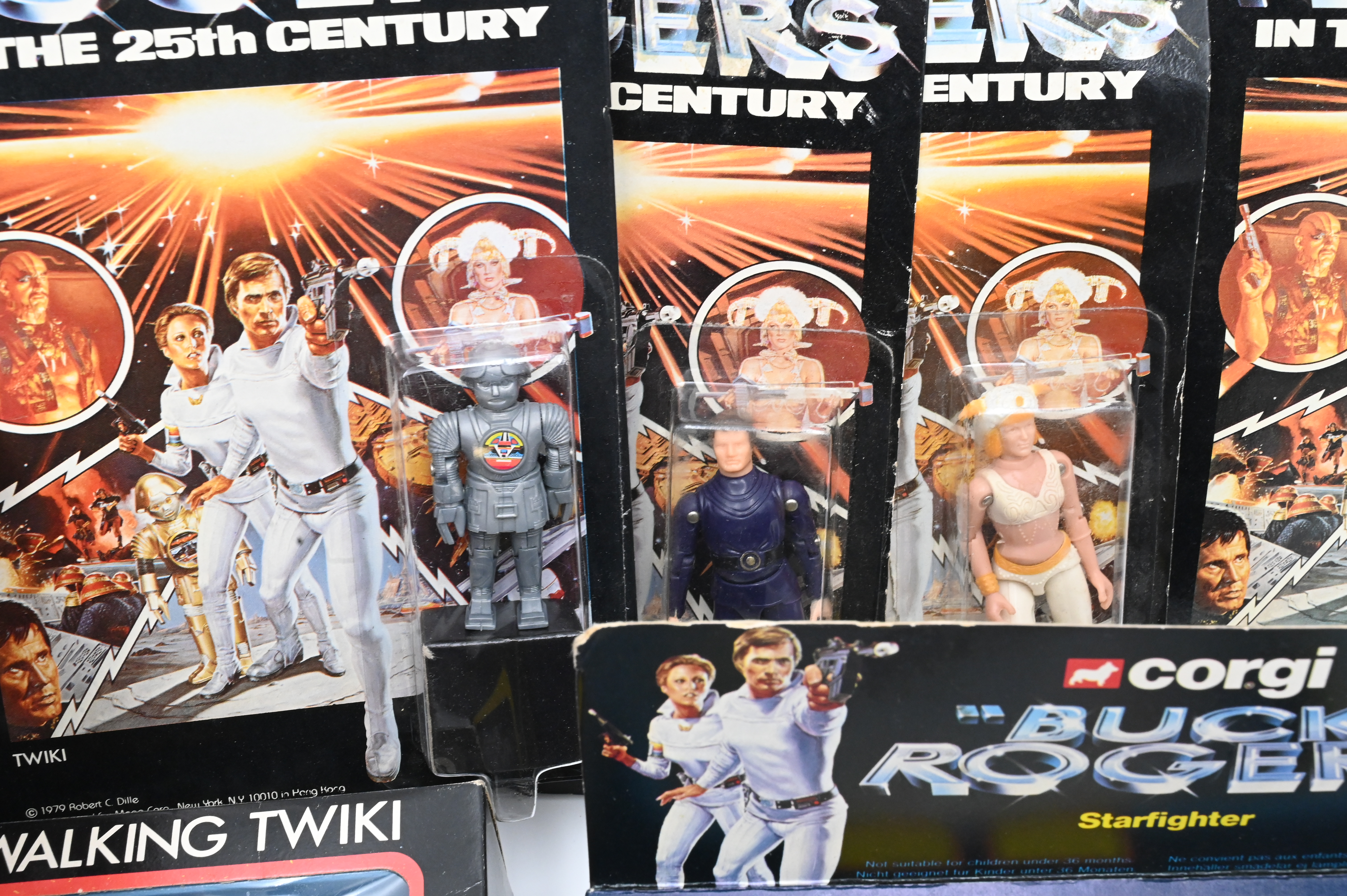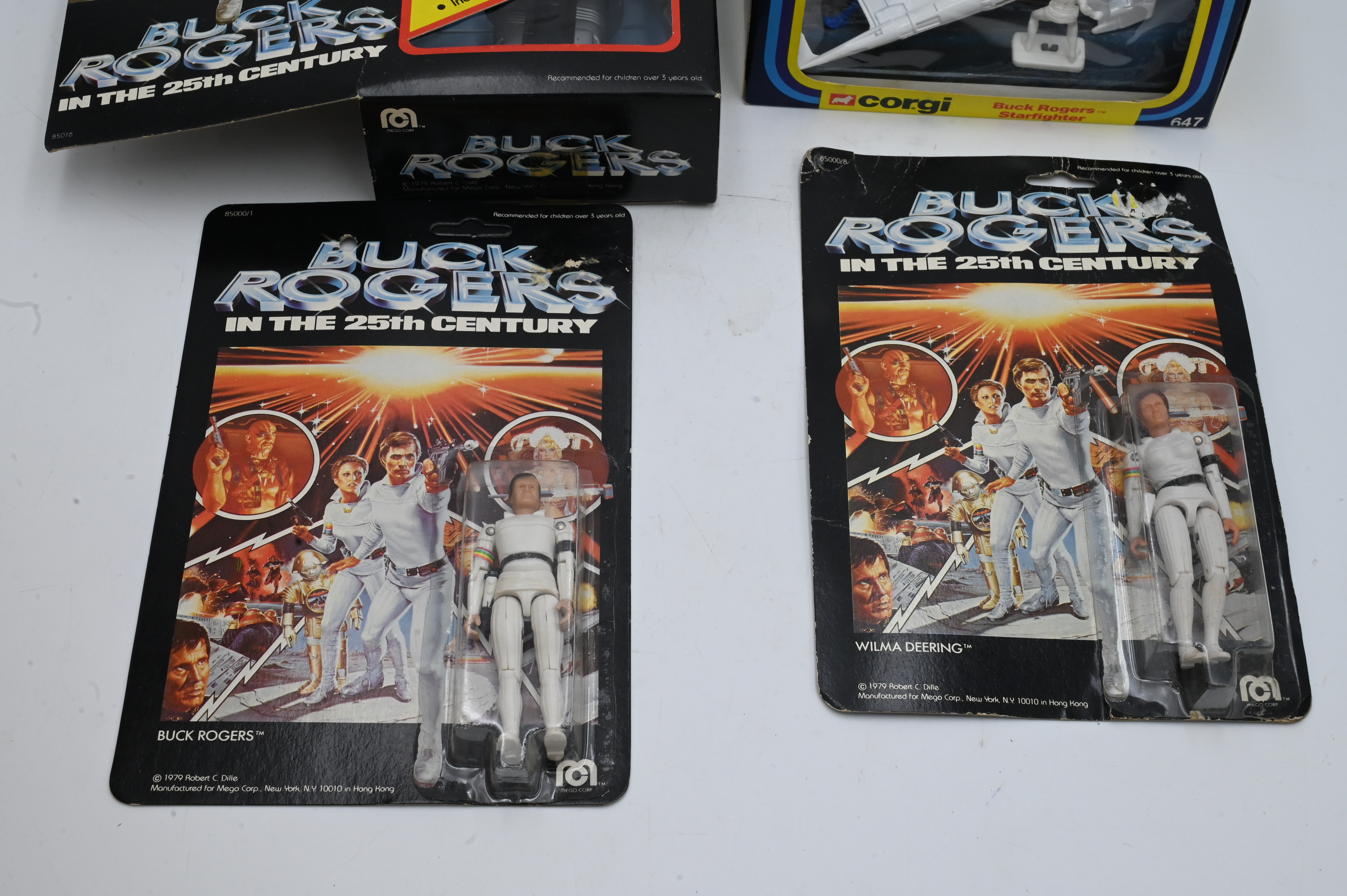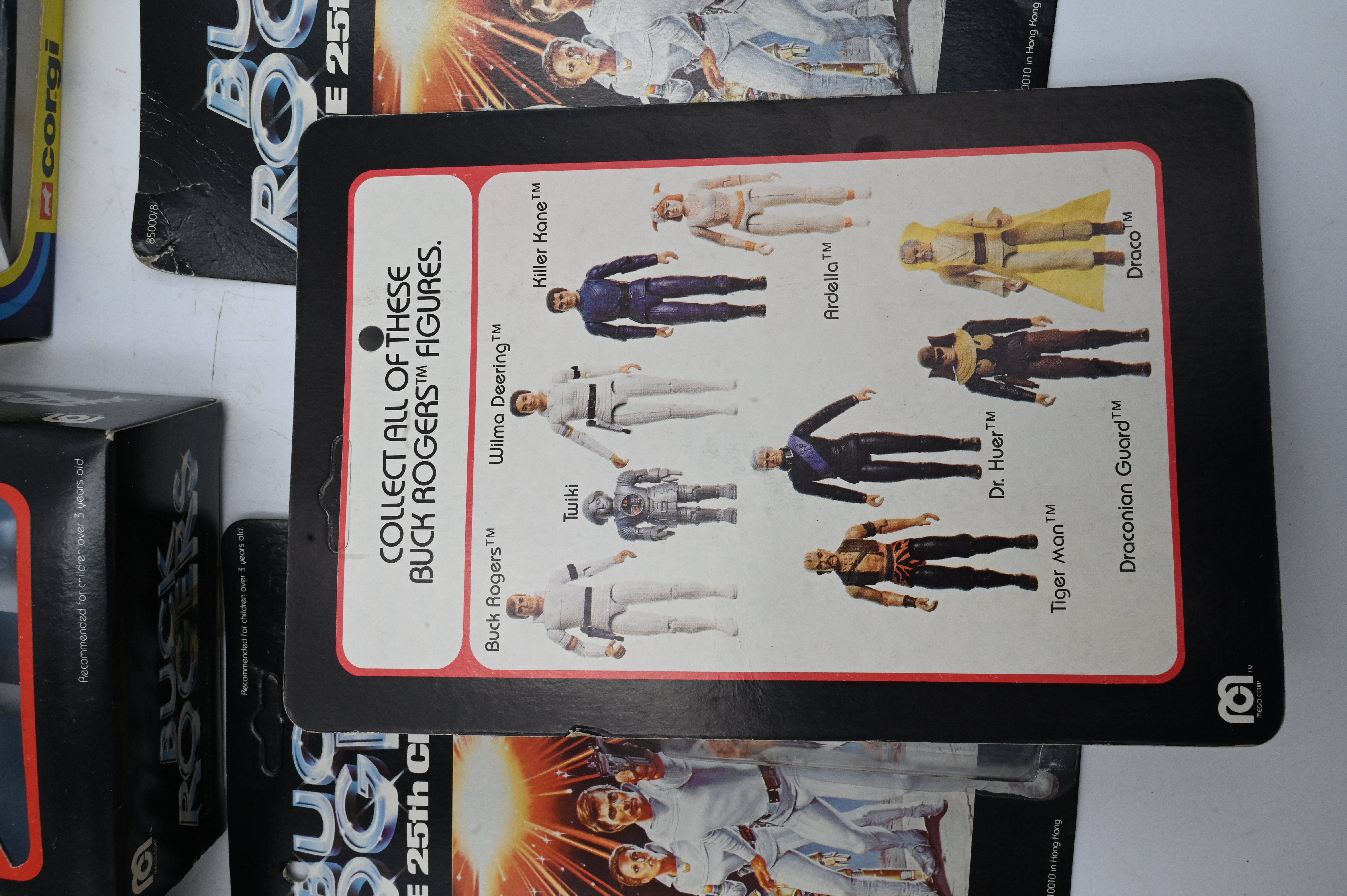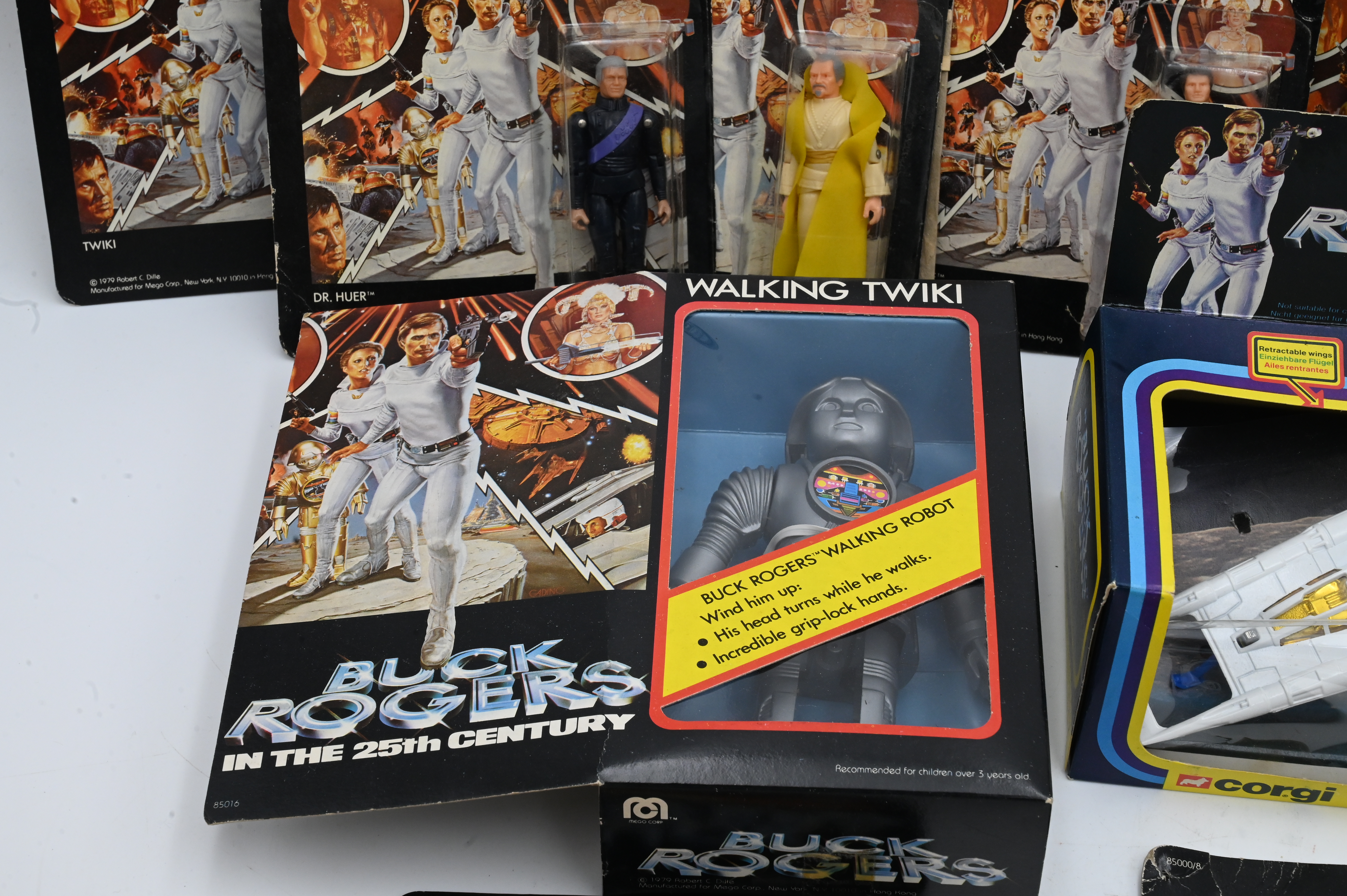 11 Piece Buck Rogers 1979 Memorabilia Lot, to include 9 Mego Corp action figures, Mego Corp Walking Twiki, along with a Corgi 1979 star fighter, all in original packaging, (as is).