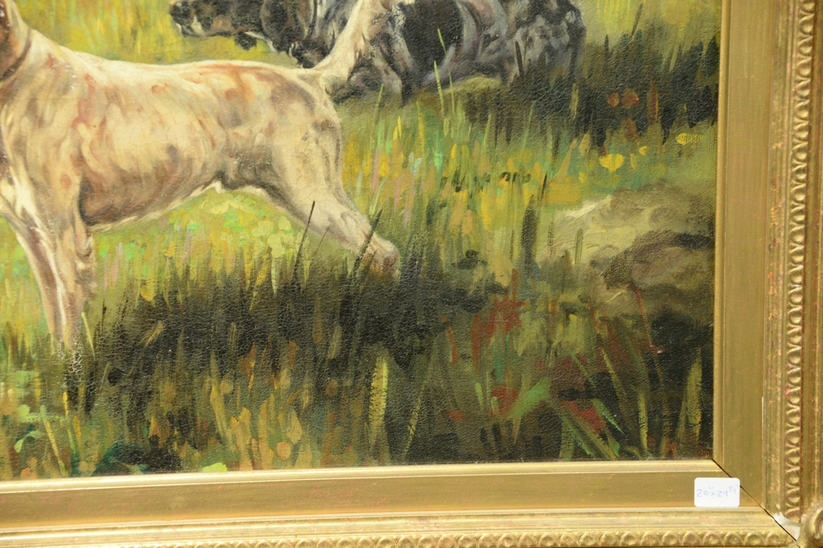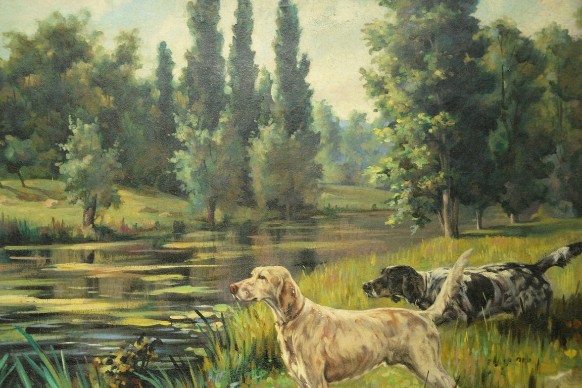 Lot 441: After Percival Leonard Rosseau 1859-1937 oil on canvas Pair of Pointers by a Pond, marked lower left Rosseau 1925. 20 x 24