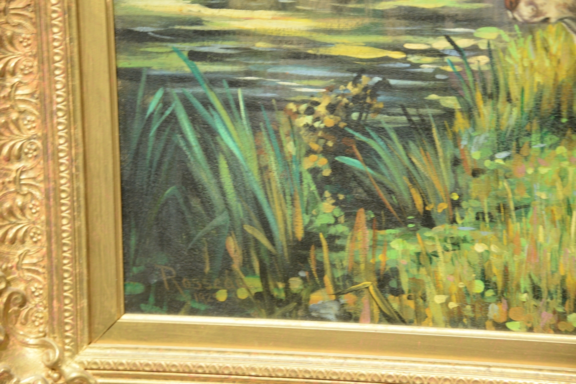 After Percival Leonard Rosseau 1859-1937 oil on canvas Pair of Pointers by a Pond, marked lower left Rosseau 1925. 20 x 24