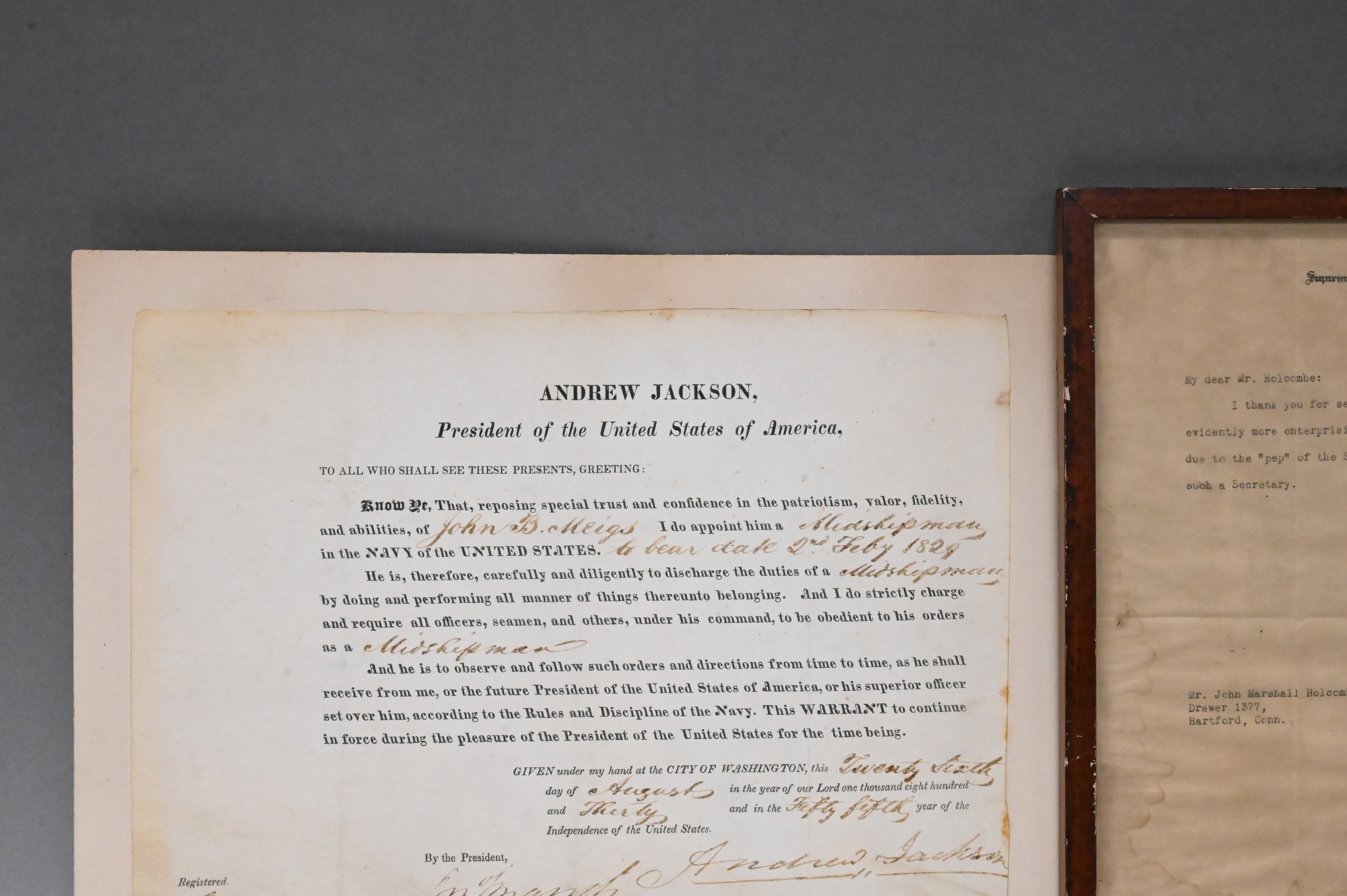 Lot 441: Andrew Jackson Signed Document Appointing John Meigs Midshipman 1829