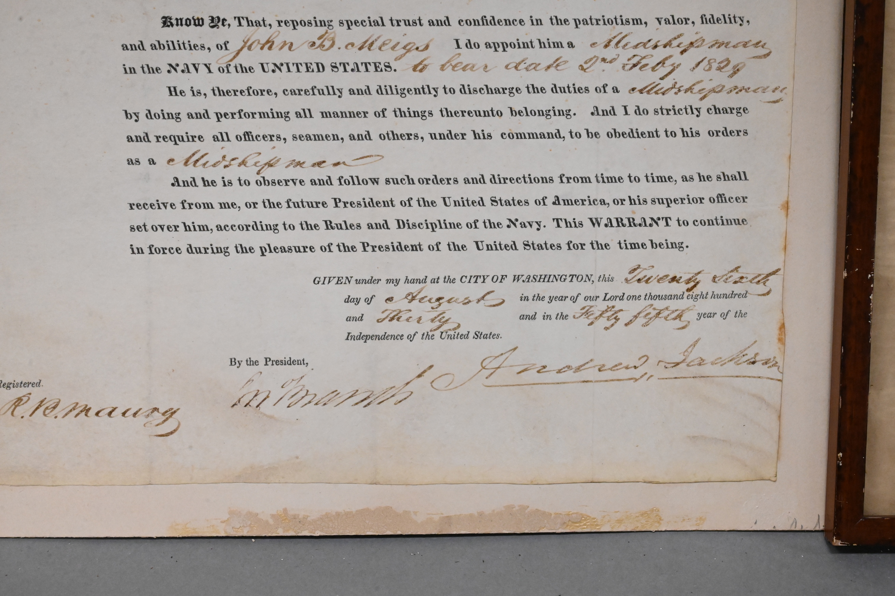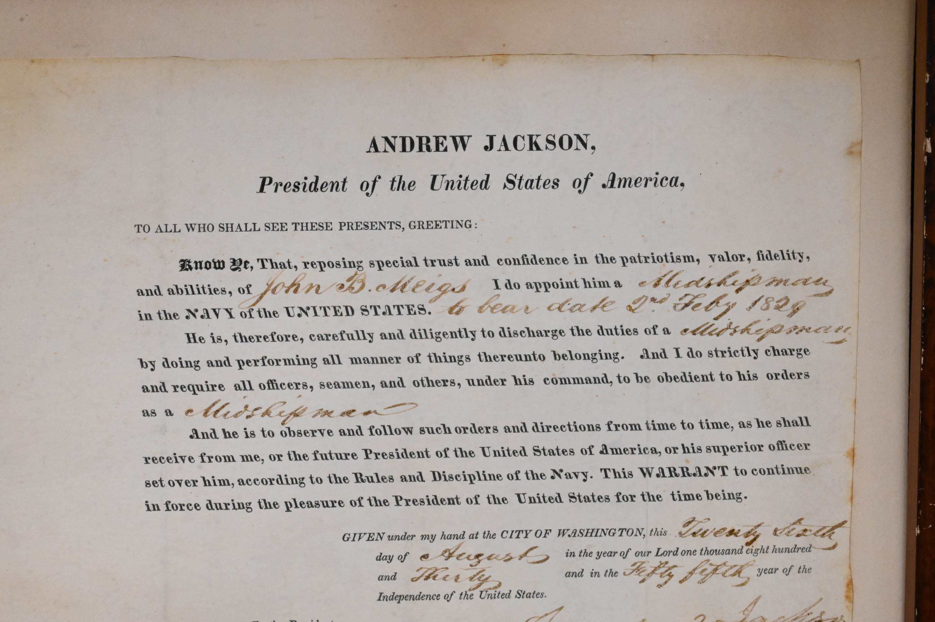 Andrew Jackson Signed Document Appointing John Meigs Midshipman 1829