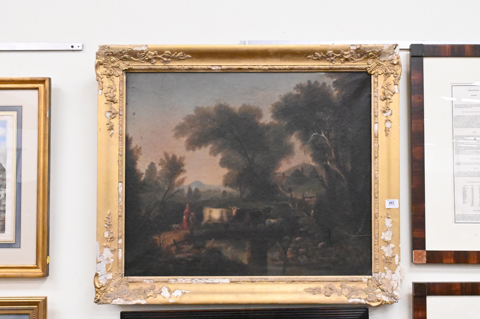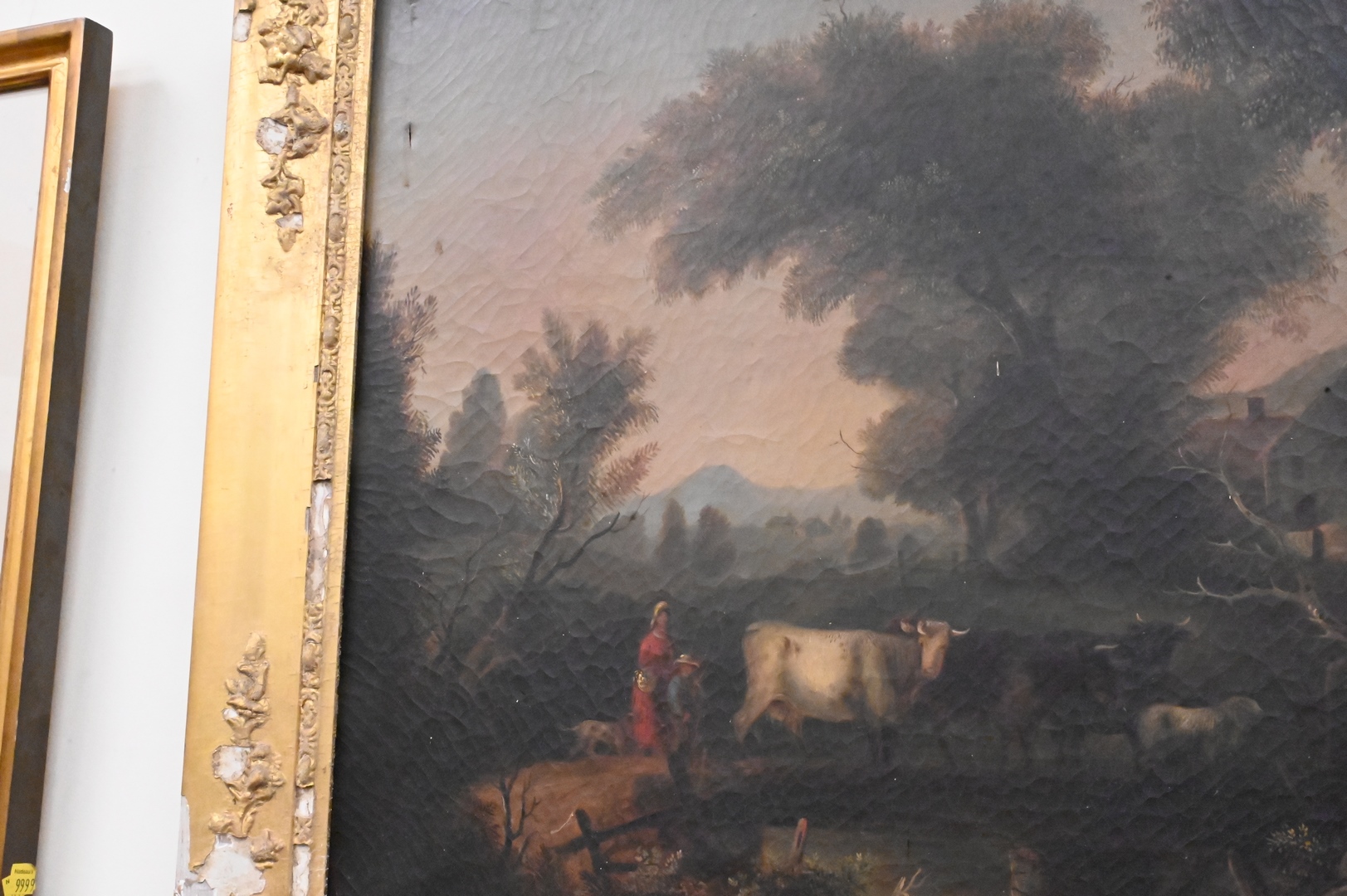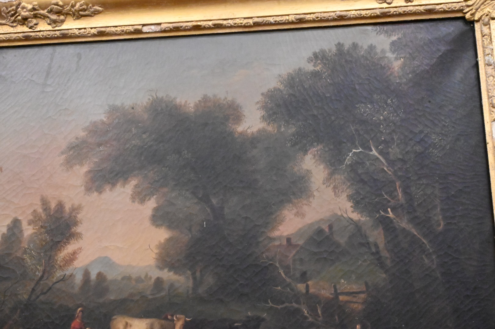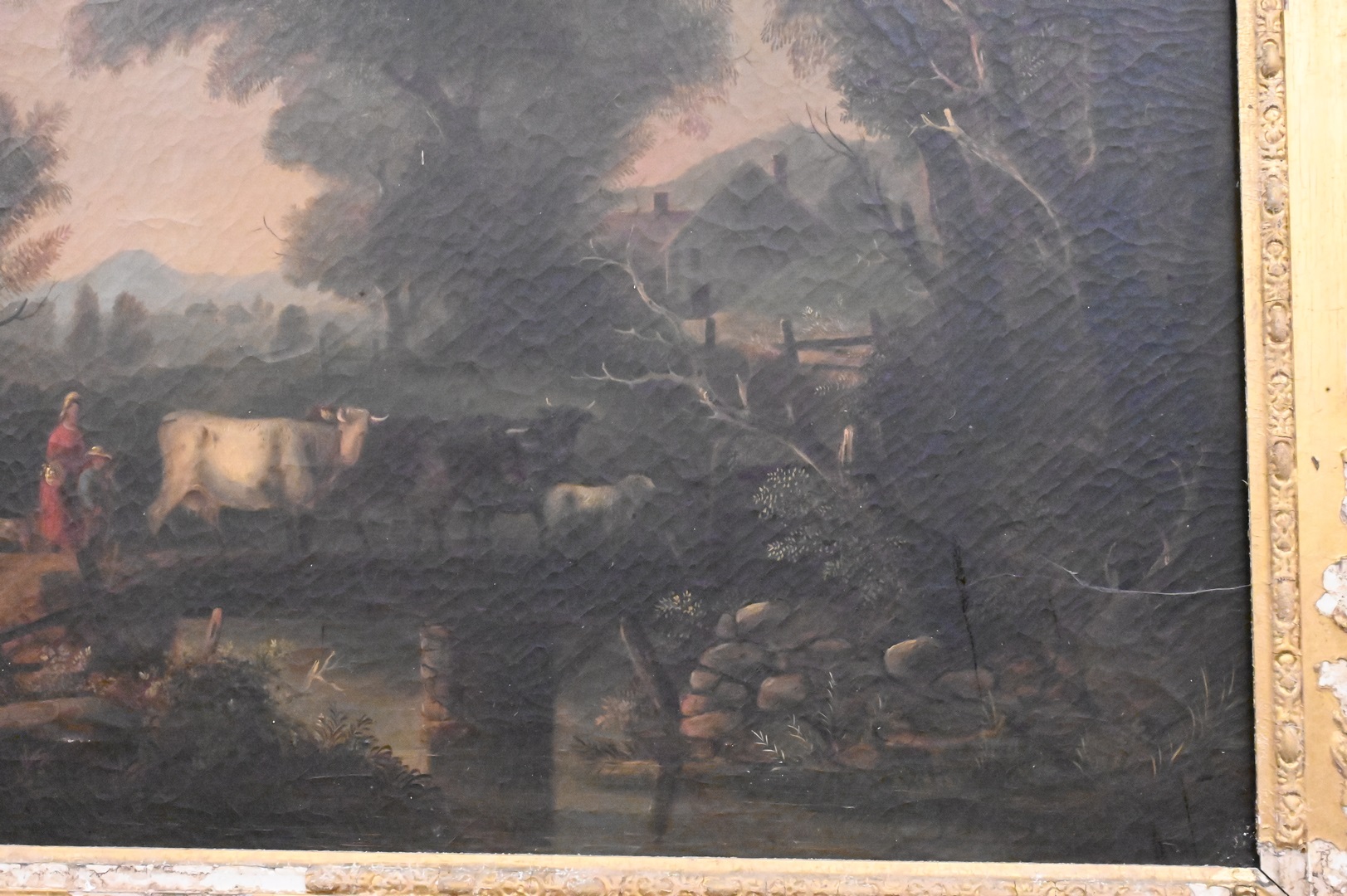 Continental School, farm landscape, having figures and animals, oil on canvas, 18th century or later, 25″ x 30″. Provenance: Estate of Florence Yannios, Cheshire, CT.
