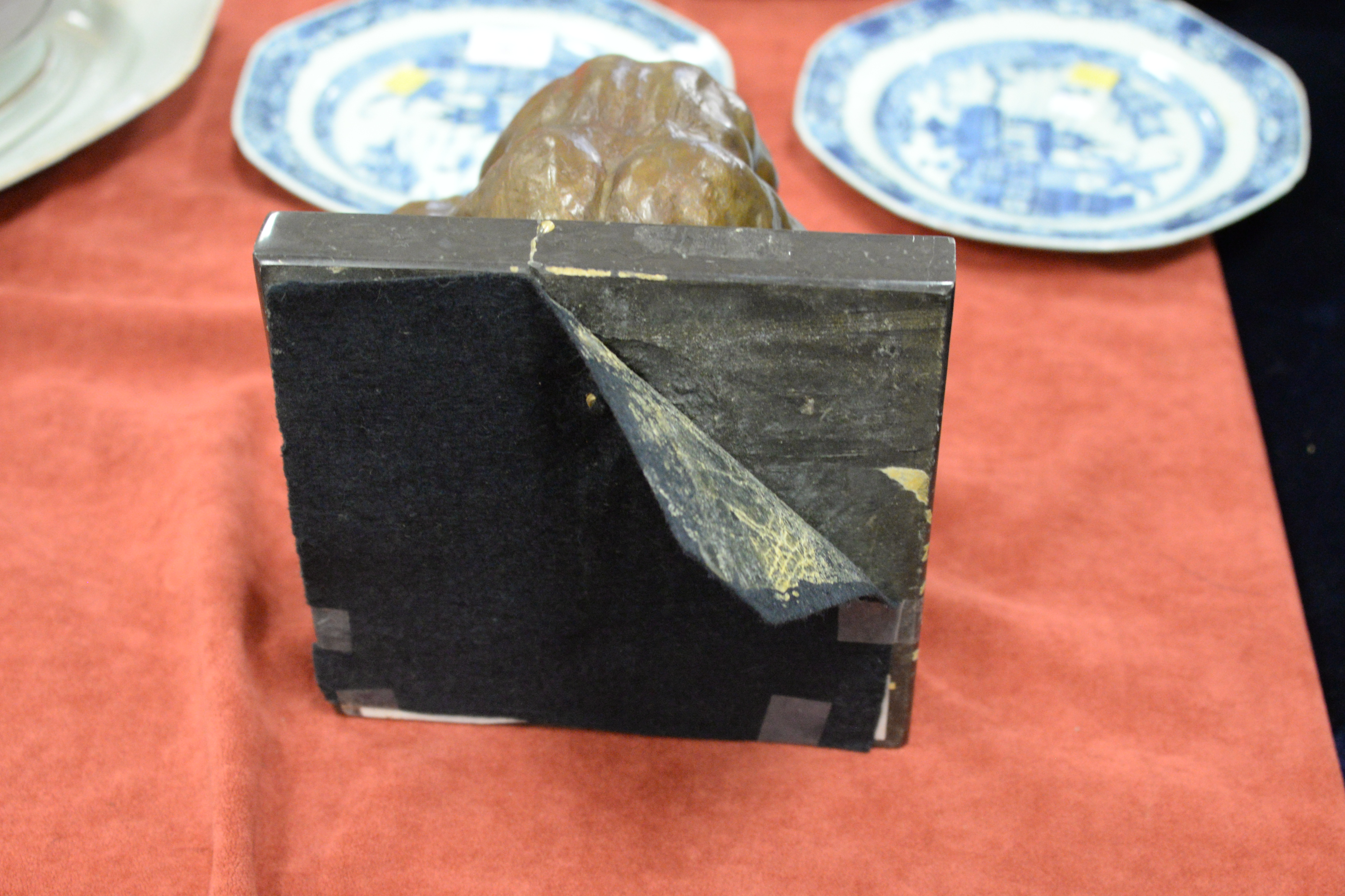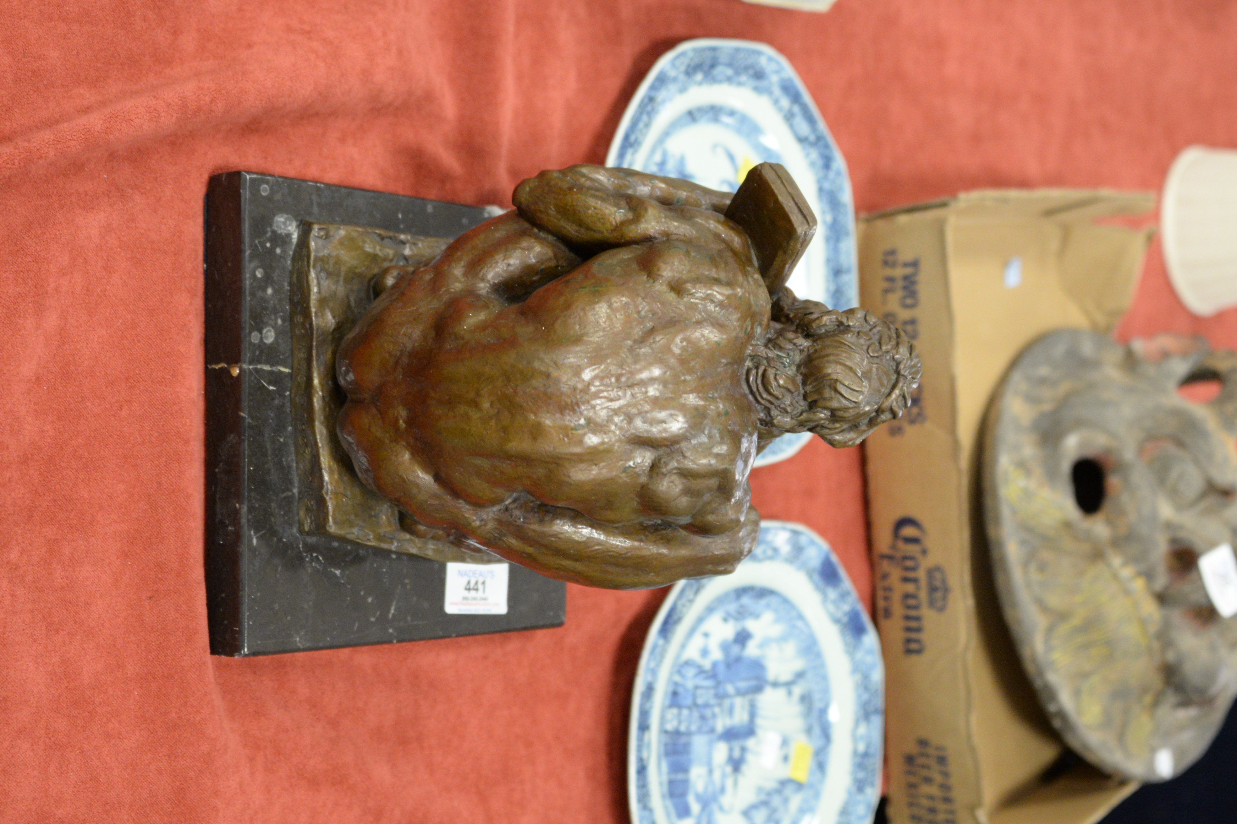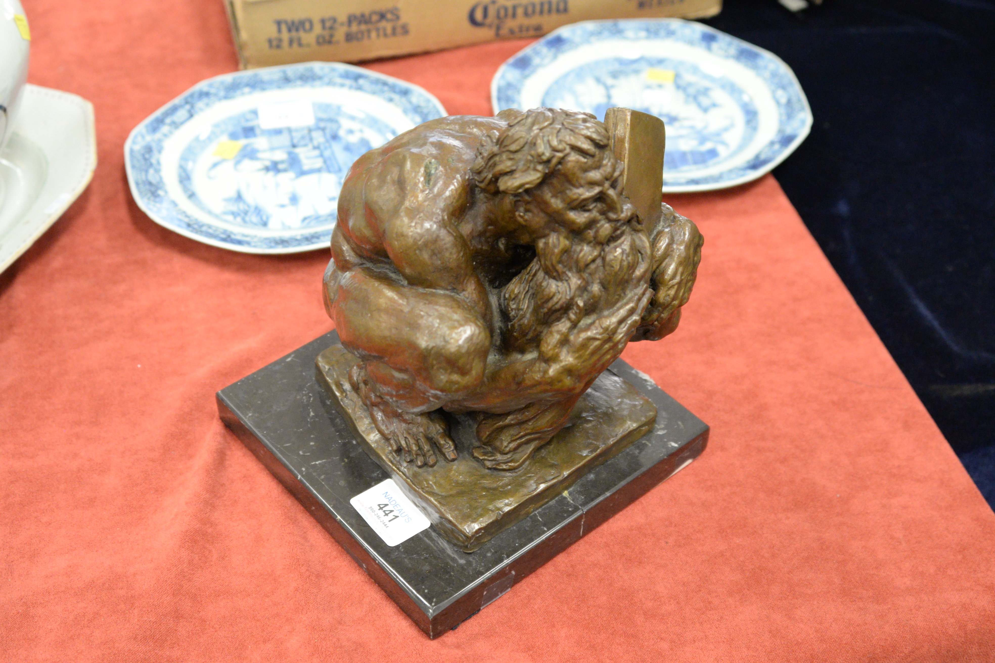 Bronze sculpture of a nude bearded Moses hunched over holding the Ten Commandments,