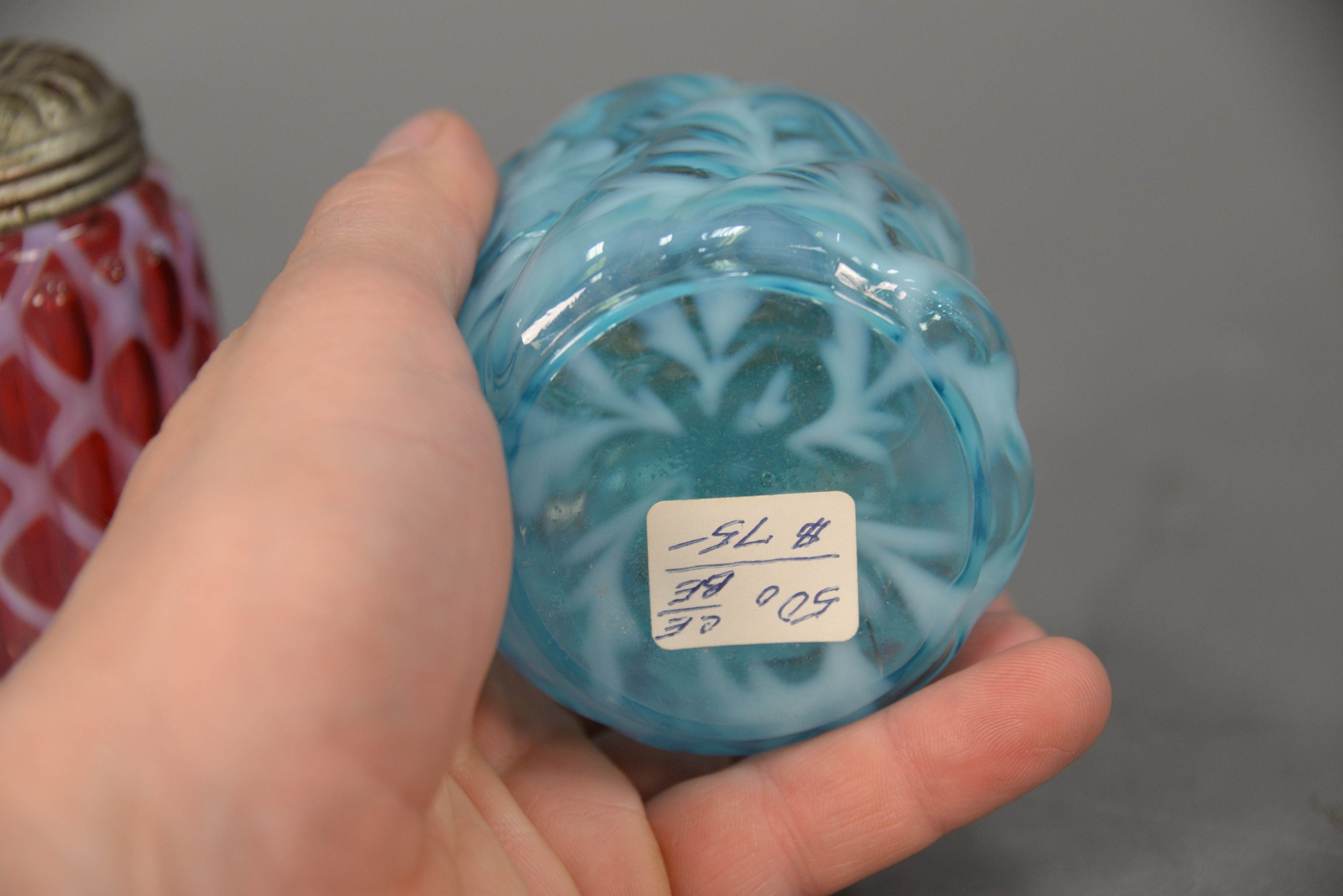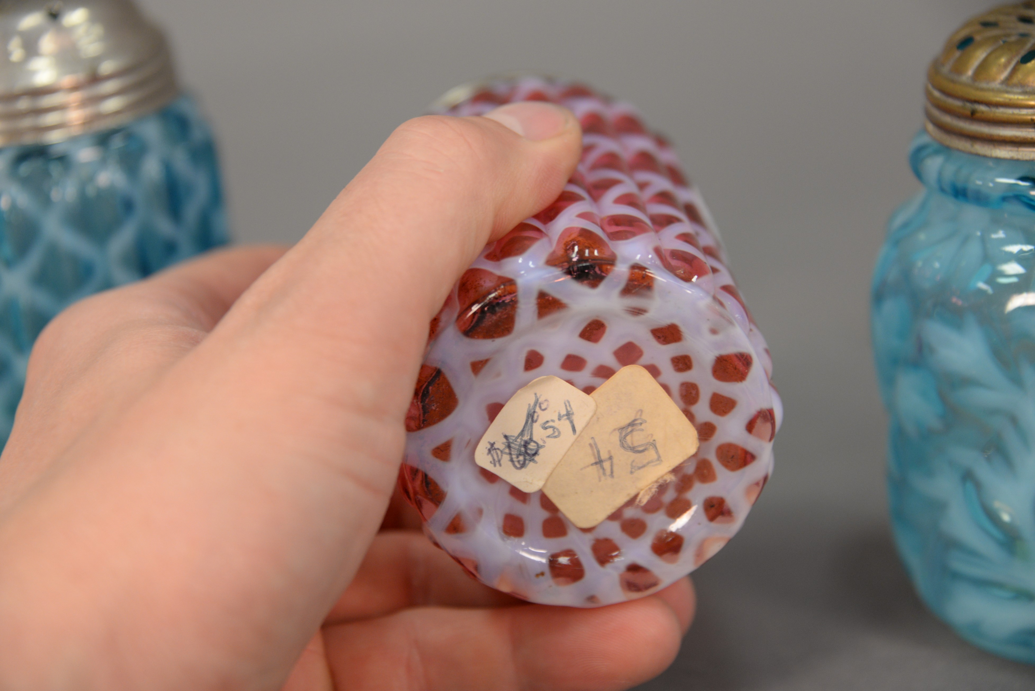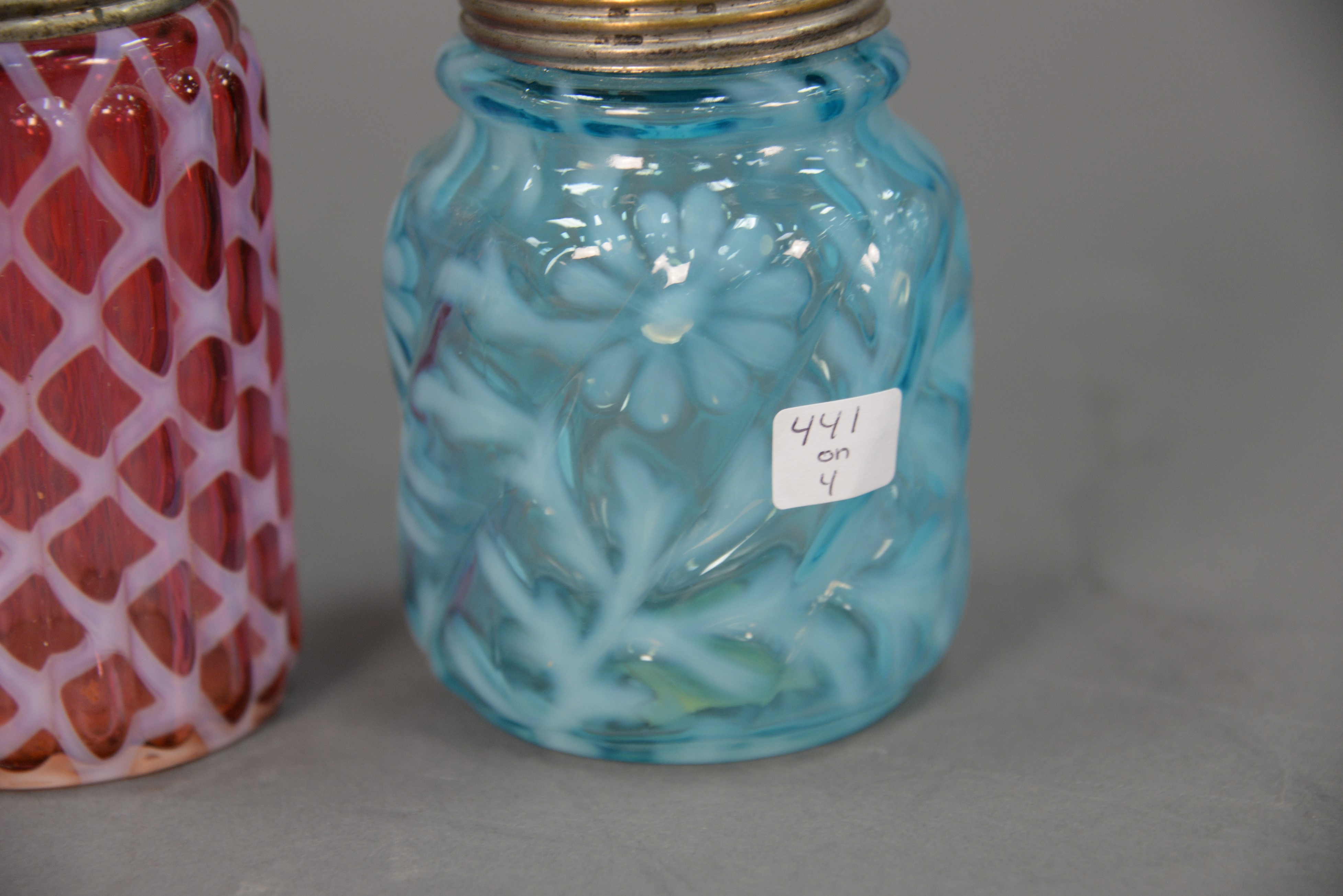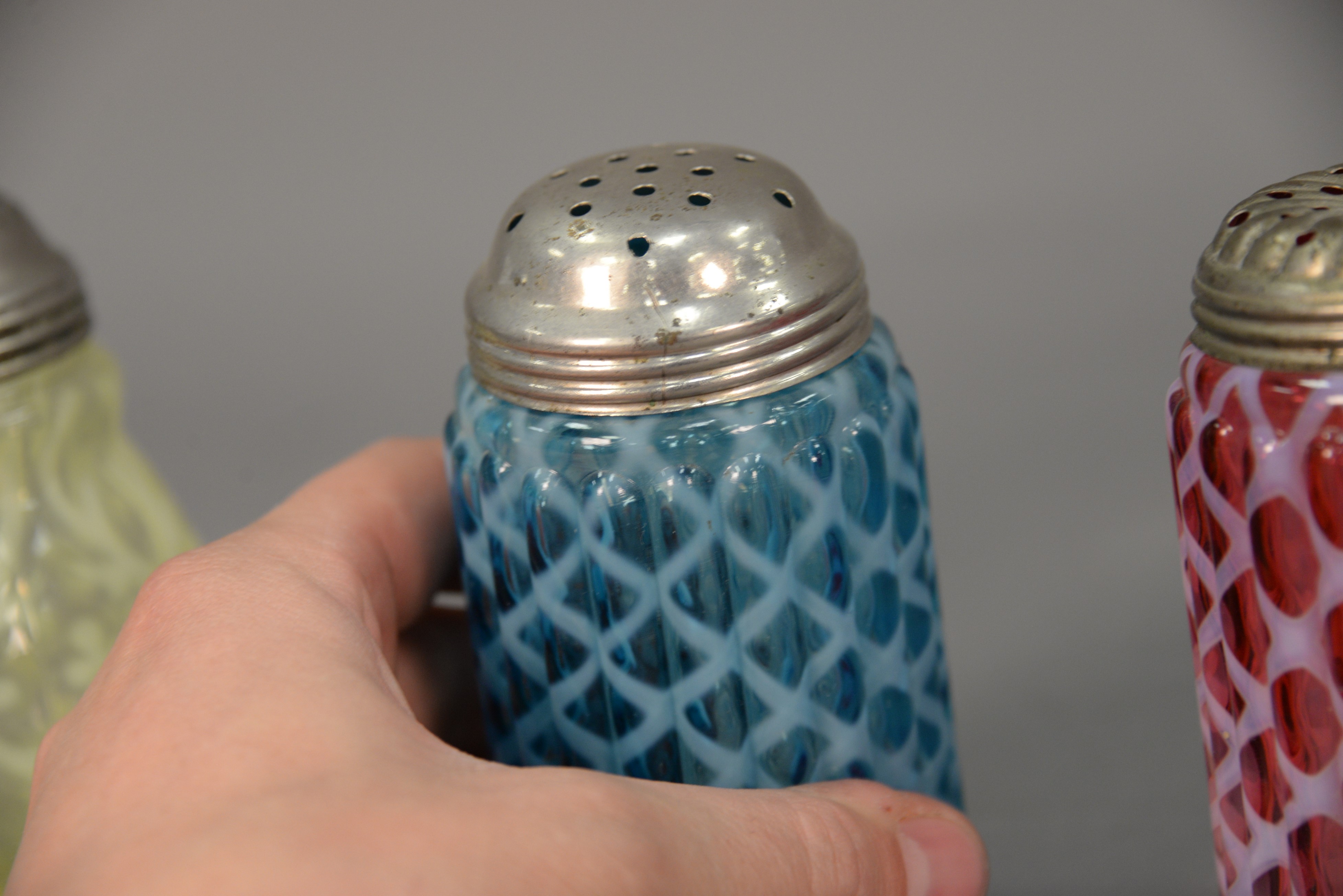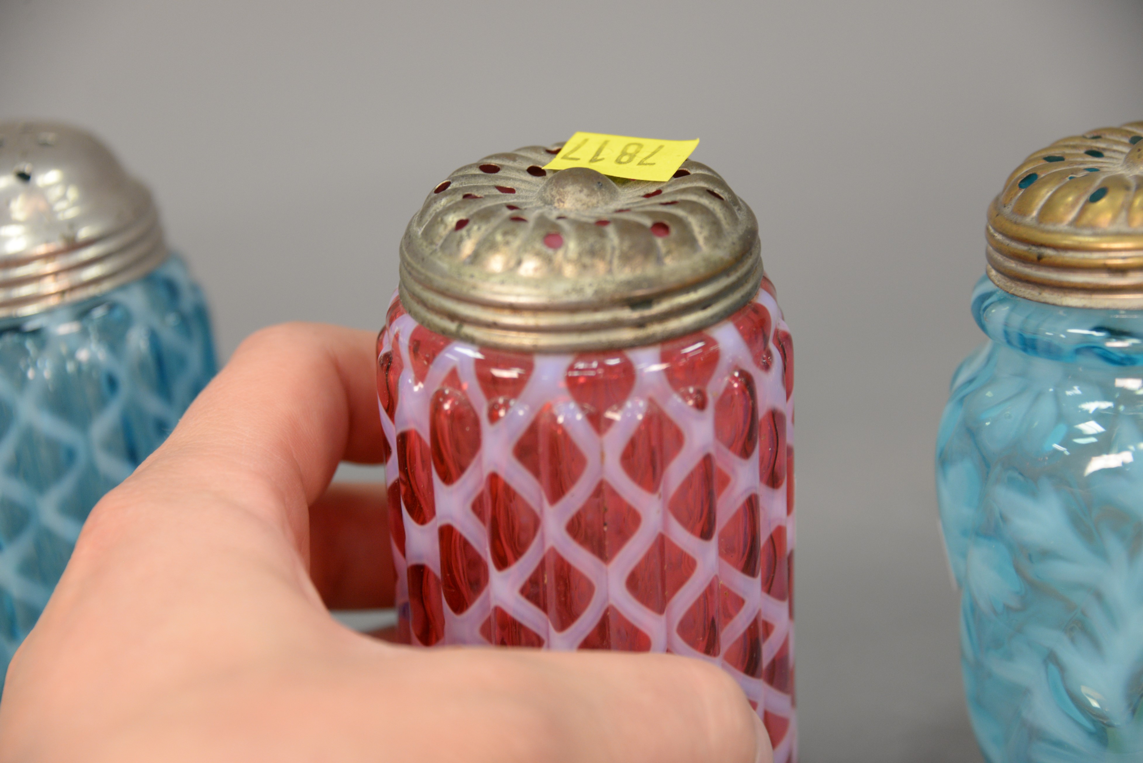 Lot 441: Four color and opalescent glass shakers including cranberry opalescent ribbed shaker, blue with floral designs shaker, ribbed shaker…
