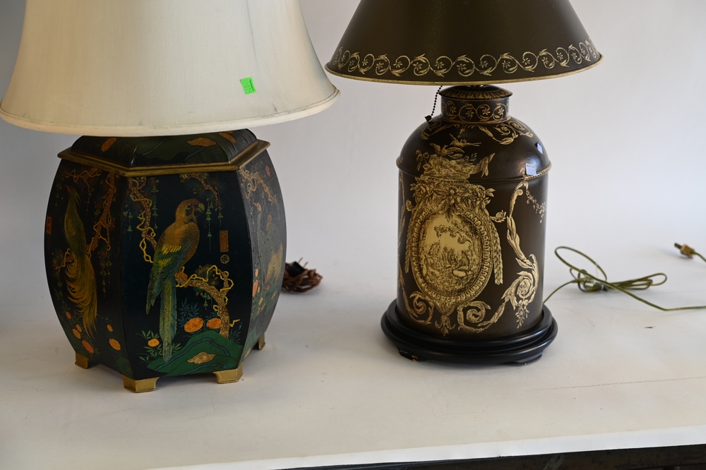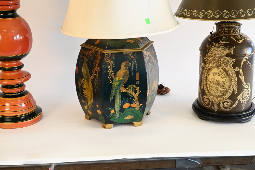 Four Piece Lot of Table Lamps, to include a Chinese style painted metal table lamp having bird motif on each panel, a brown metal ta…