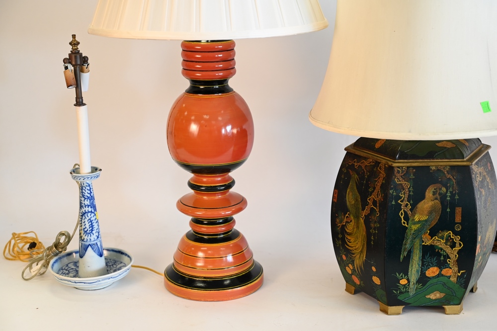 Lot 441: Four Piece Lot of Table Lamps, to include a Chinese style painted metal table lamp having bird motif on each panel, a brown metal table lamp having white painted figural scene on black fitted base, a blue and white porcelain table lamp, along with a carved wood table lamp in red paint, height of tallest overall 36 inches.