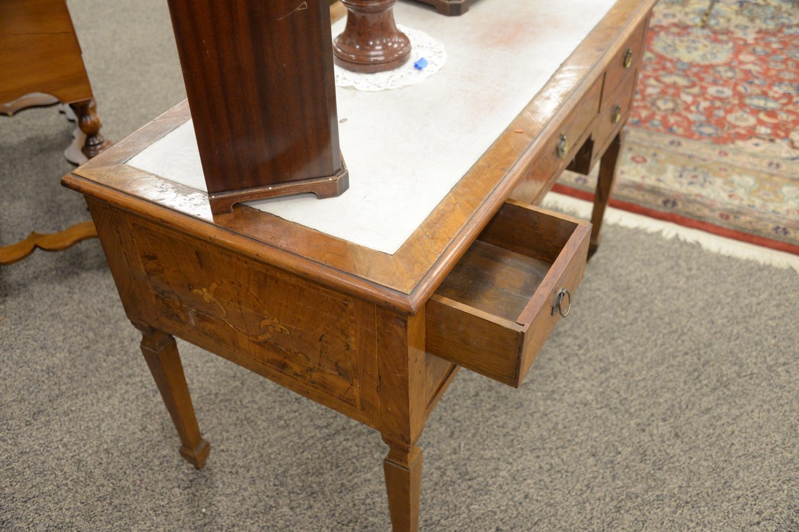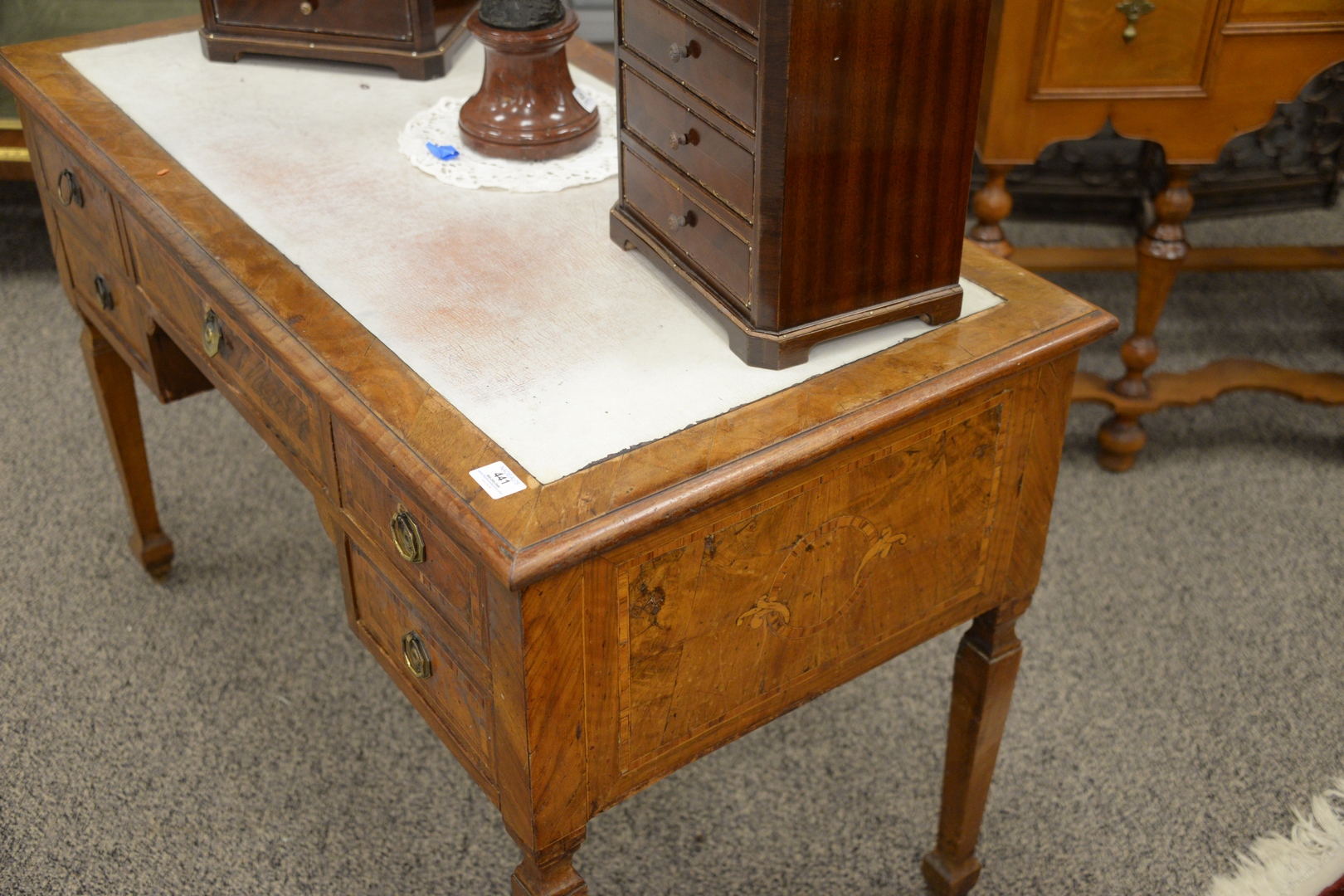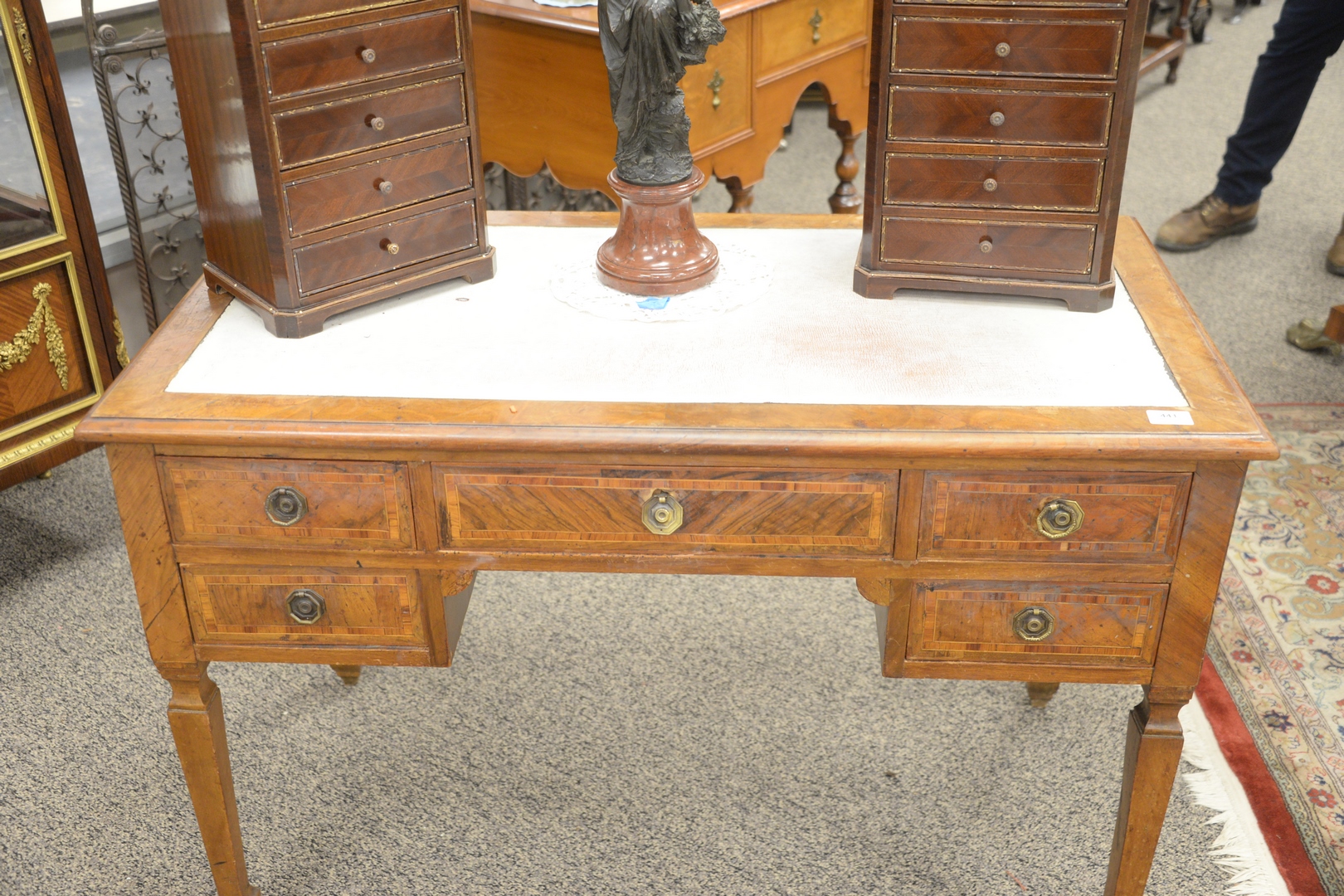 French Inlaid Desk, having leather top over banded inlaid drawers, height 30 inches, width 44 inches, depth 22 1/2 inches.