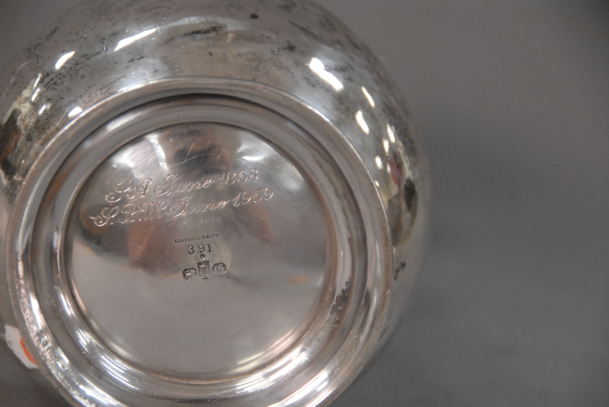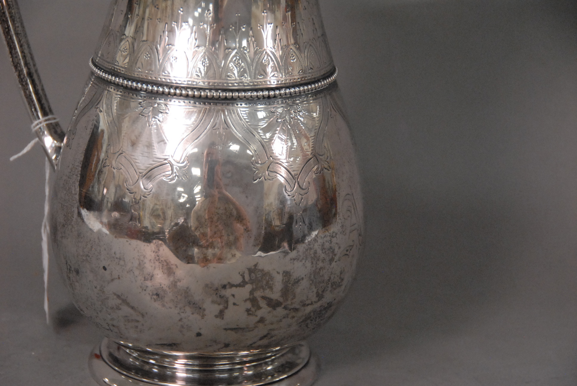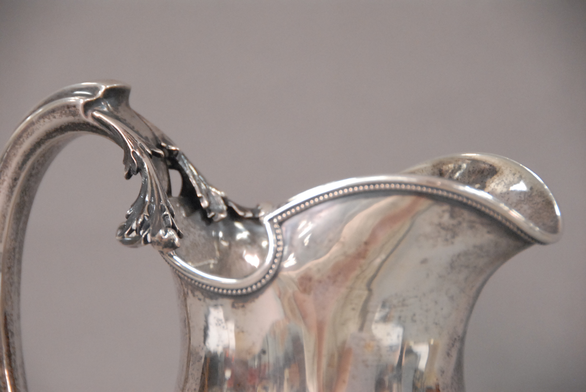 Gorham Victorian sterling silver pitcher with scroll handle, small dents, monogramed on bottom.