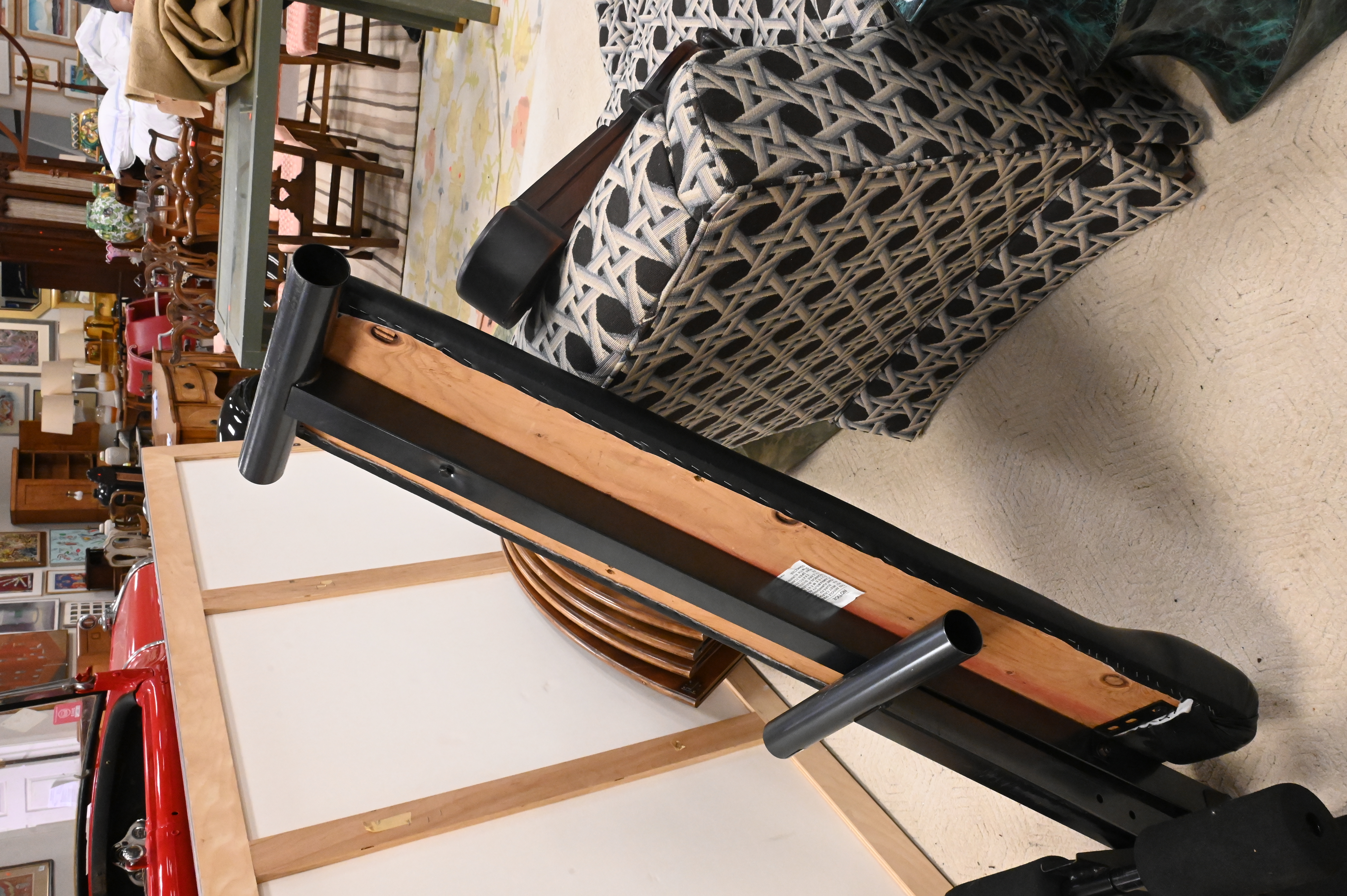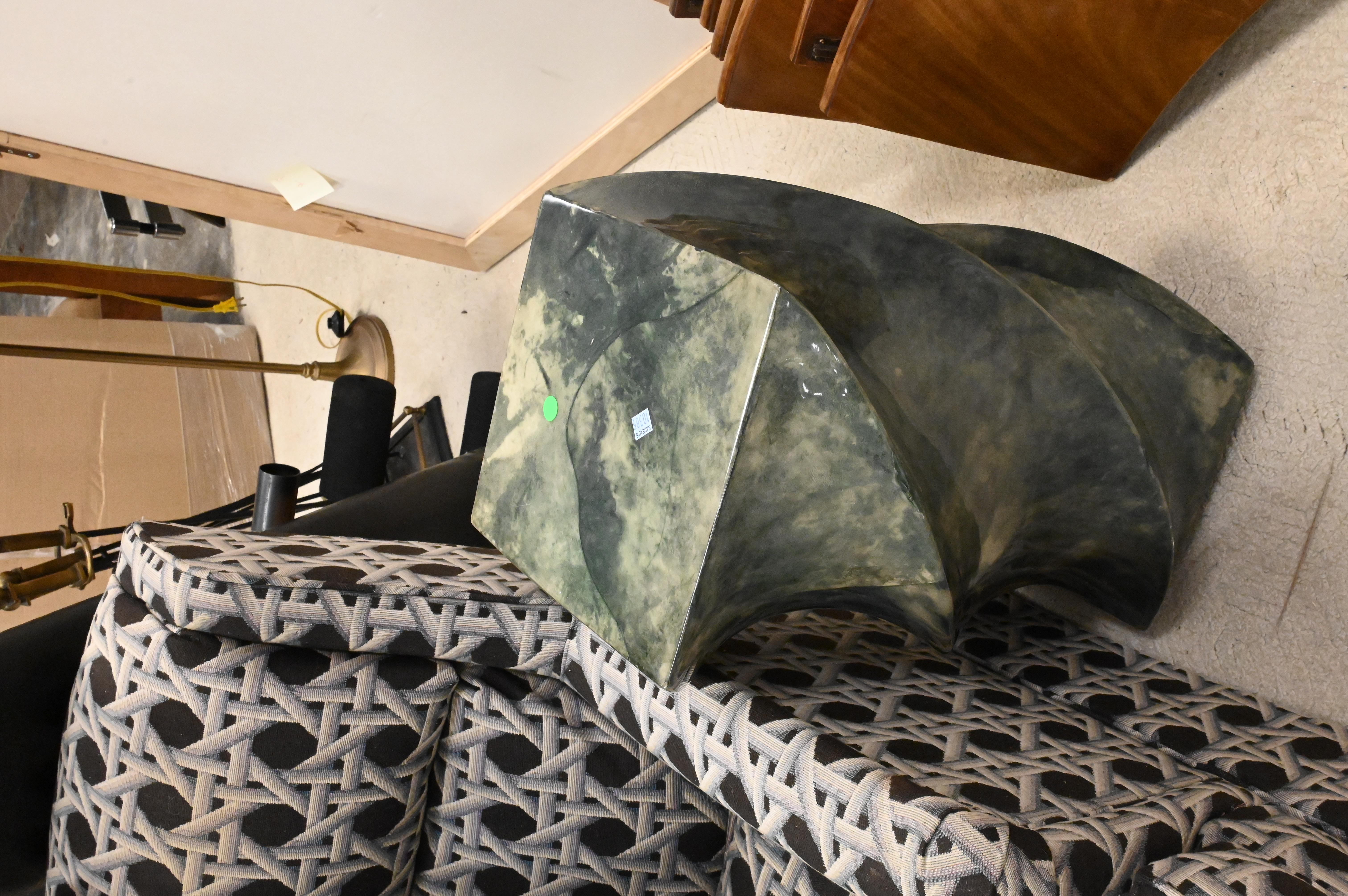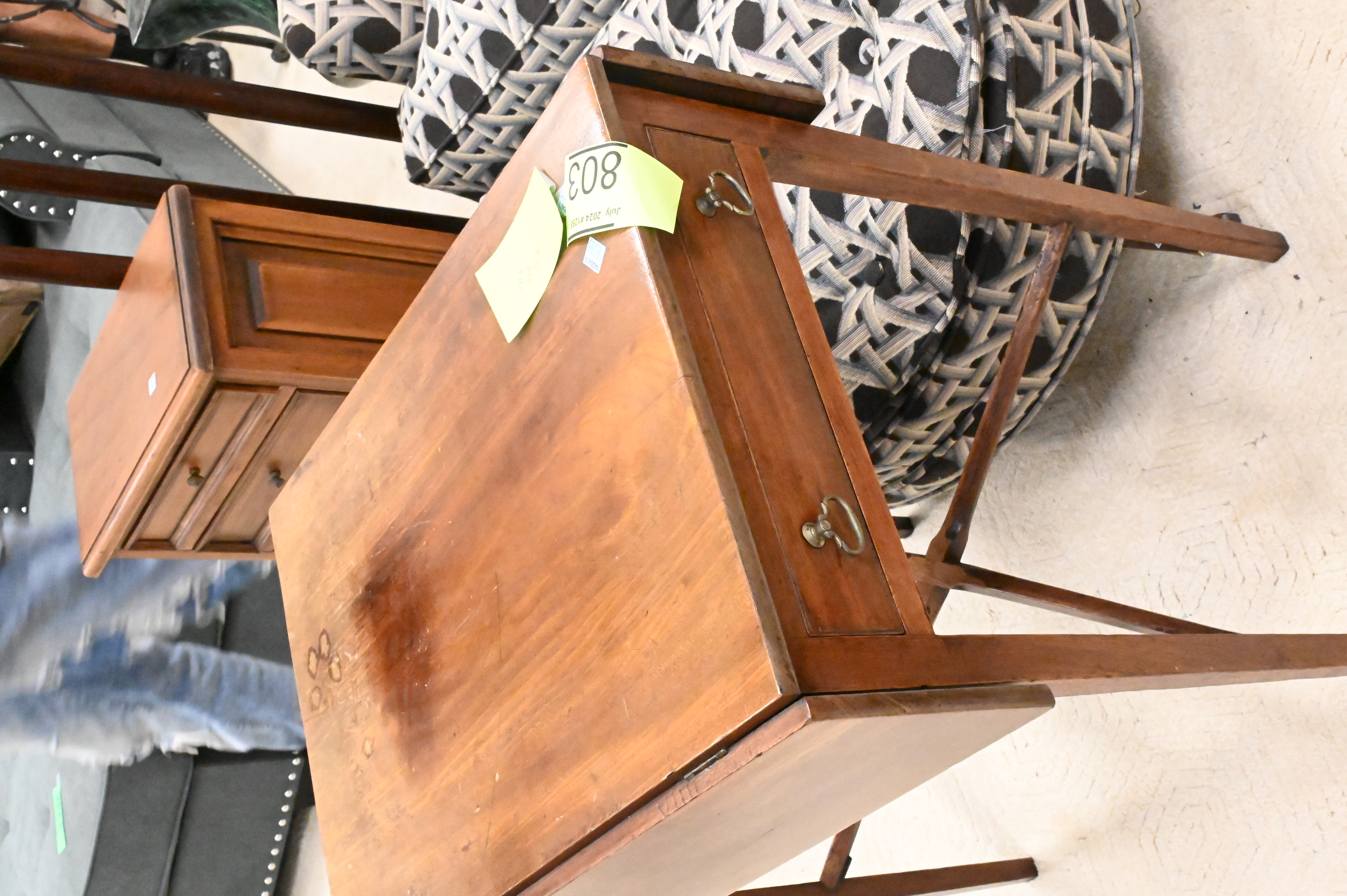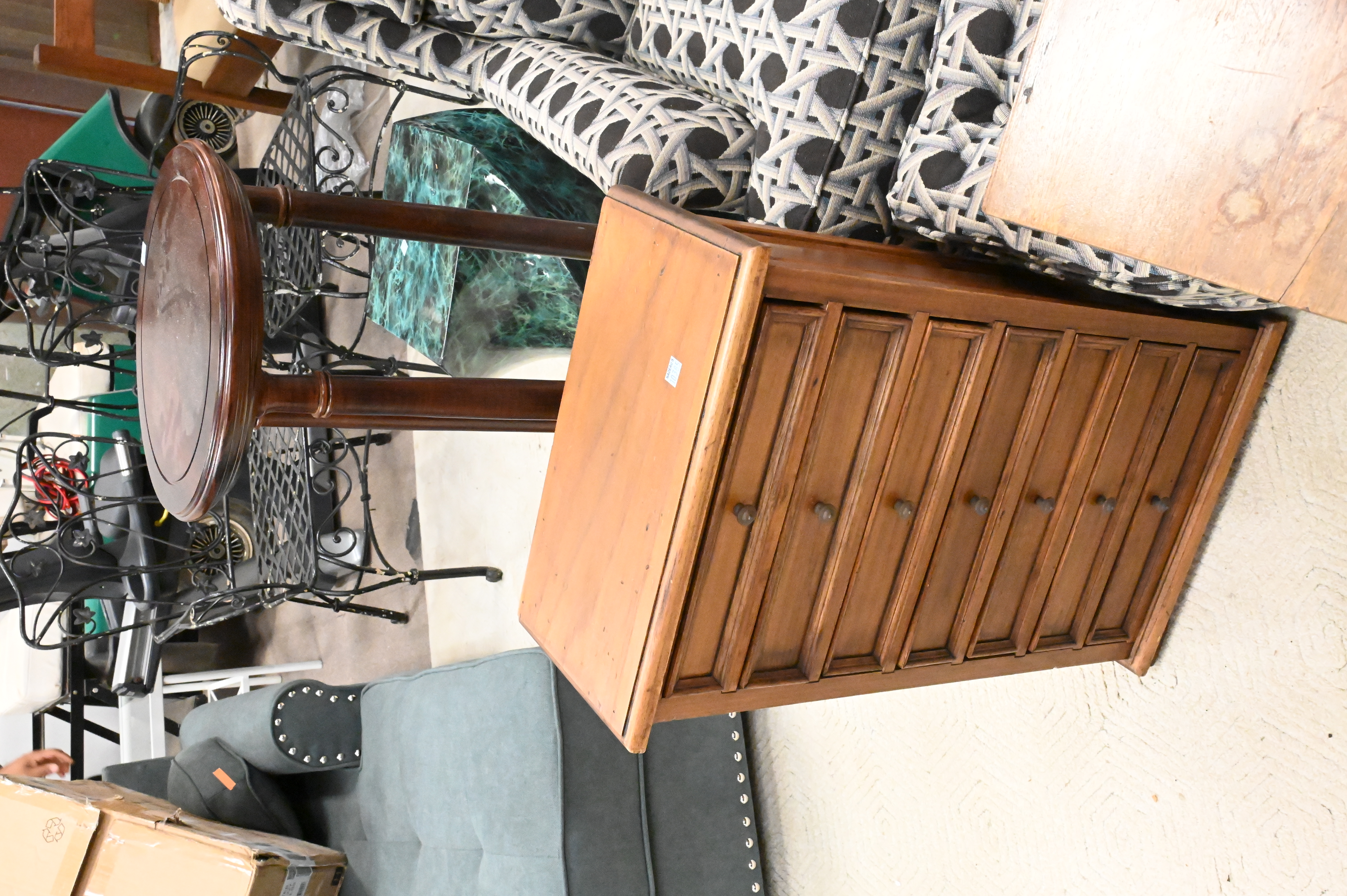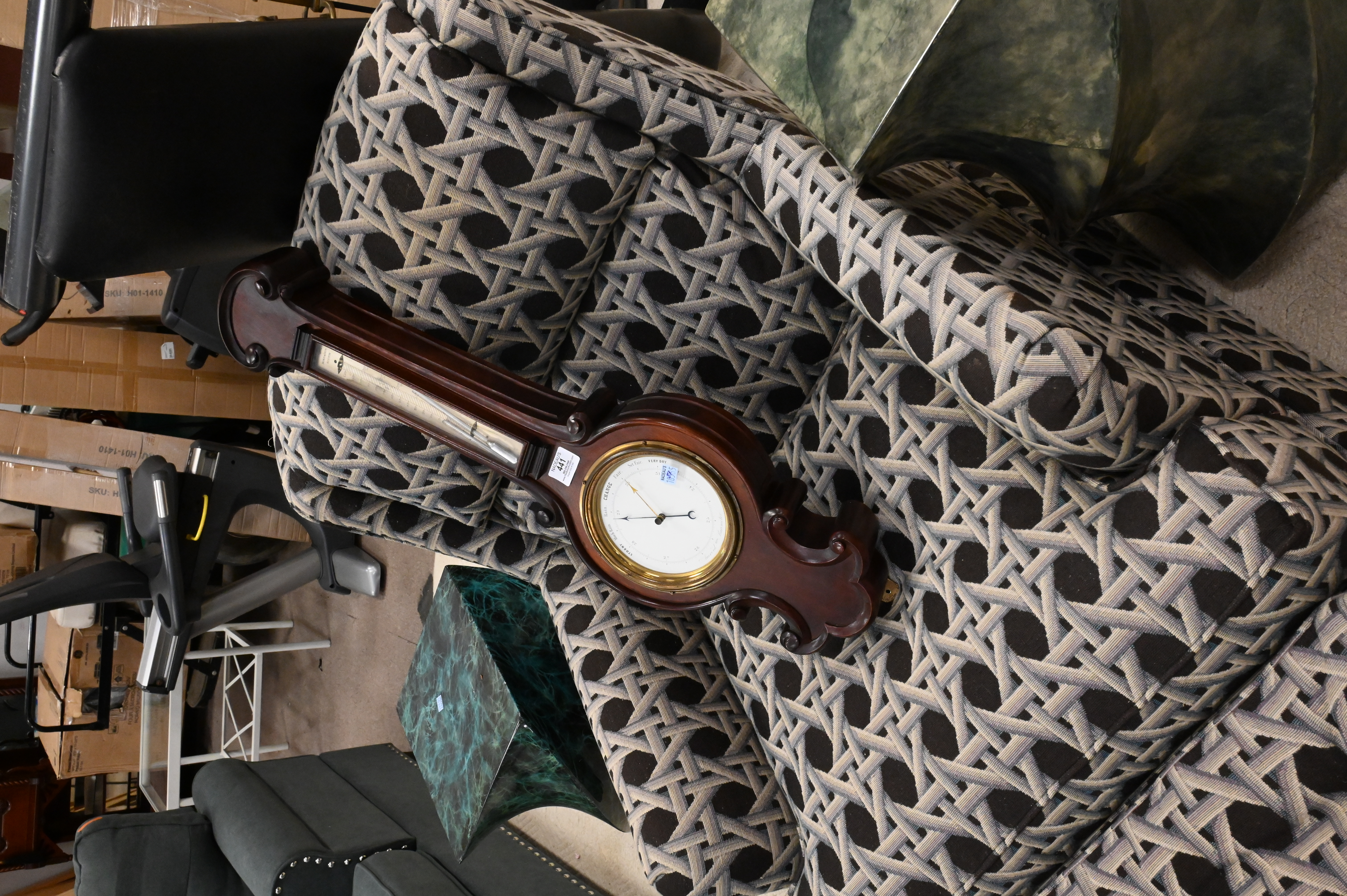 walnut barometer thermometer as is, upholstered easy chair with ottoman, pair of contemporary pedestals, fern stand, seven drawer cabinet, drop leaf table, and weight bench