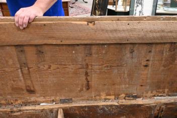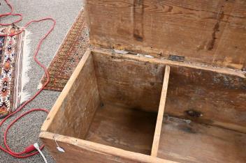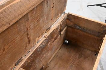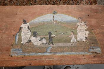 Lift Top Blanket Chest, retaining some red wash and center slave scene depicting plantation house, cabins, workers, fisherman and lady with fish; hard pine, no feet, hinges changed, circa 1760, probably southern, possibly painted at a later date, height 21 inches, top 21″ x 50″.