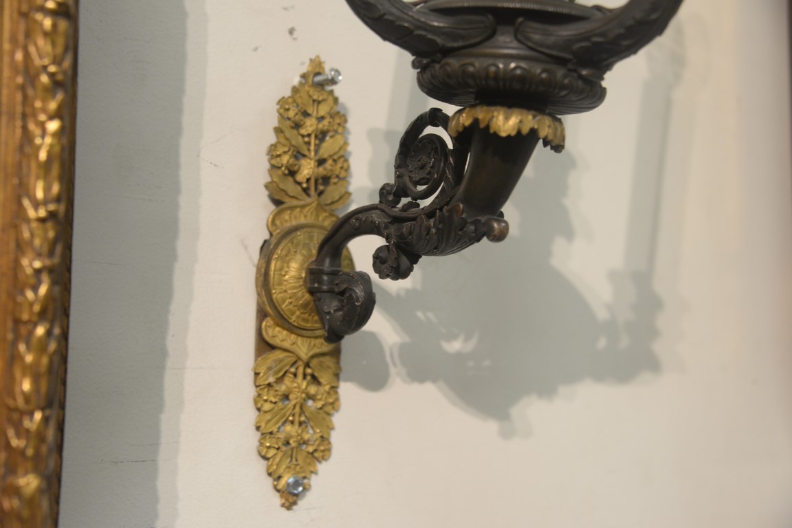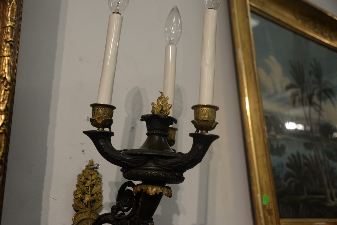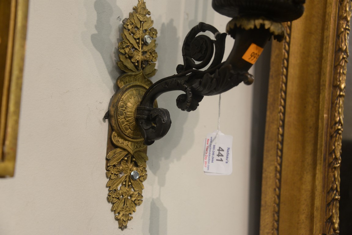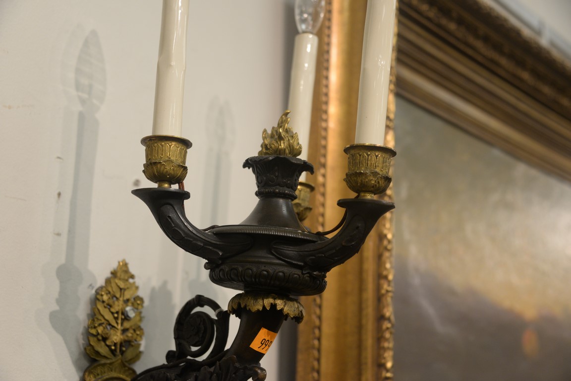 Lot 441: Pair of French Empire gilt and patinated bronze three light sconces having foliate back plate with single arm extending to an oil st…