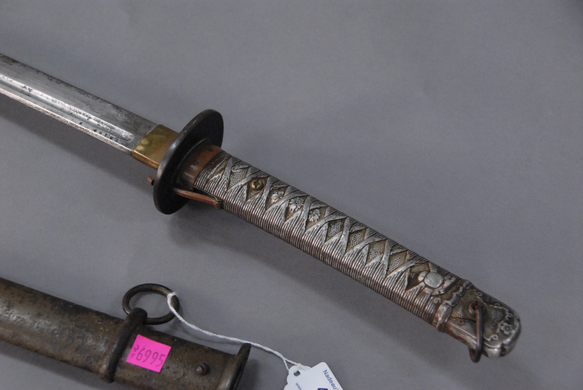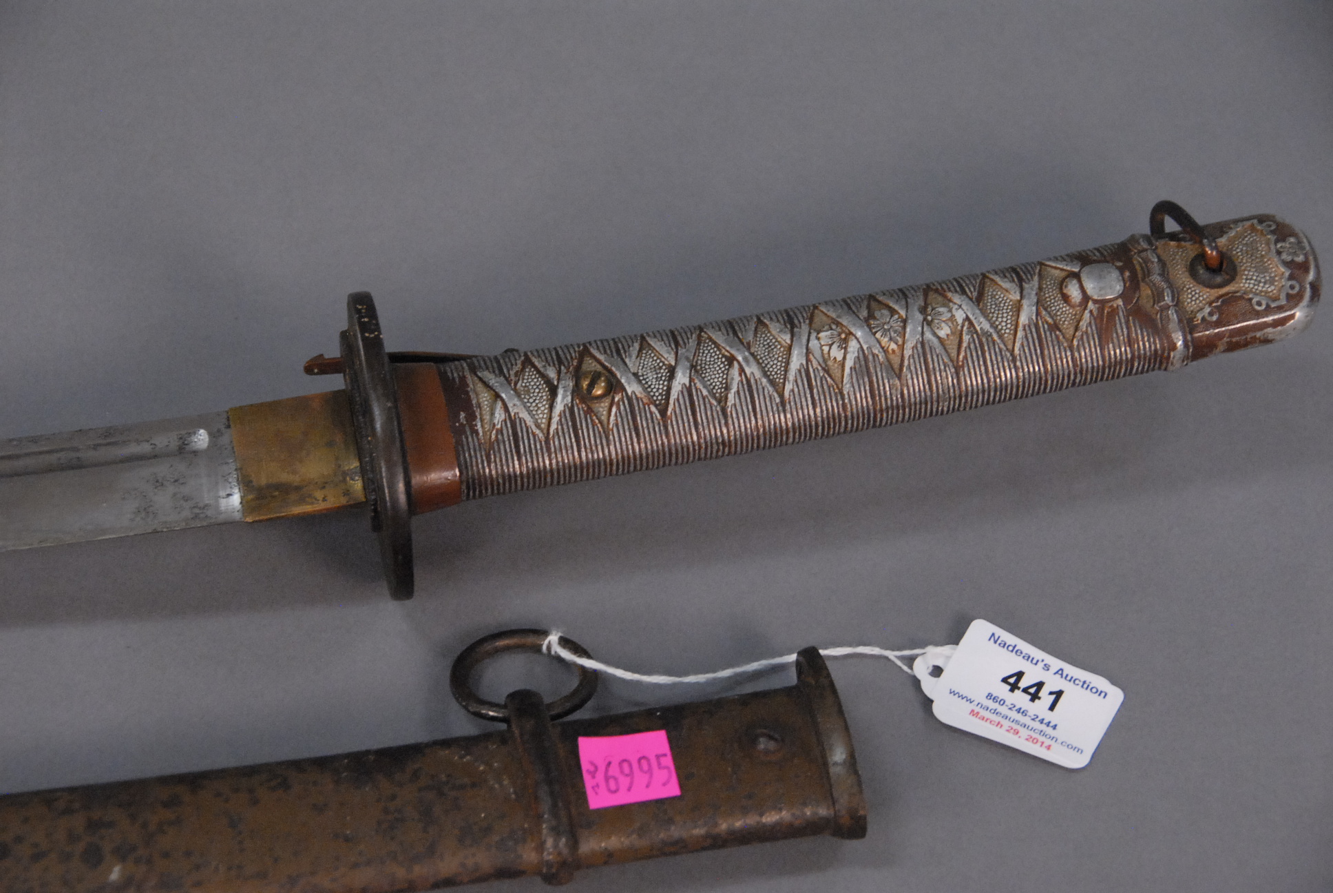 Lot 441: Samurai/Military Sword scabbard, samegawa hilt and three-cluster floral menuki, Japan, Taisho/Showa corrosion to blade. lg. 28in.