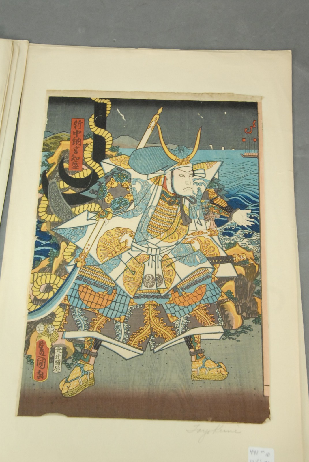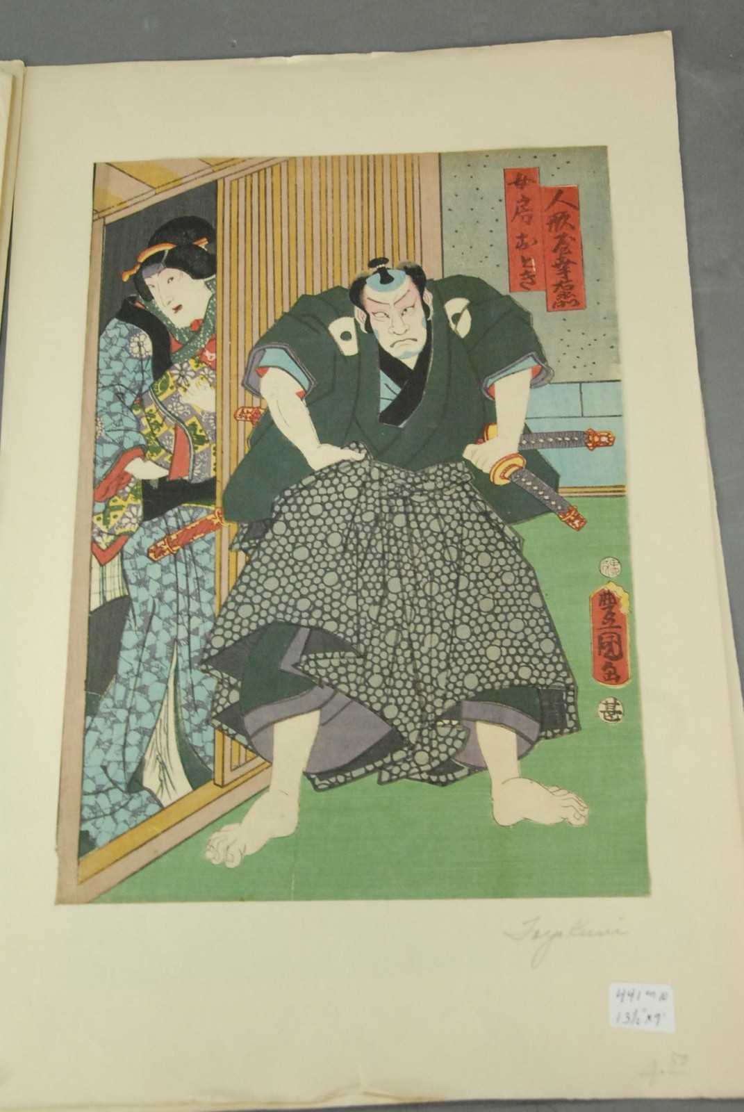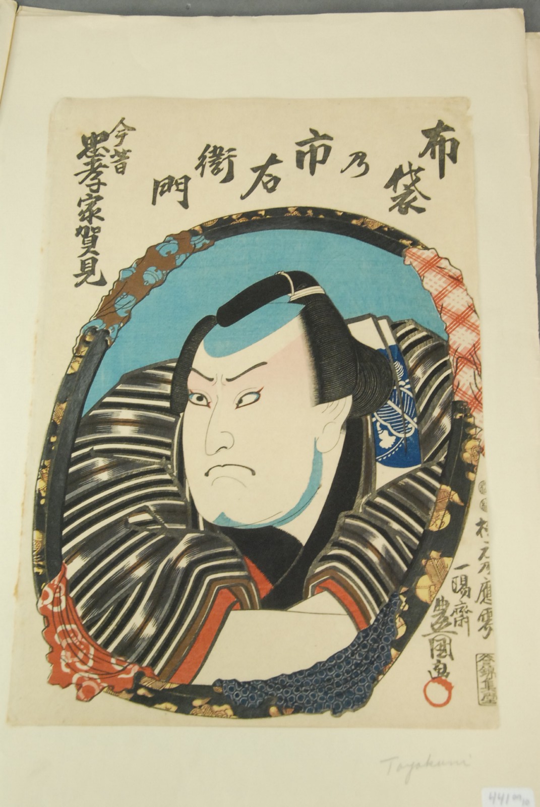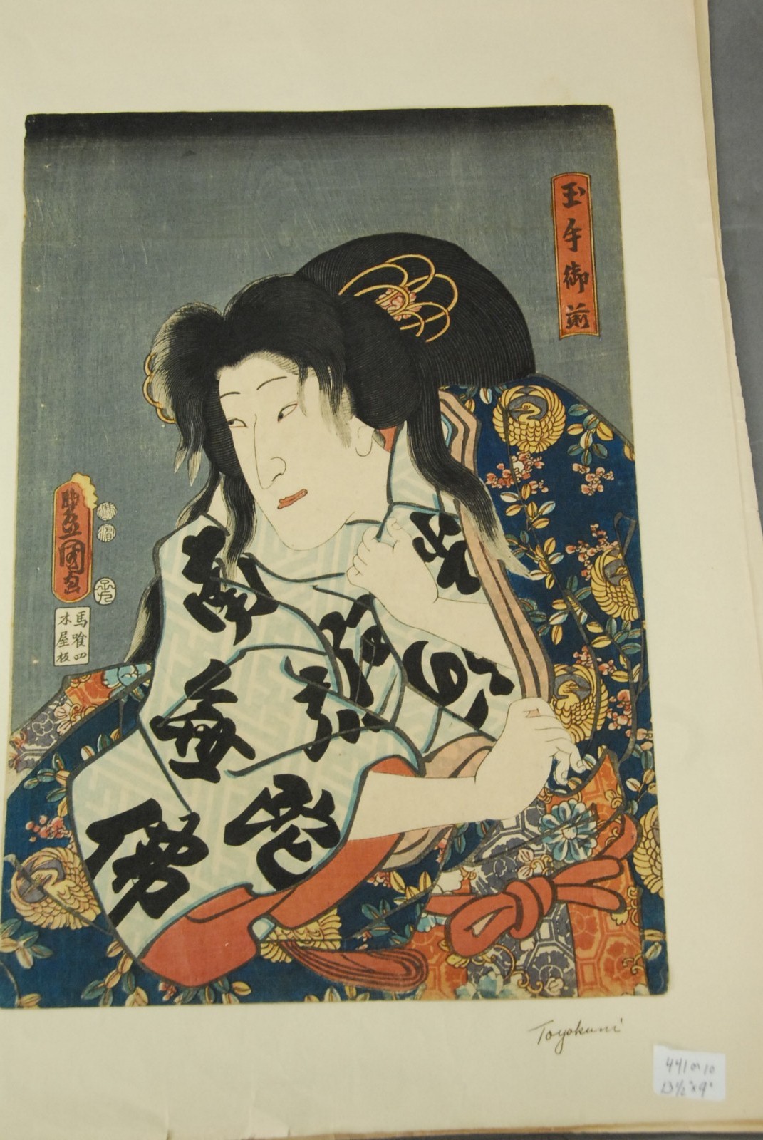 Ten Japanese woodblock prints, pencil signed Toyokuni.