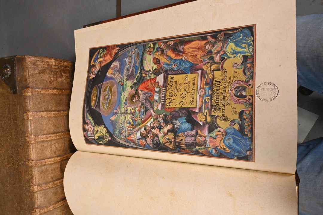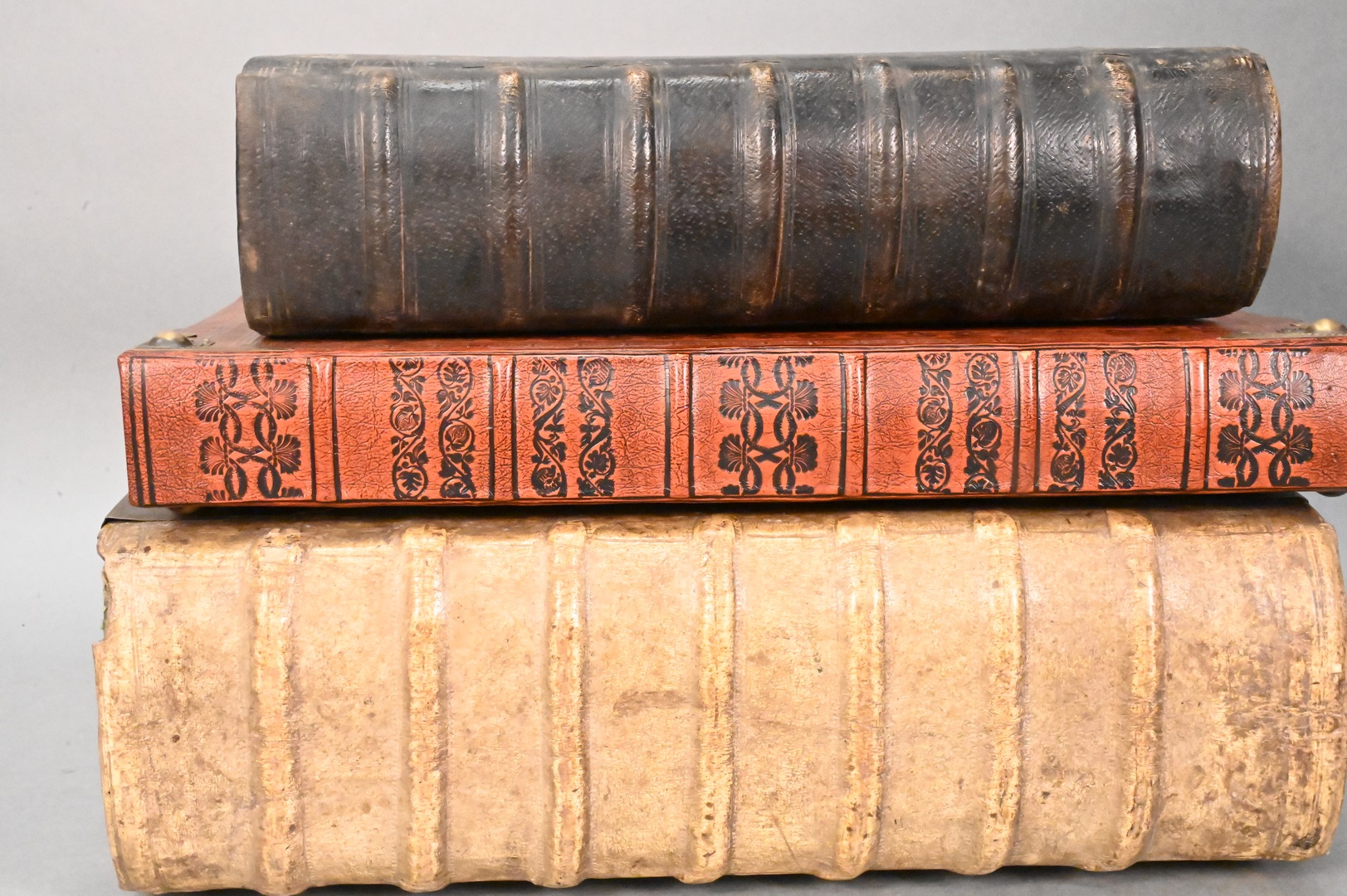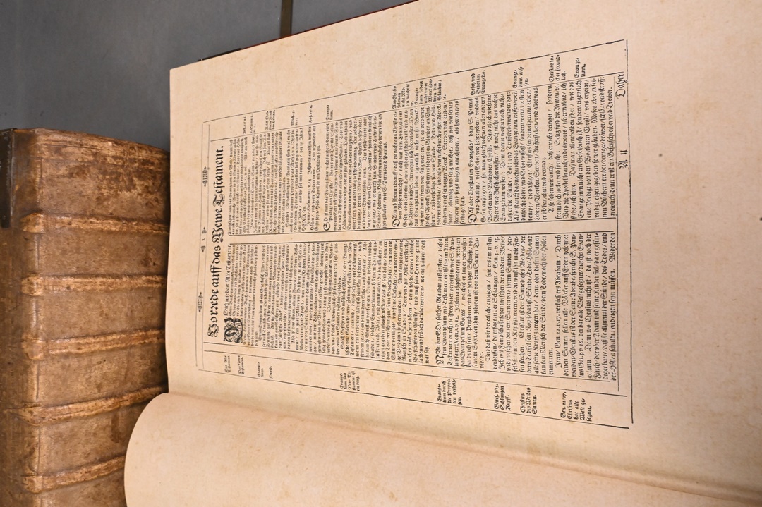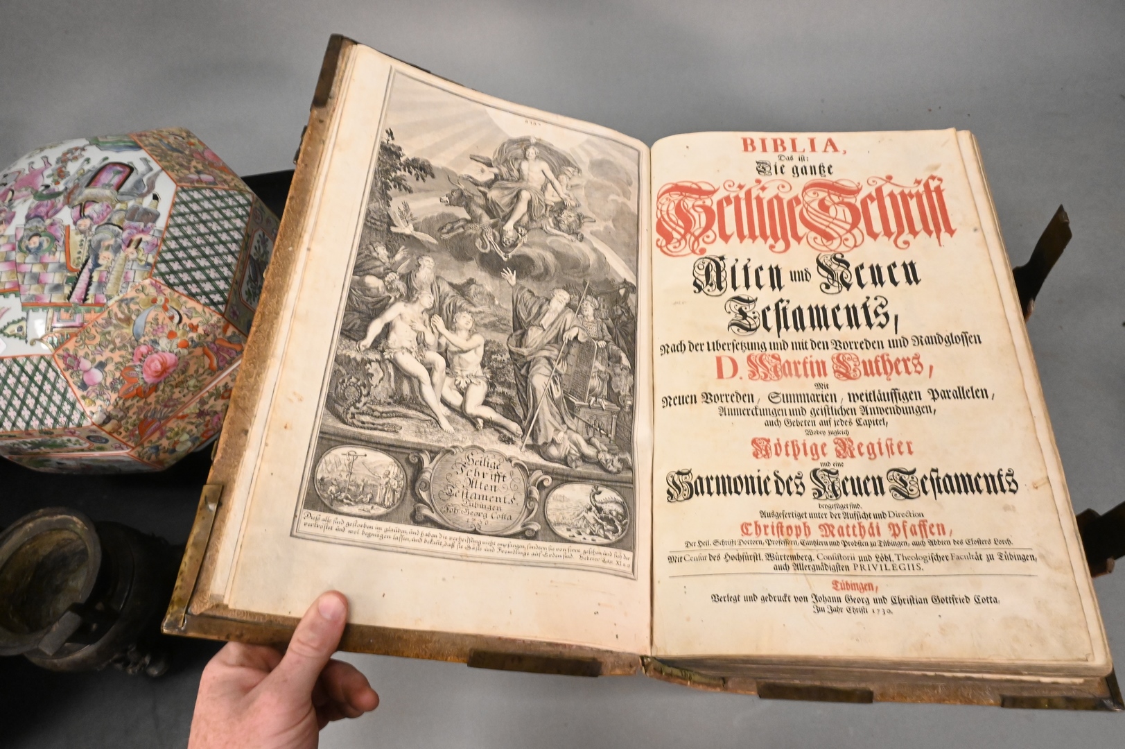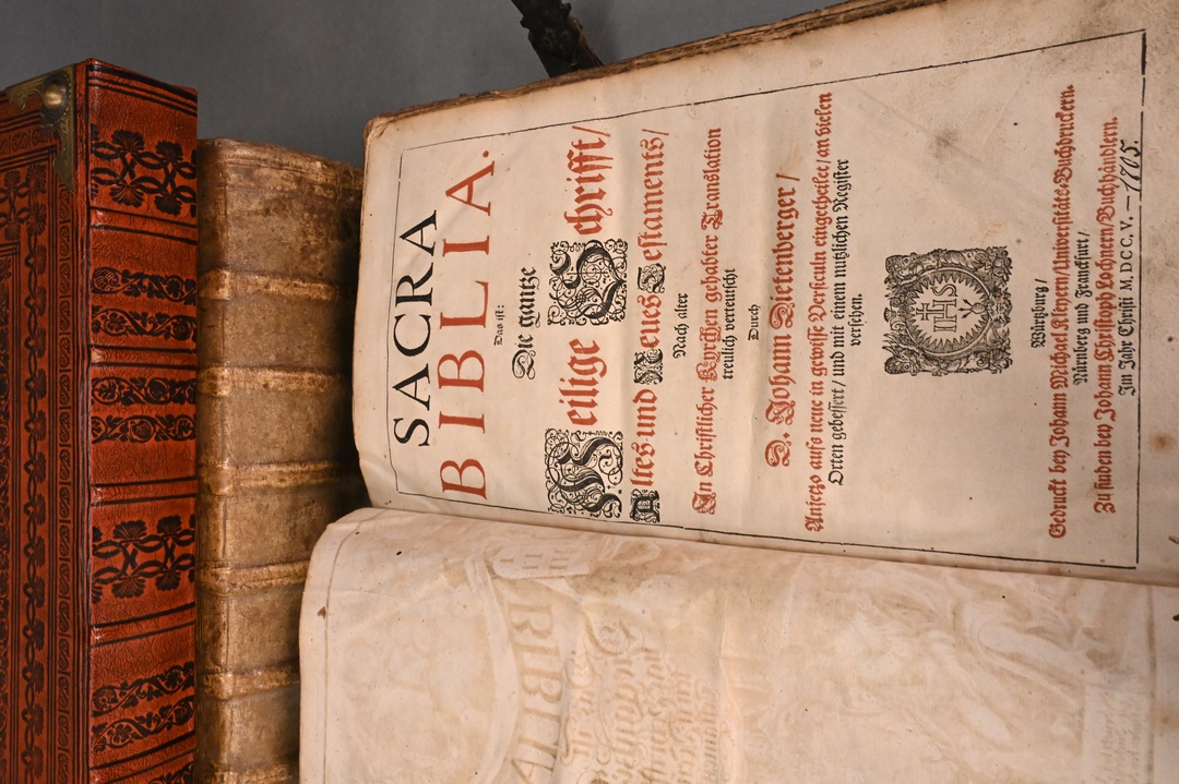 Three Leatherbound Bibles, to include Elaborate Replica, 1830, German bible; Wurzburg bible, 1705; align with a German bible, 1730.