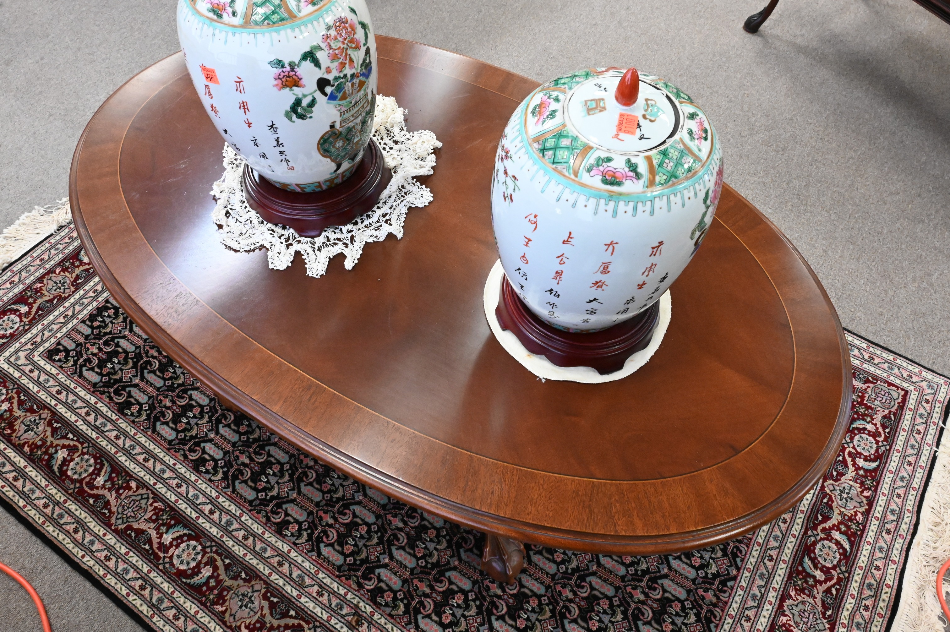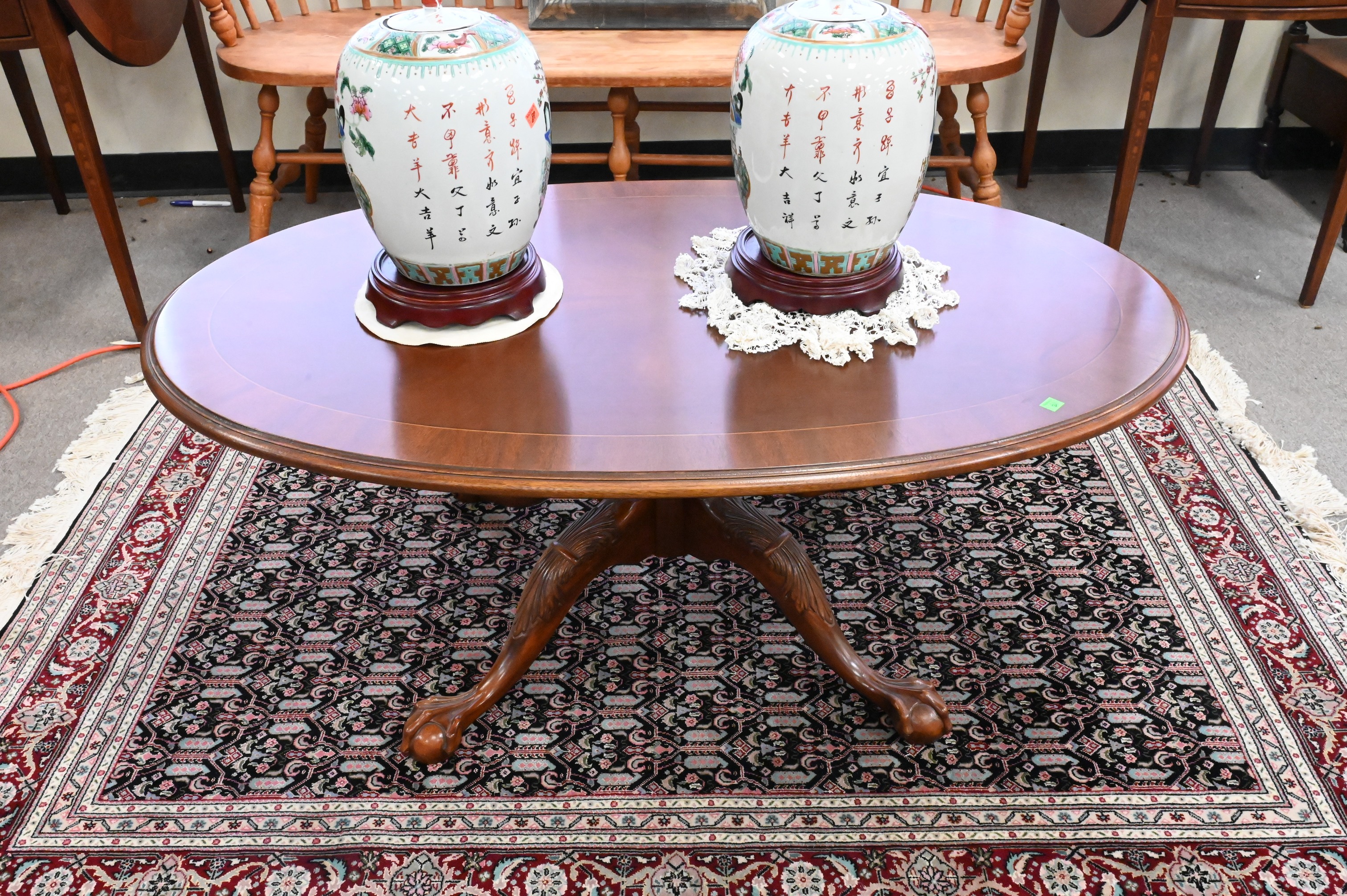 to include Ethan Allen pair of demilune tables and oval coffee table having ball and claw feet