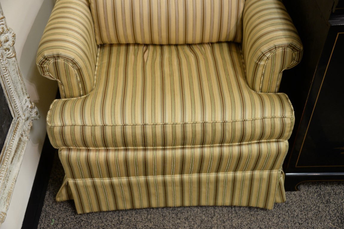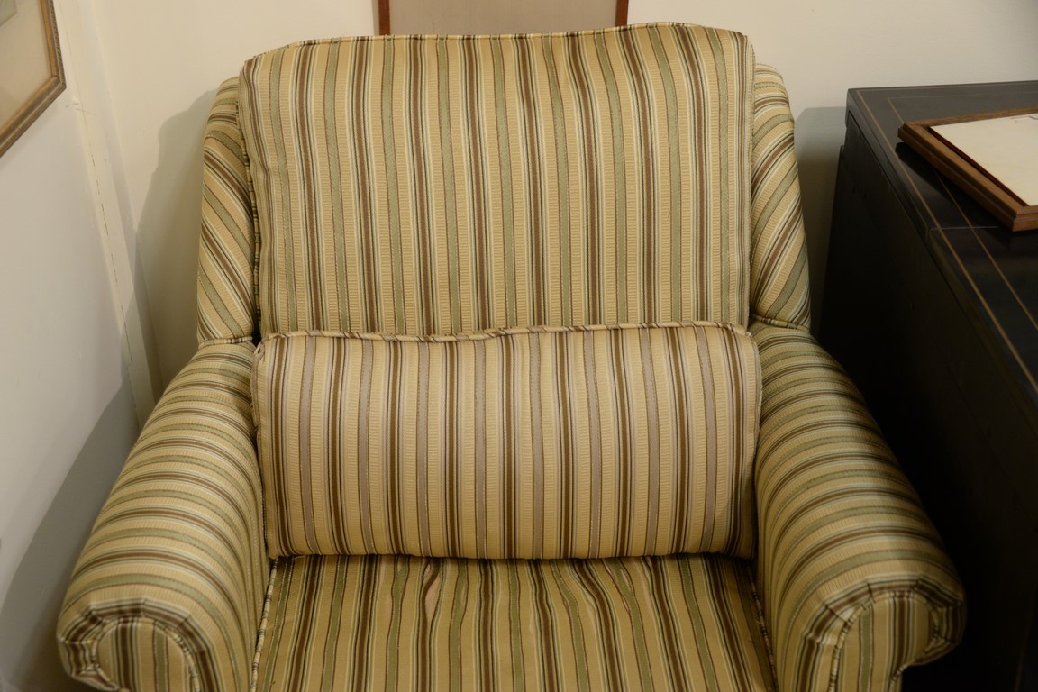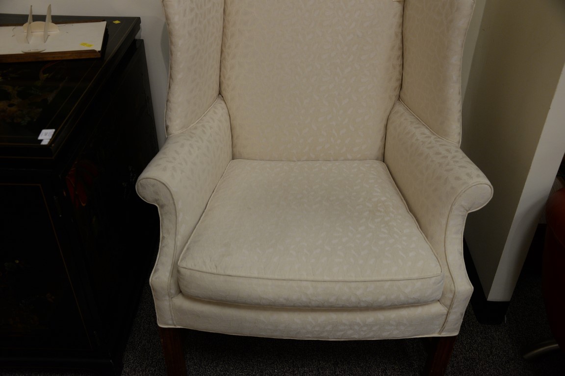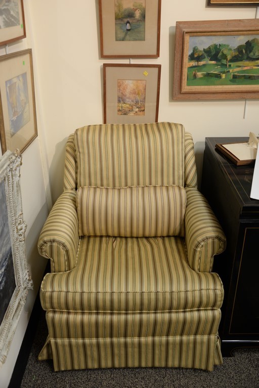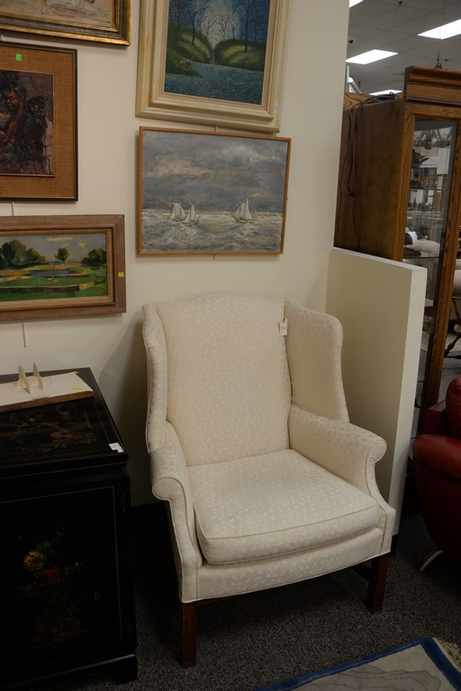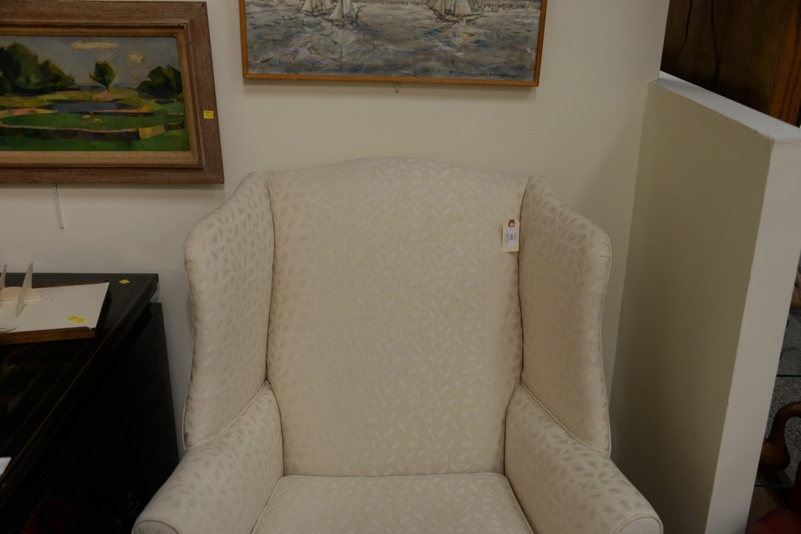 Two upholstered living room chairs including a white wing chair and a striped upholstered chair.