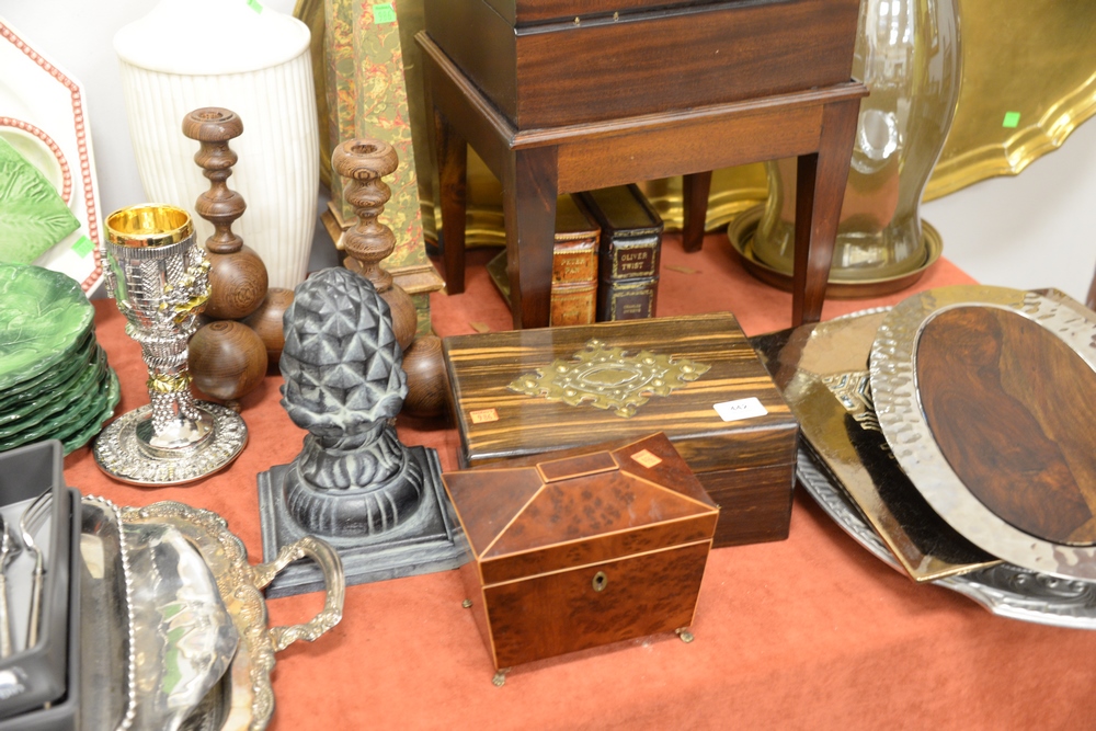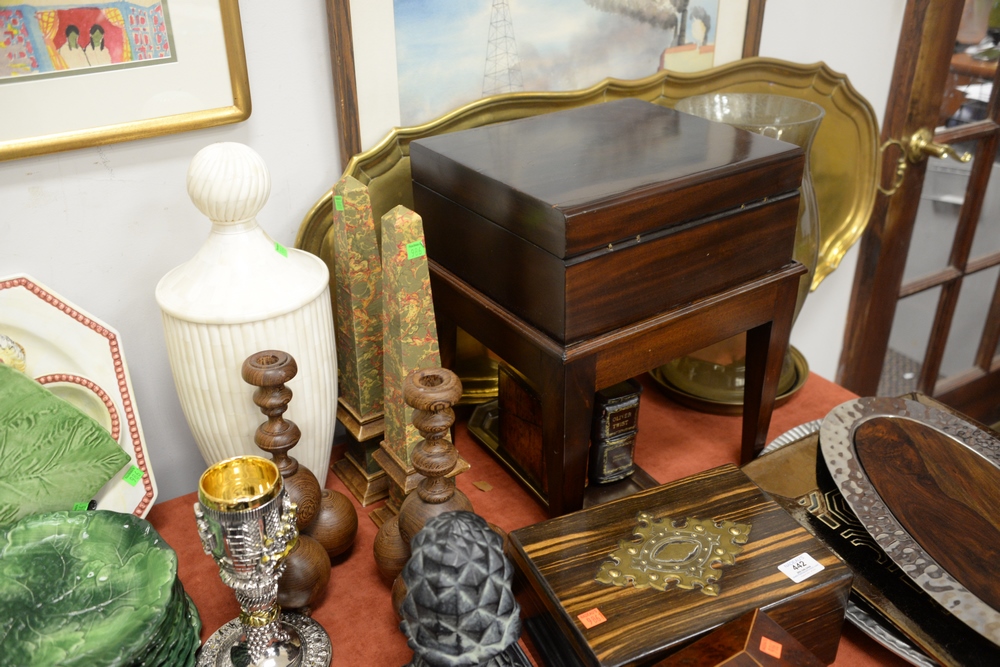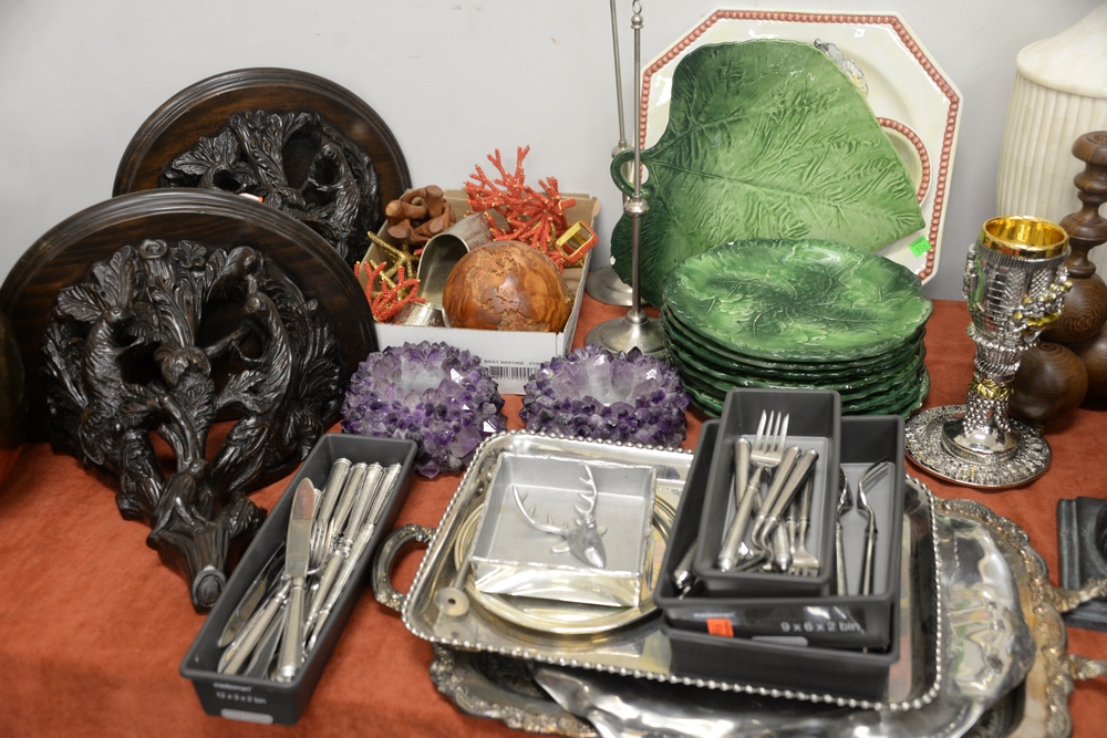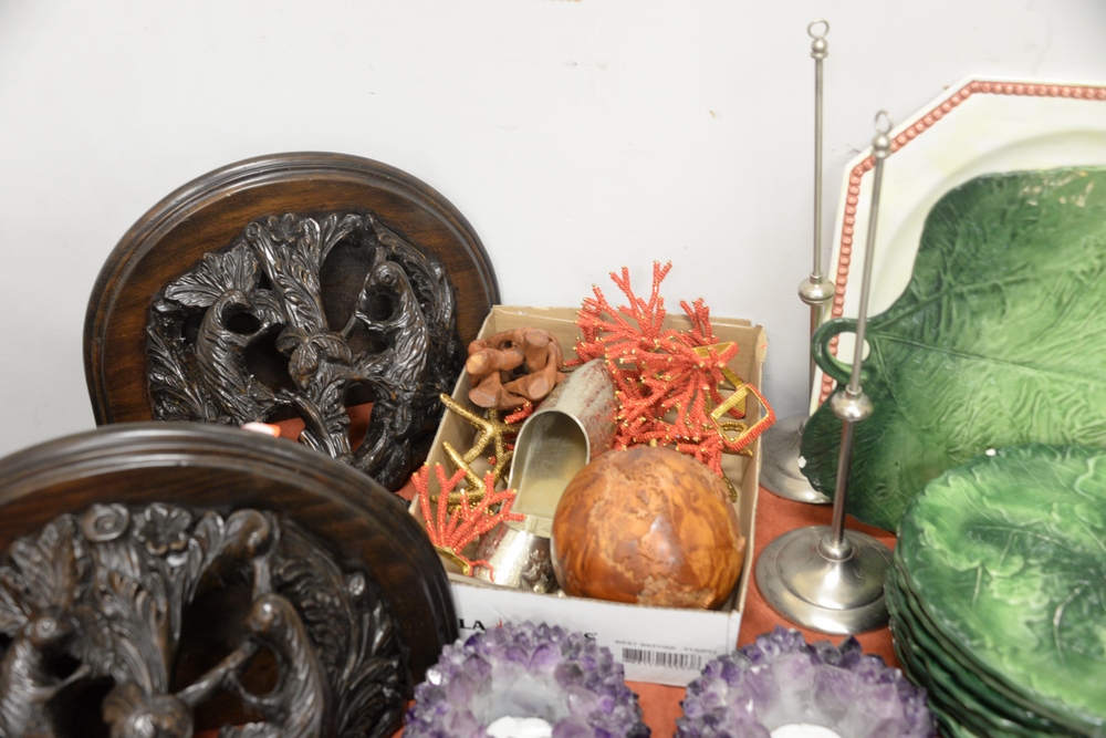 Lot 442: A Large Table Lot of Decorative Items, to include two amethyst candle holders, eight cabbage leaf dinner plates, several trays, two …