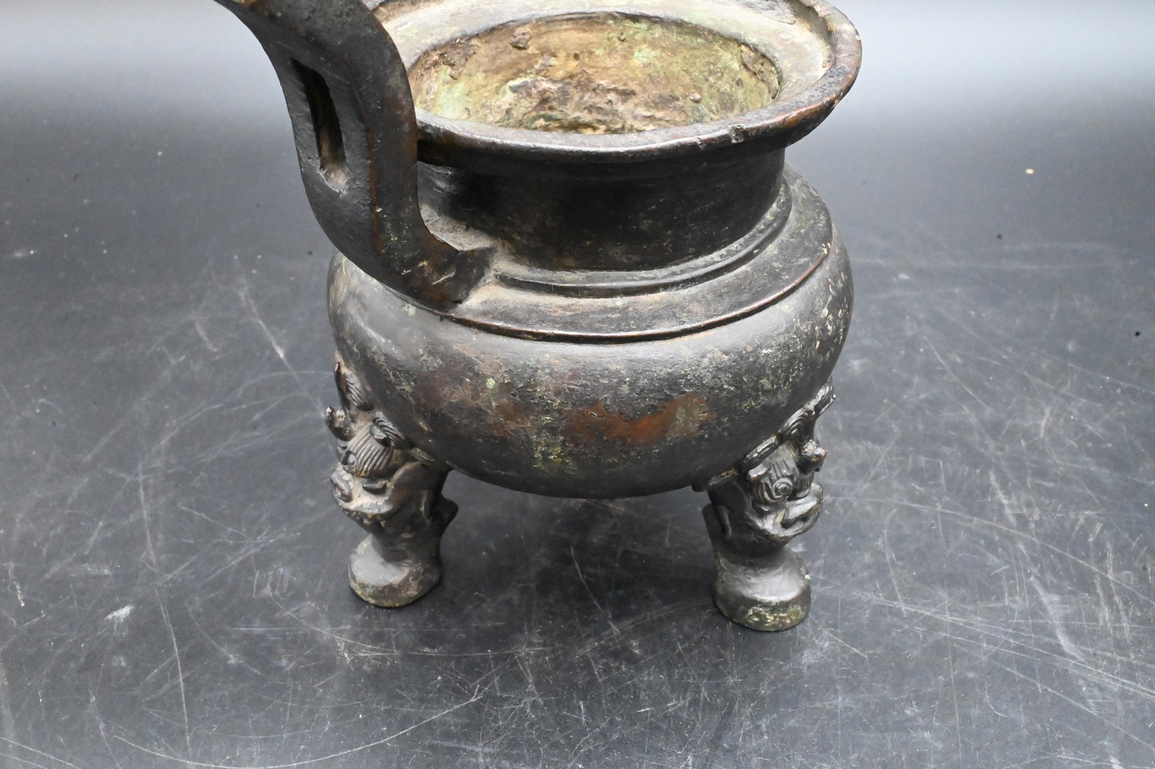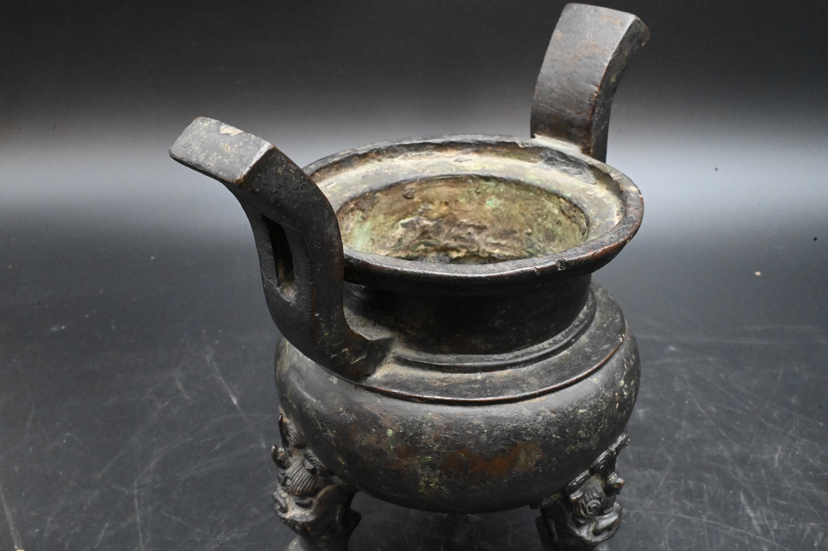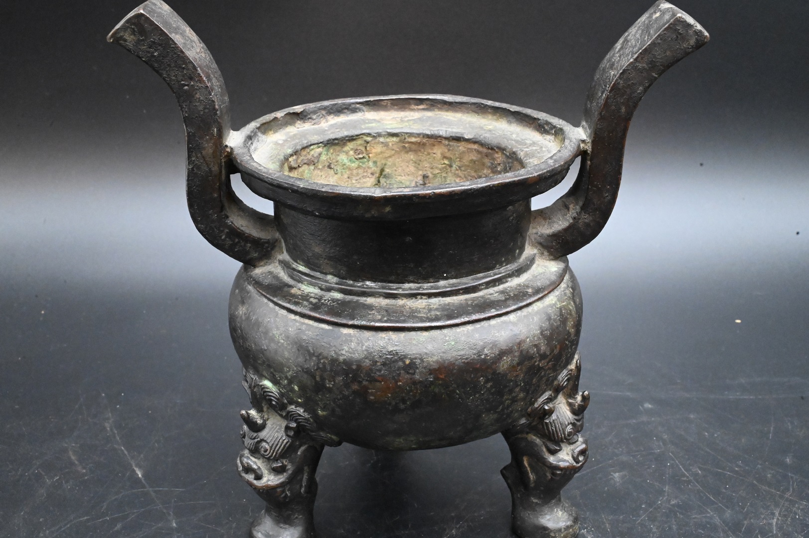 Bronze Censer in the form of a Ding, Chinese, Ming Dynasty, (14th/18th century or later), bulbous tripod body having bold flaring handles sits atop three zoomorphic _____________, height 7 inches.