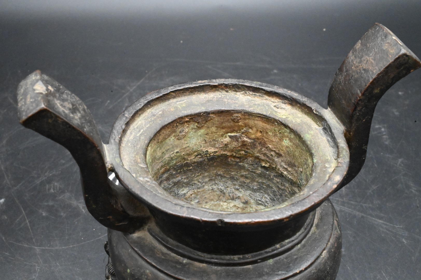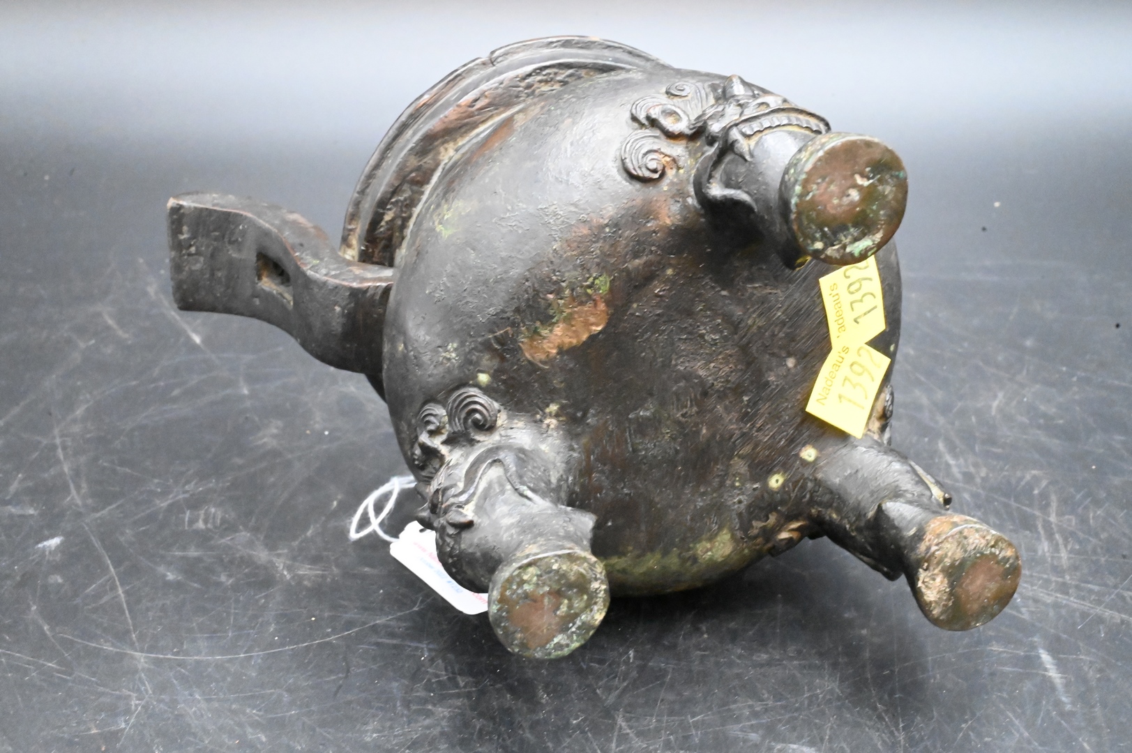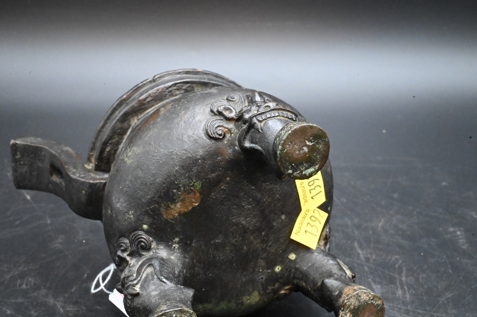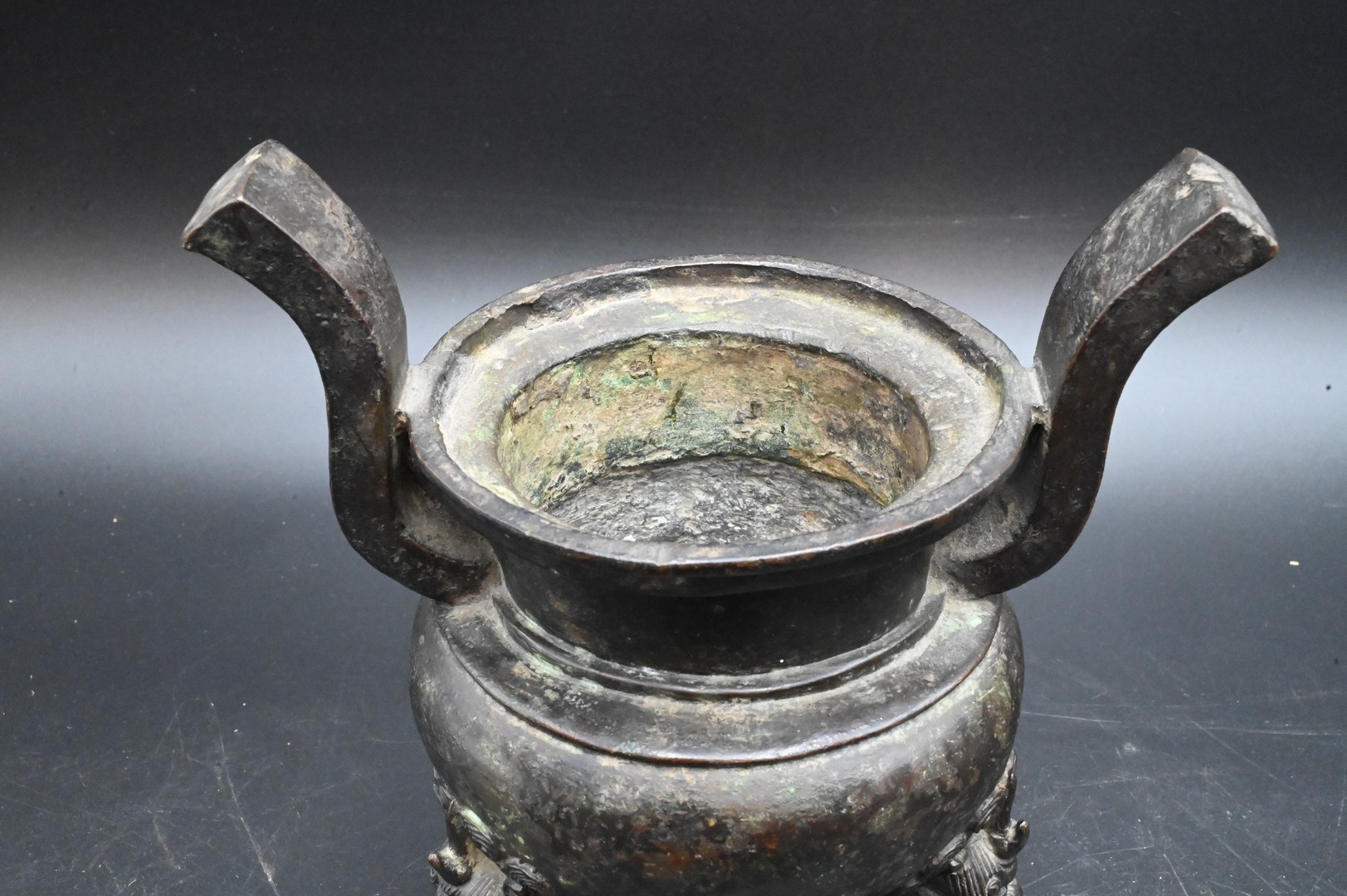 Bronze Censer in the form of a Ding, Chinese, Ming Dynasty, (14th/18th century or later), bulbous tripod body having bold flaring handles sits atop three zoomorphic _____________, height 7 inches.