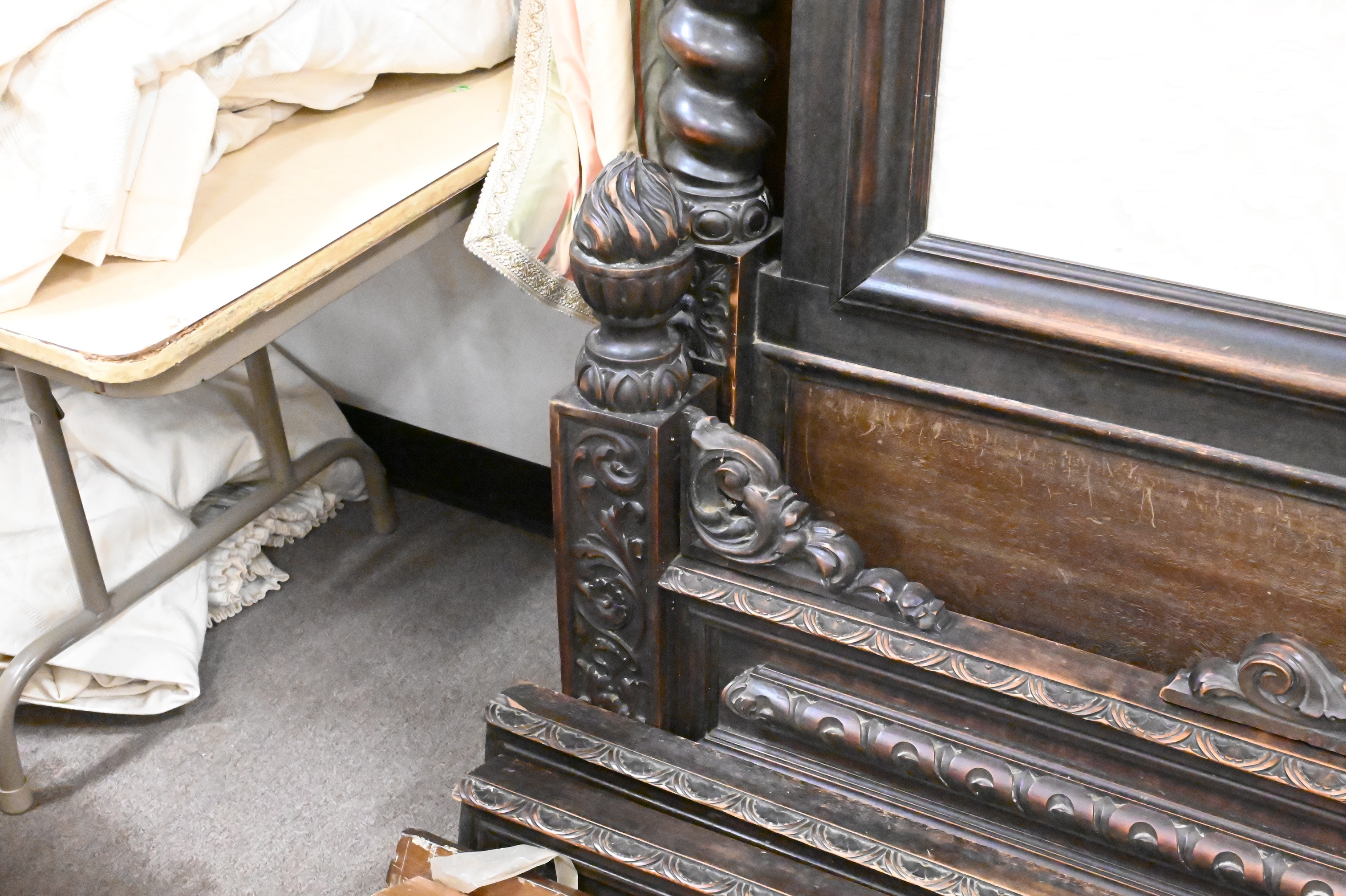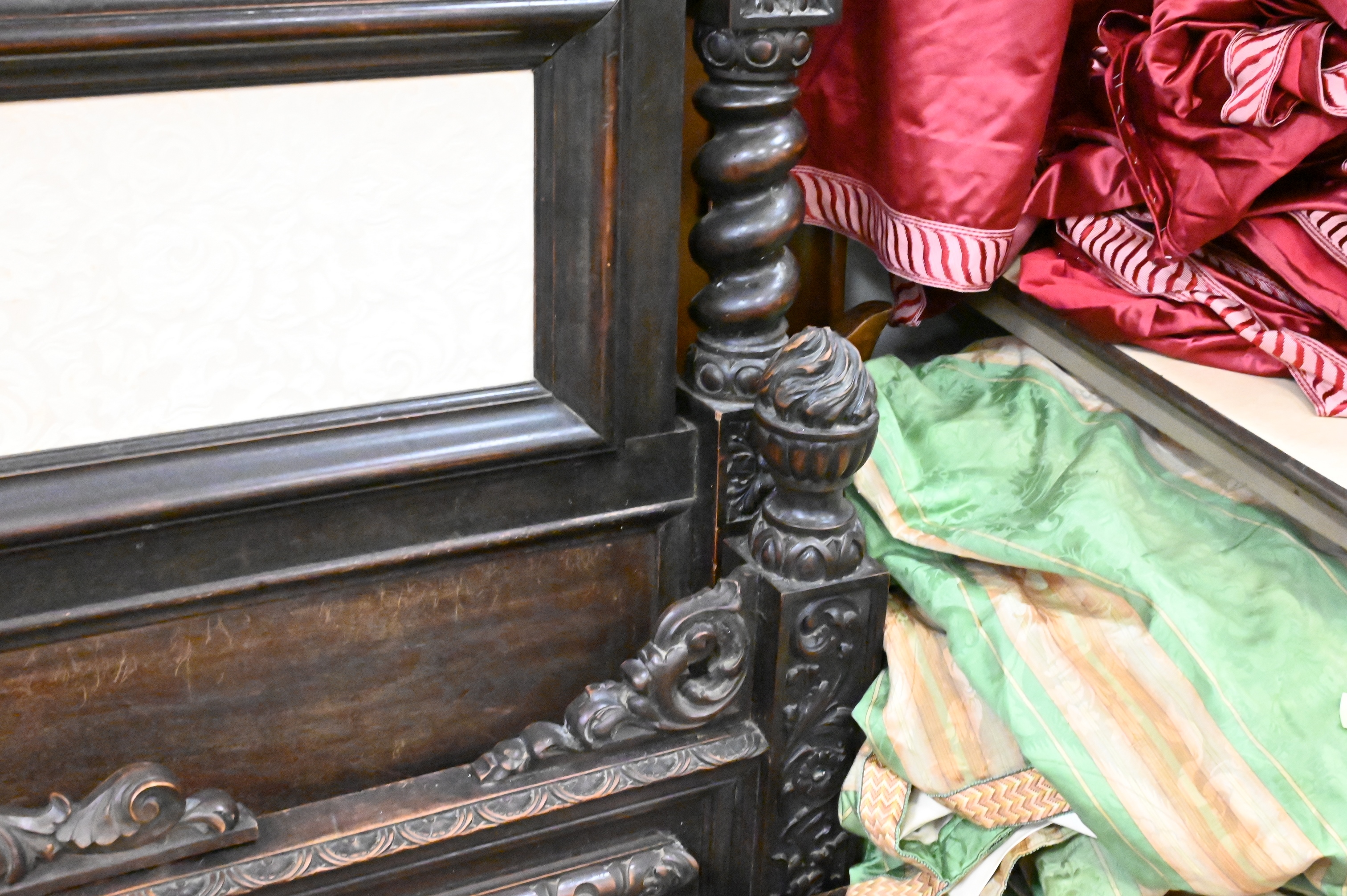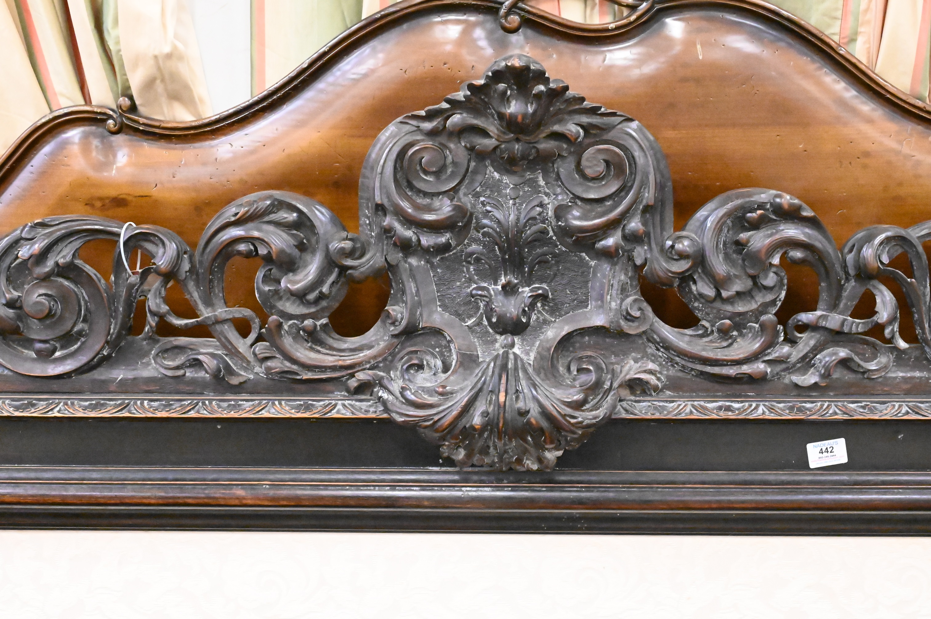 Custom Walnut Bed, having carved and paneled headboard, height 56 inches, inner dimensions 69″ x 79″; along with a French style king size bed.