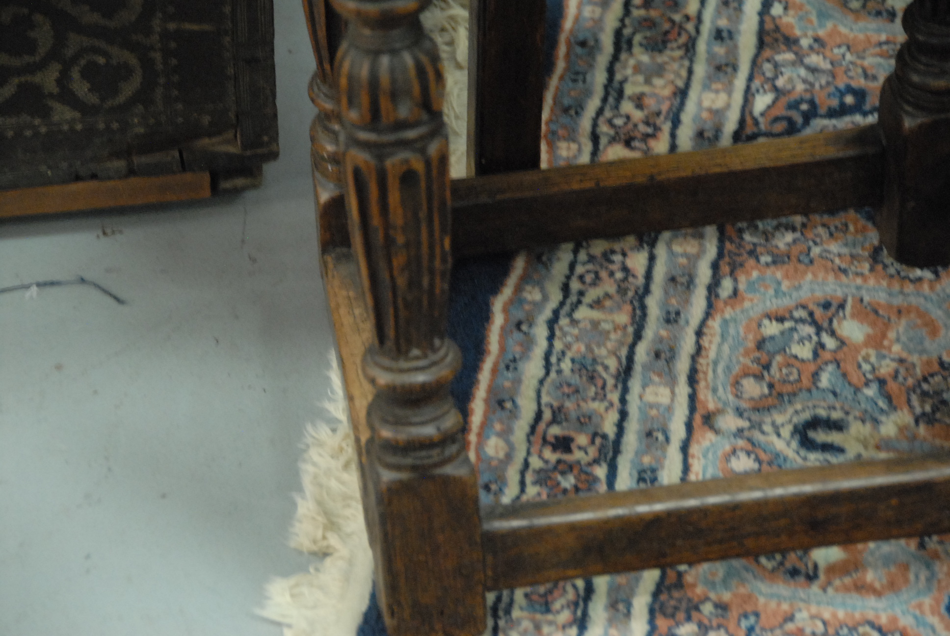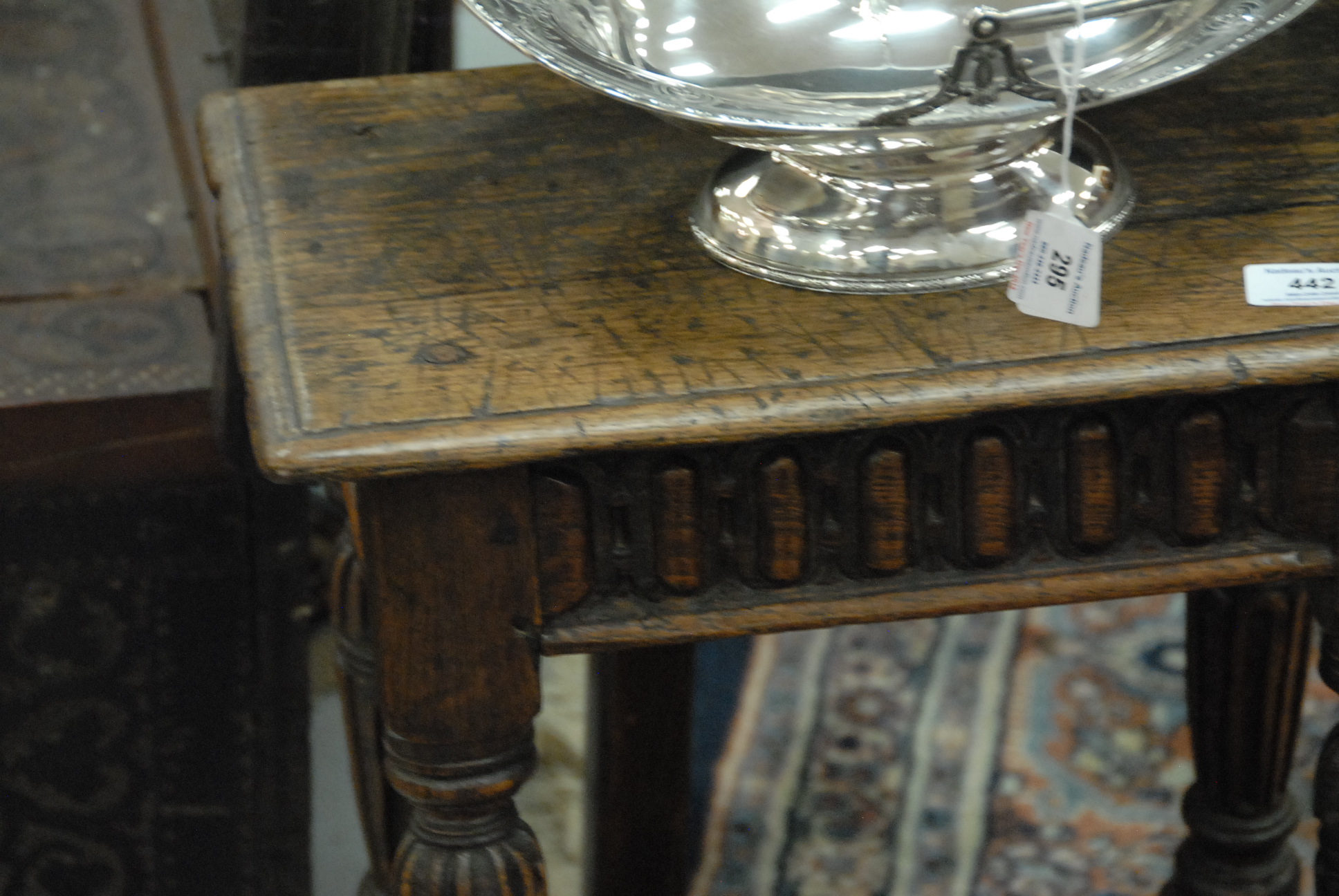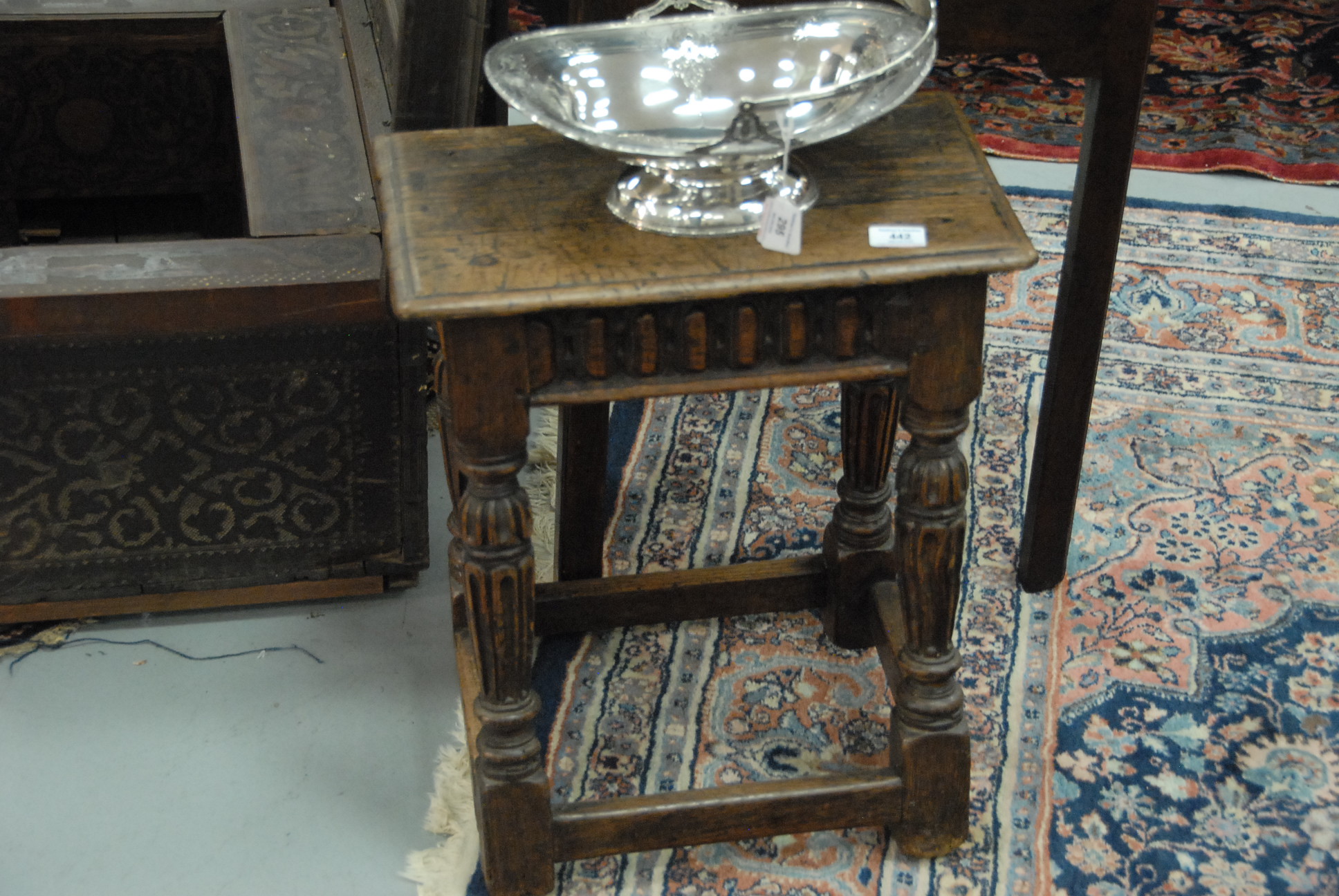 Lot 442: Jacobean oak joint stool with rectangular top over carved skirt having carved and turned legs with box stretcher. ht. 20 1/2in. top: 11 x 17 1/2